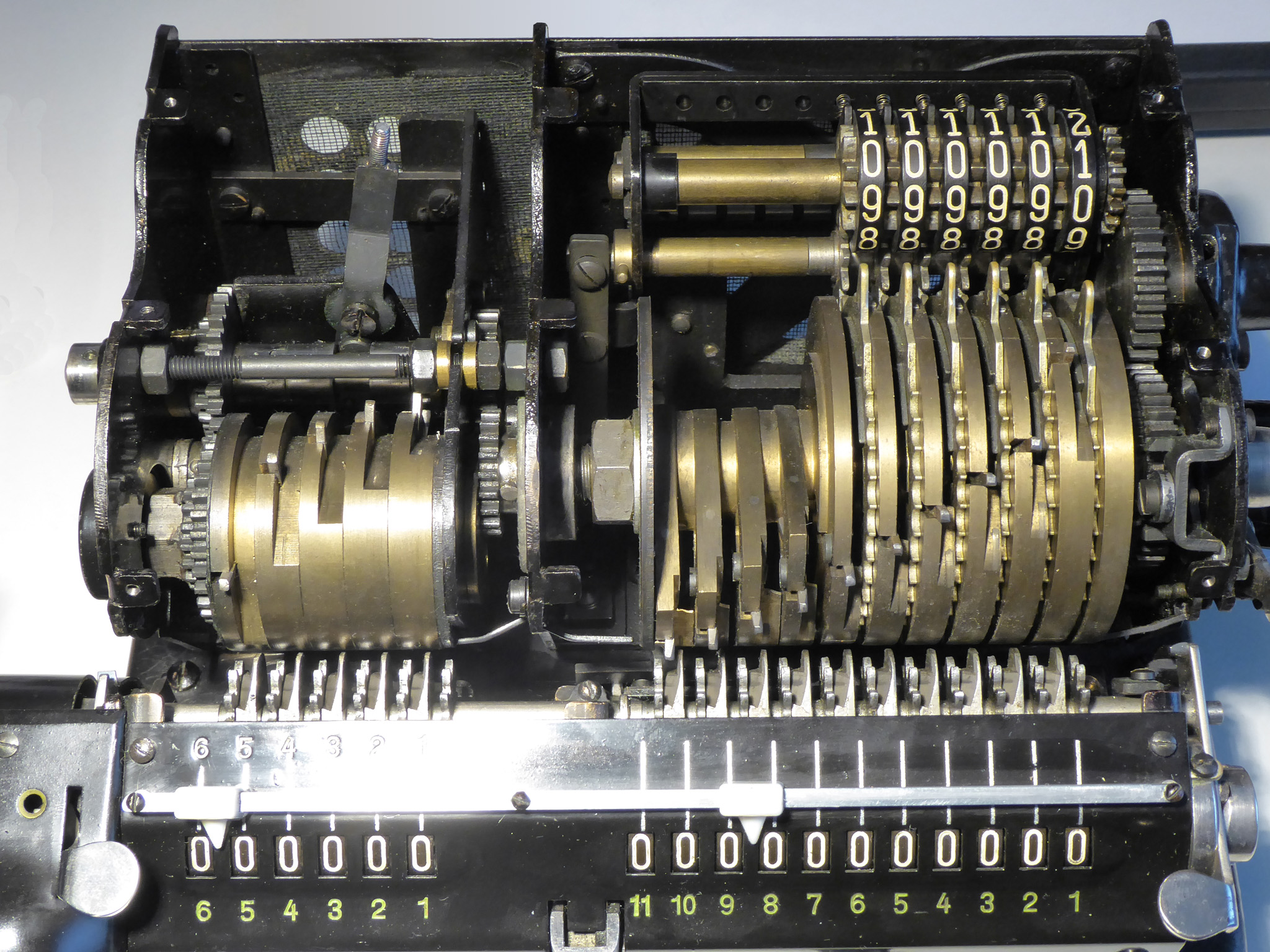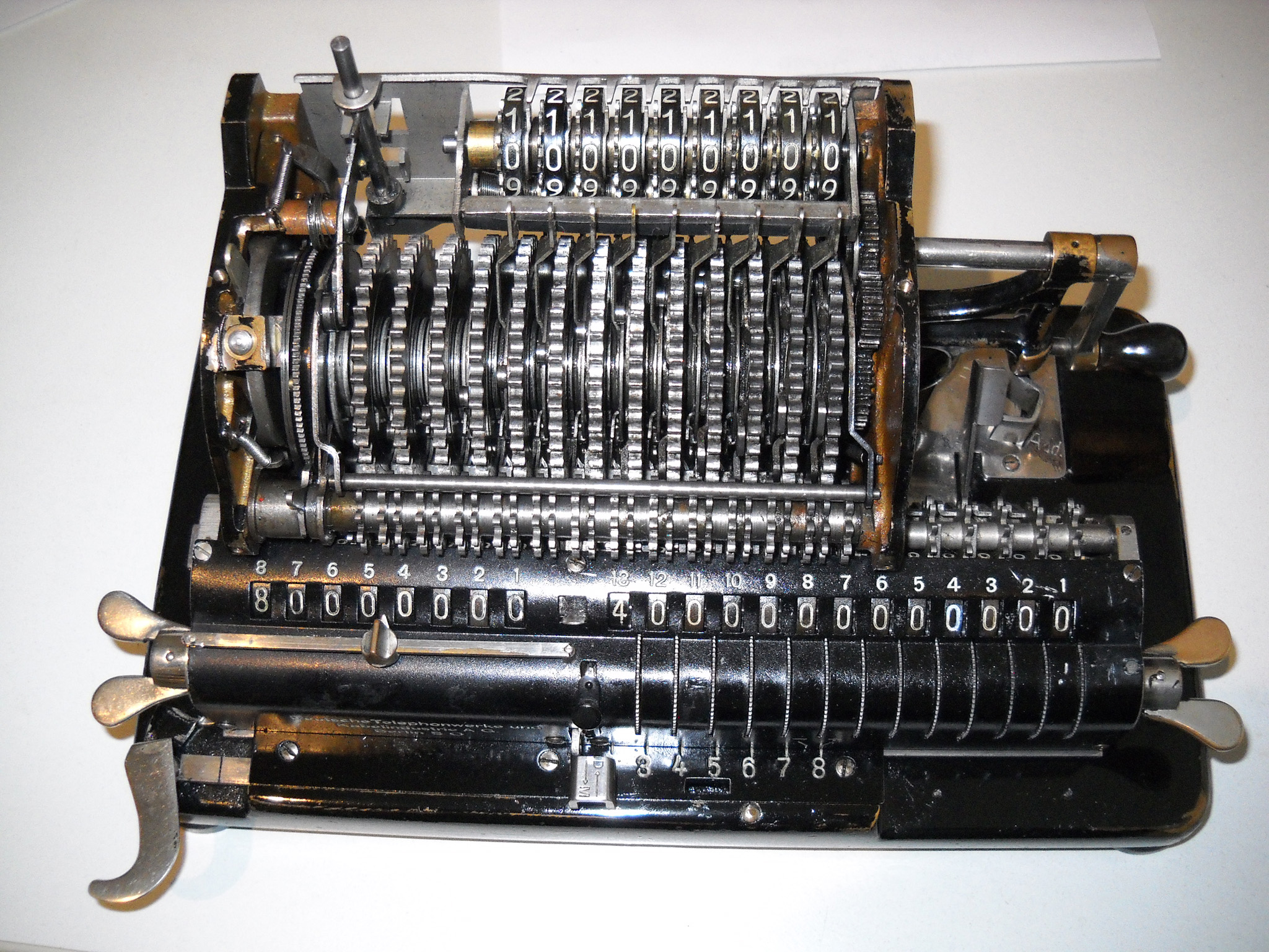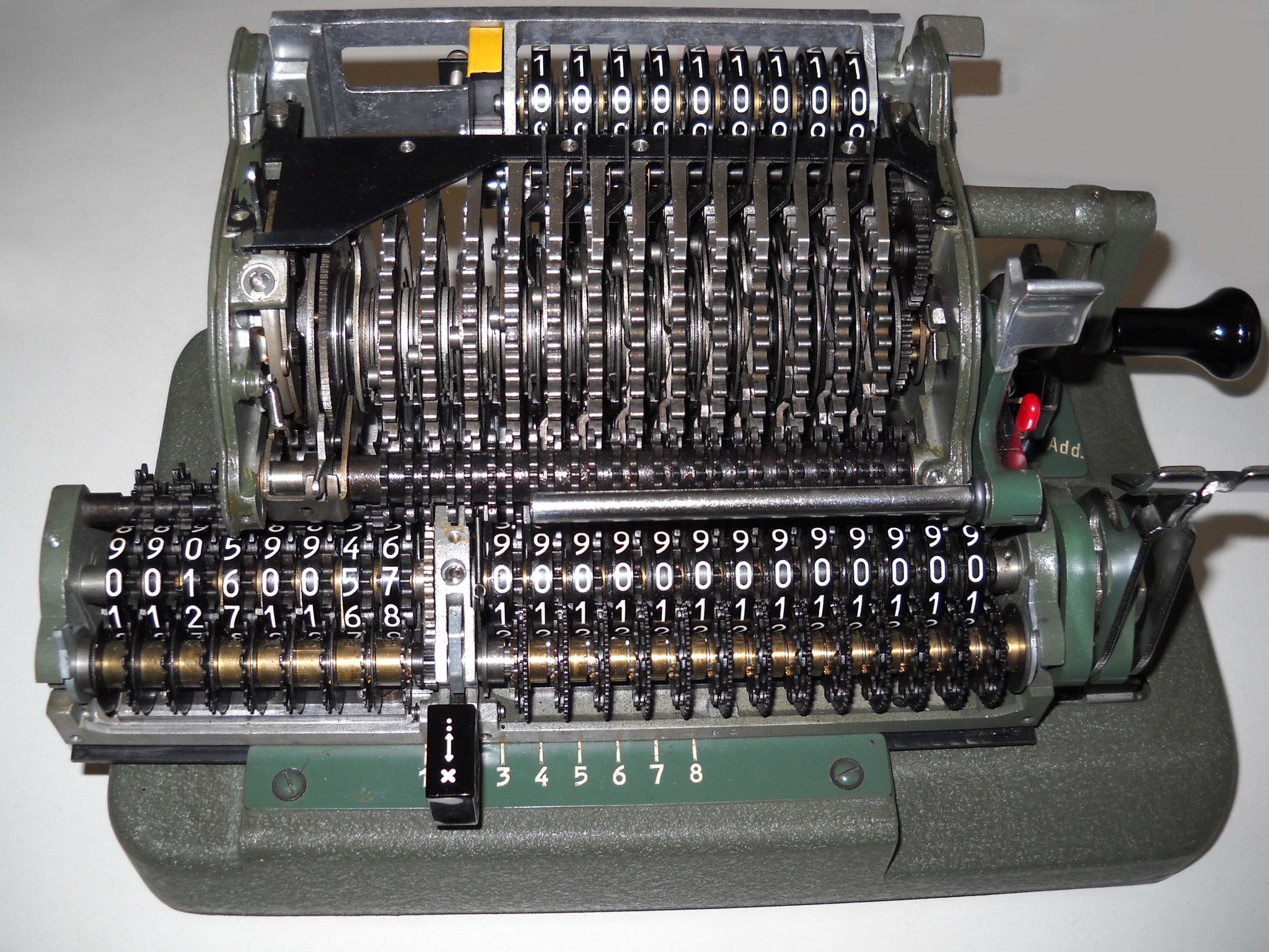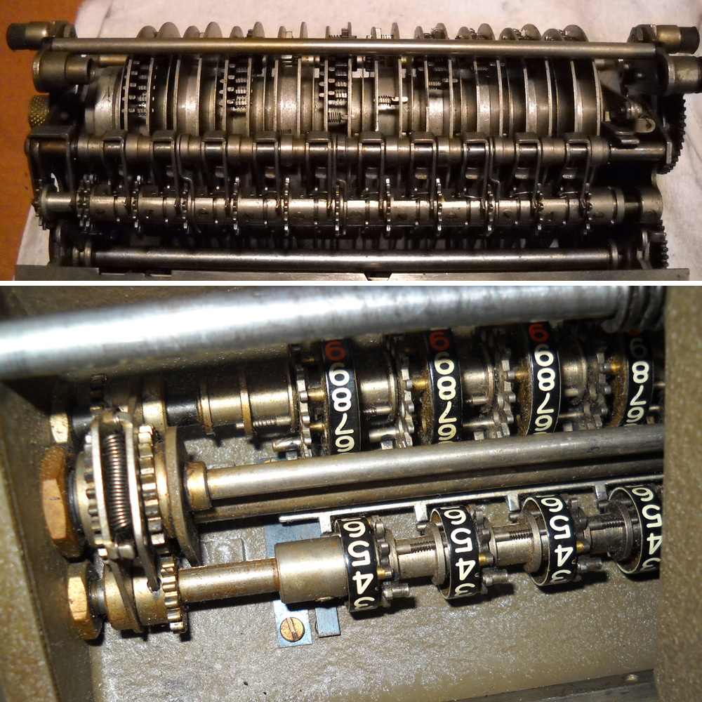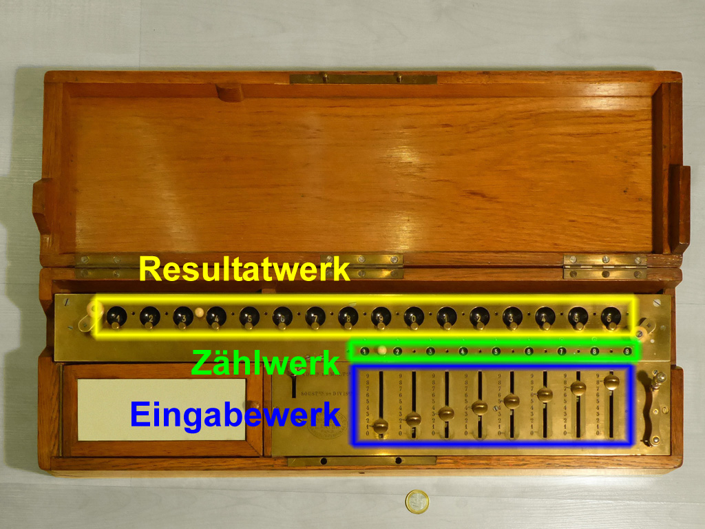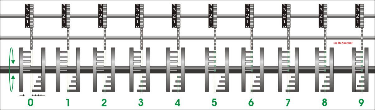 Für alle, die nicht so im Thema sind, hier die Erklärung einiger Fachbegriffe: AdditionsmodusDas Drücken der „Plus“-Taste zählt nicht nur den Wert der Eingabe zum Resultatwerk hinzu, sondern KapazitätIm Zusammenhang mit Rechenmaschinen nur ein anderes Wort für die Stellenzahl der Werke ... klingt aber gelehrter. Schalt(werks)prinzipienJede Zifferneingabe in eine Rechenmaschine muss erst irgendwie erfasst (und meist auch gespeichert) werden. Danach muss der gewünschte Wert natürlich auch seinen Weg zum Ergebnis finden. Zusätzliche Links:Youtube-Video: Staffelwalze (Schema) „Werke“ZehnerübertragWas passiert, wenn in einer Stelle "über die Neun hinaus" addiert werden muss, erklärt die Wikipedia ganz ausführlich. Aber nur die englische Wikipedia erklärt auch, warum die Mechanisierung dieses Vorgangs die größte Herausforderung beim Bau von Rechenmaschinen war. Weitere Erklärungen gewünscht? |