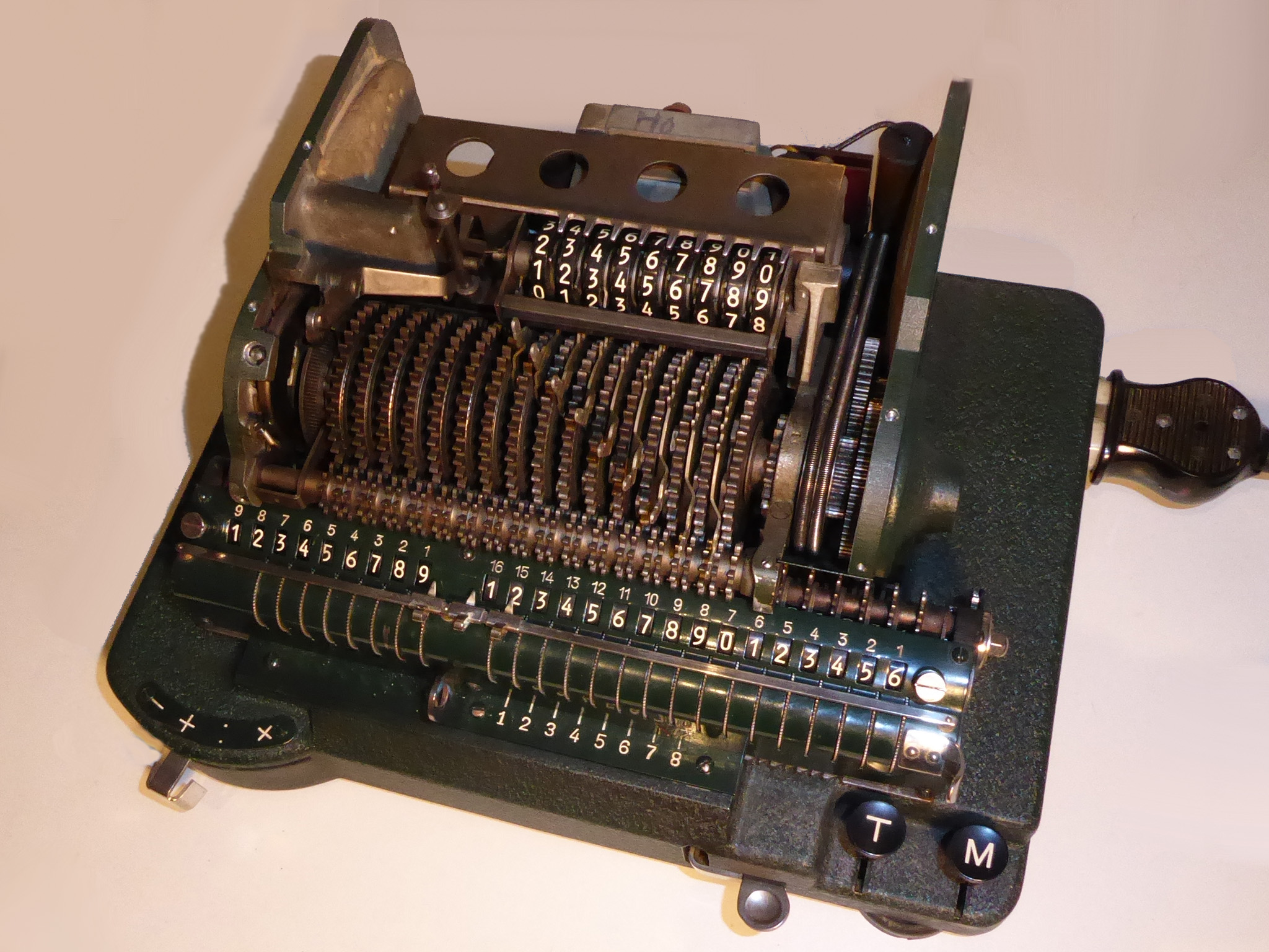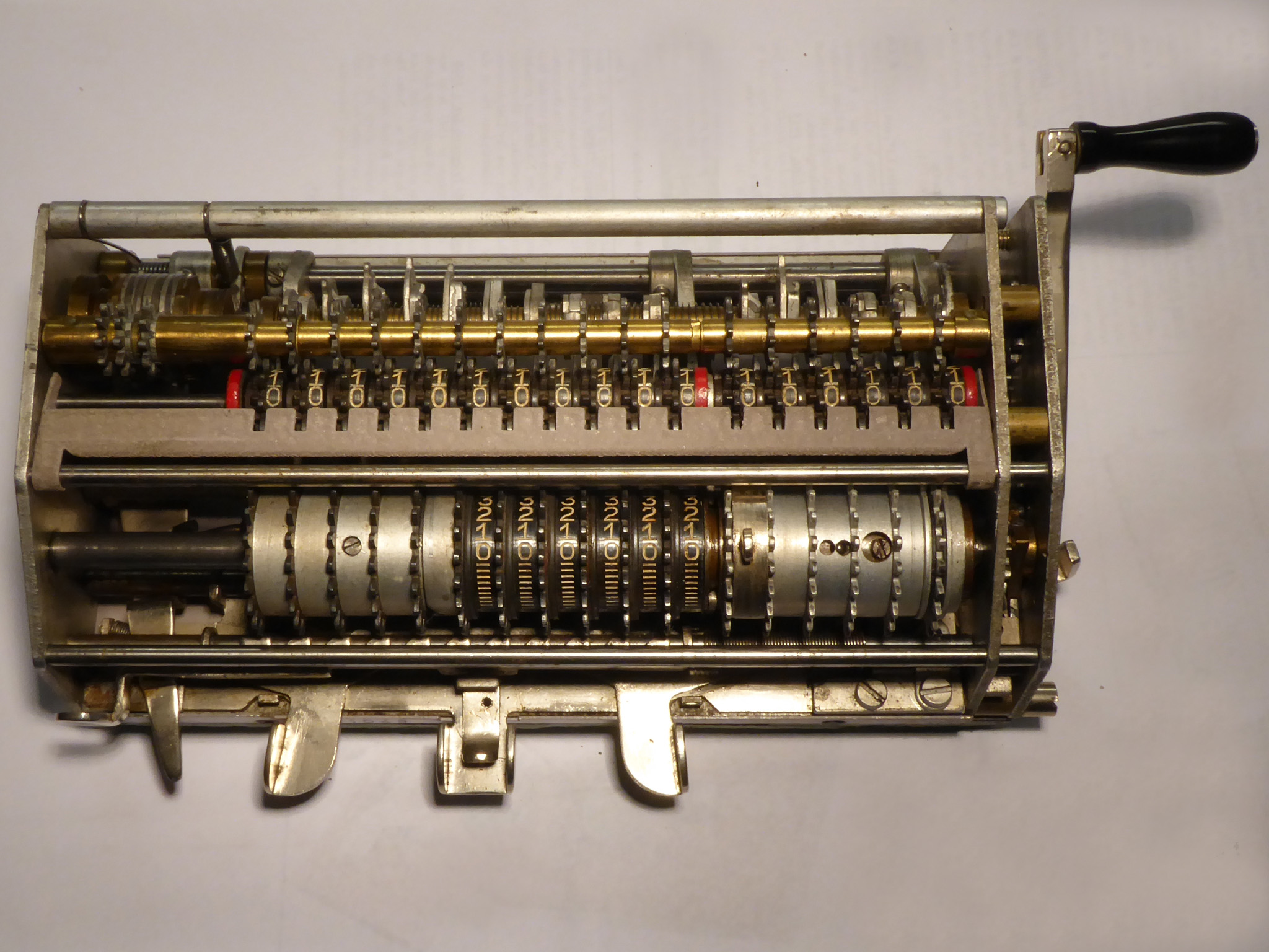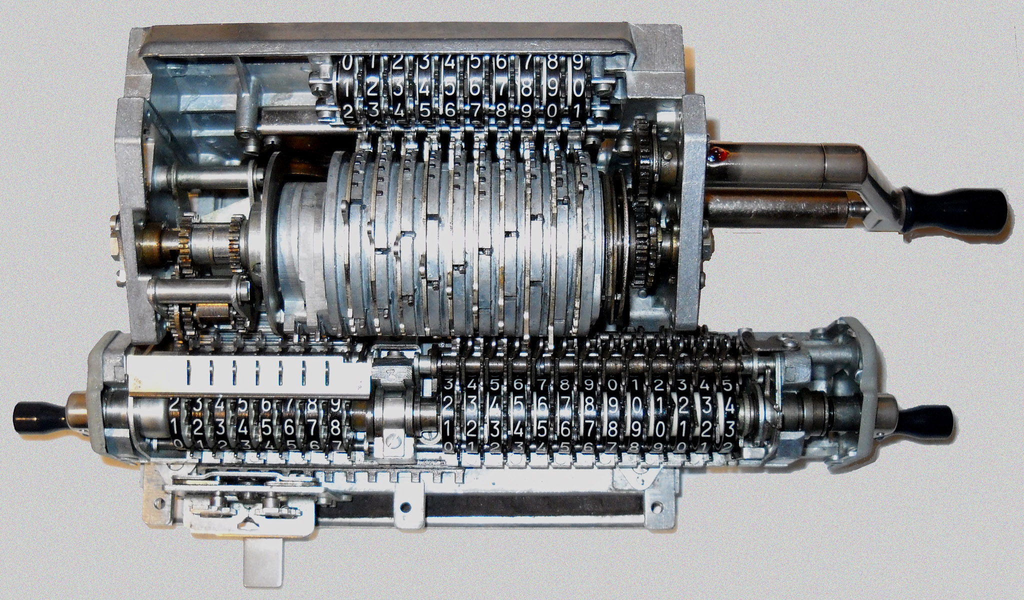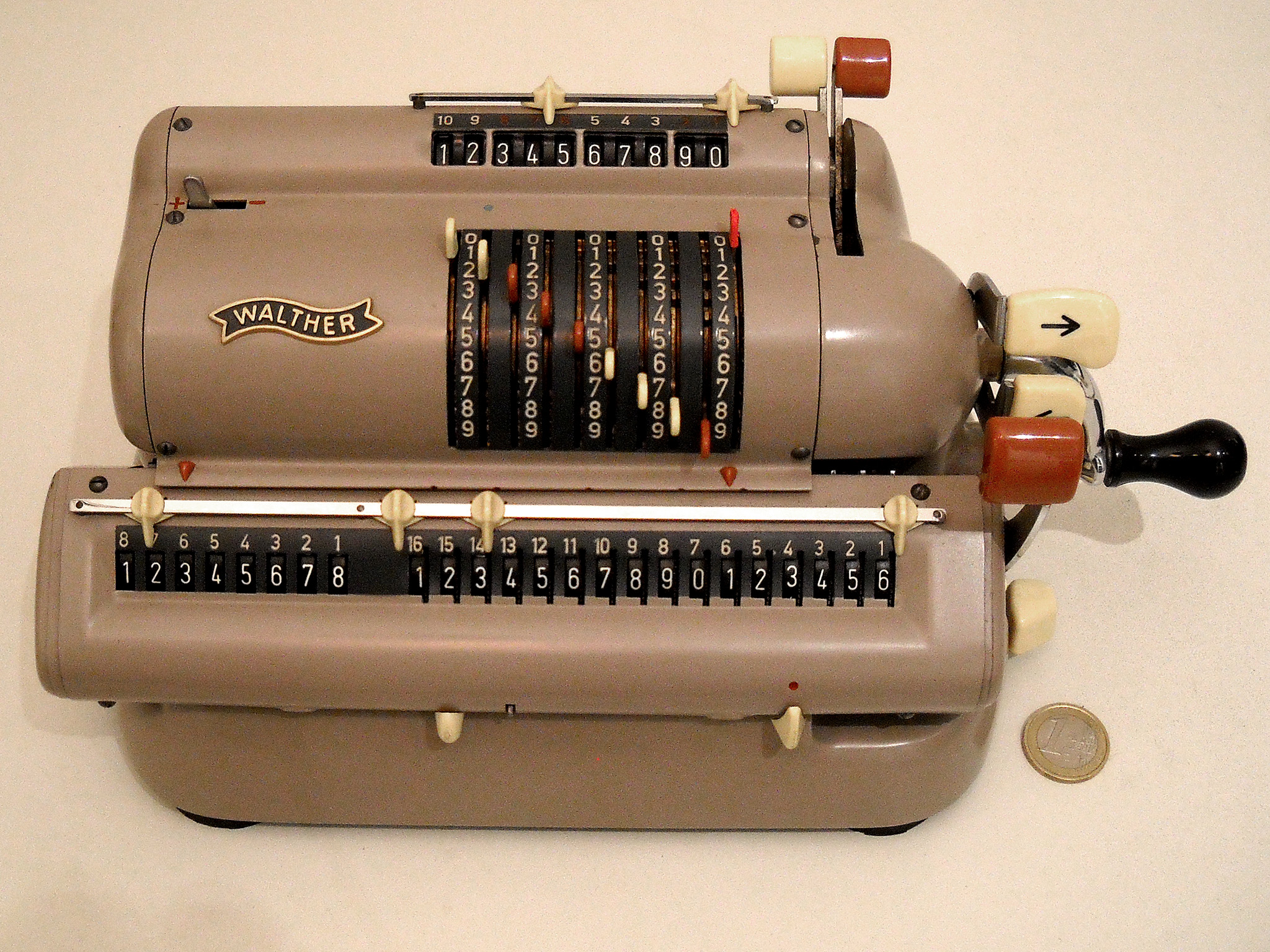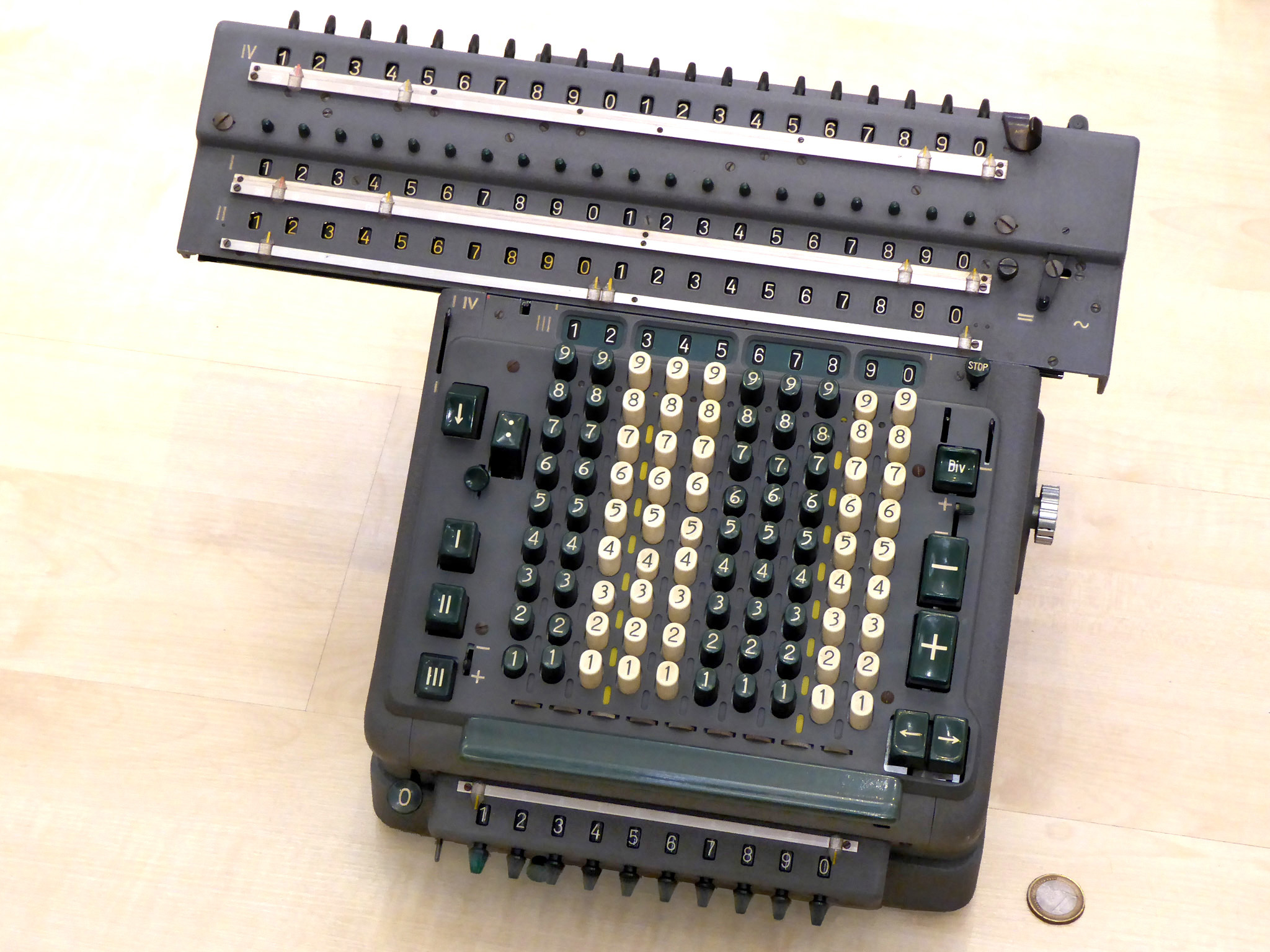 Für alle, die nicht so im Thema sind, hier die Erklärung einiger Fachbegriffe: AdditionsmodusDas Drücken der „Plus“-Taste zählt nicht nur den Wert der Eingabe zum Resultatwerk hinzu, sondern KapazitätIm Zusammenhang mit Rechenmaschinen nur ein anderes Wort für die Stellenzahl der Werke ... klingt aber gelehrter. Schalt(werks)prinzipienJede Zifferneingabe in eine Rechenmaschine muss erst irgendwie erfasst (und meist auch gespeichert) werden. Danach muss der gewünschte Wert natürlich auch seinen Weg zum Ergebnis finden. Zusätzliche Links:Youtube-Video: Staffelwalze (Schema) „Werke“ZehnerübertragWas passiert, wenn in einer Stelle "über die Neun hinaus" addiert werden muss, erklärt die Wikipedia ganz ausführlich. Aber nur die englische Wikipedia erklärt auch, warum die Mechanisierung dieses Vorgangs die größte Herausforderung beim Bau von Rechenmaschinen war. Weitere Erklärungen gewünscht? |