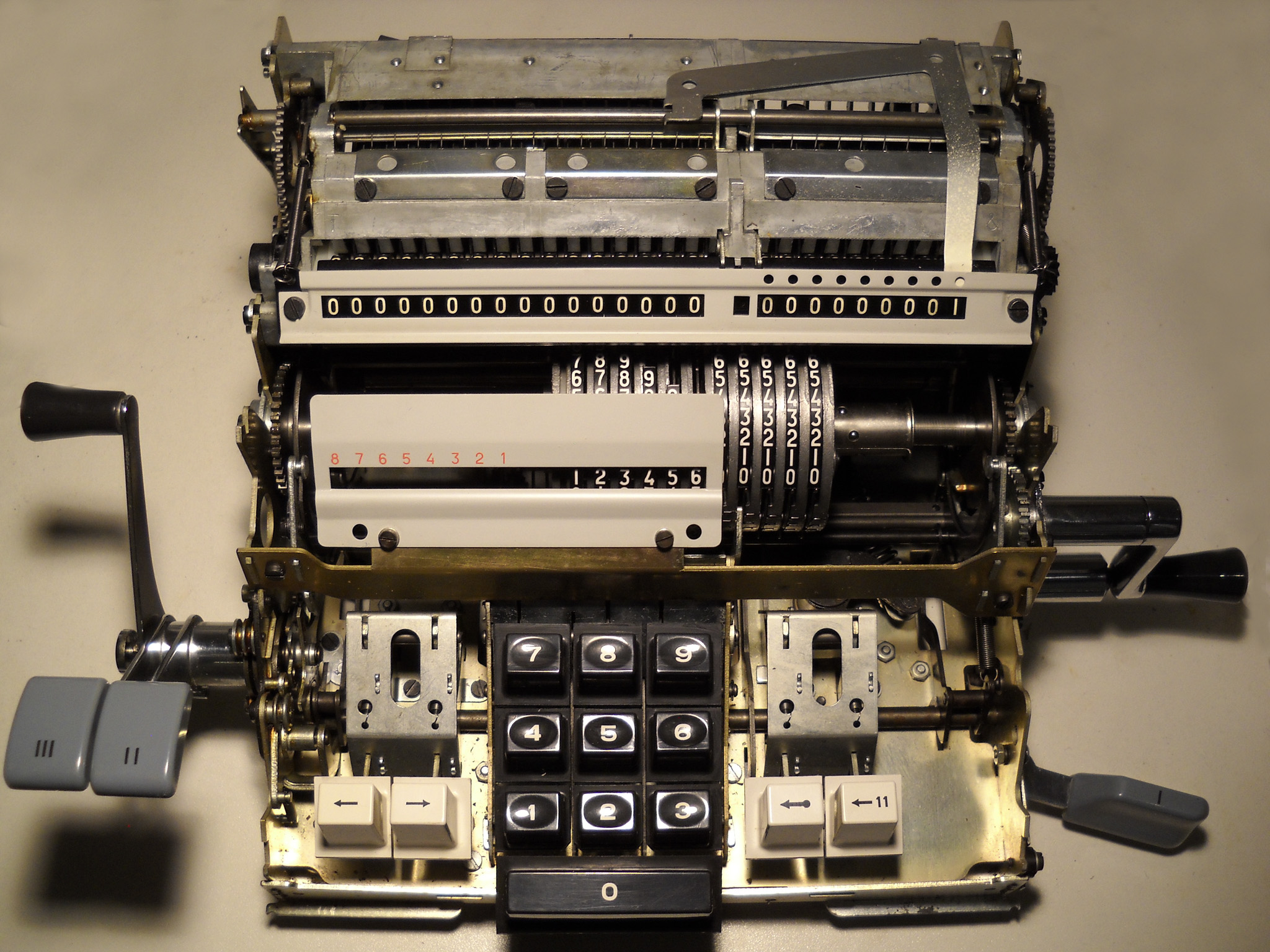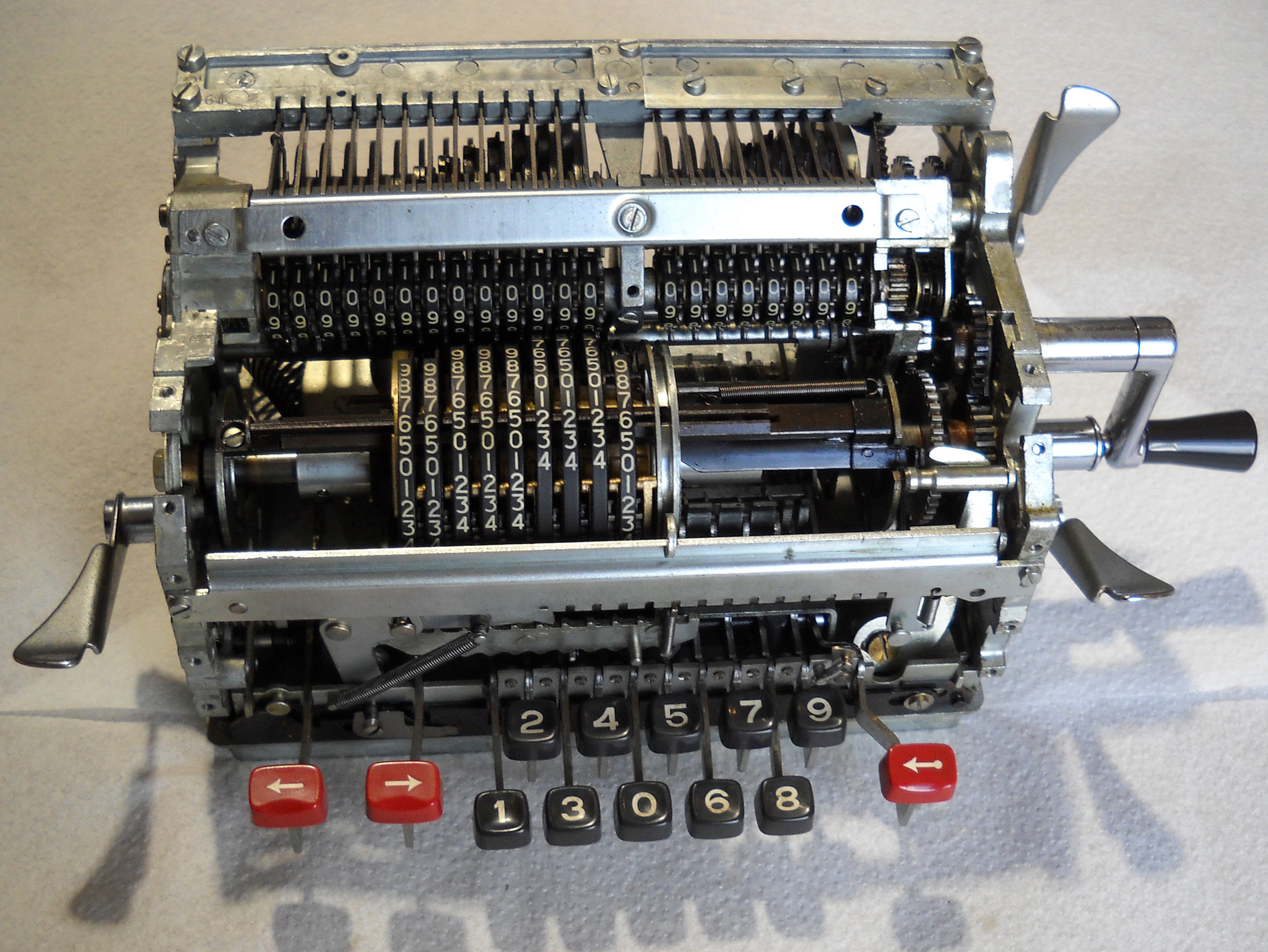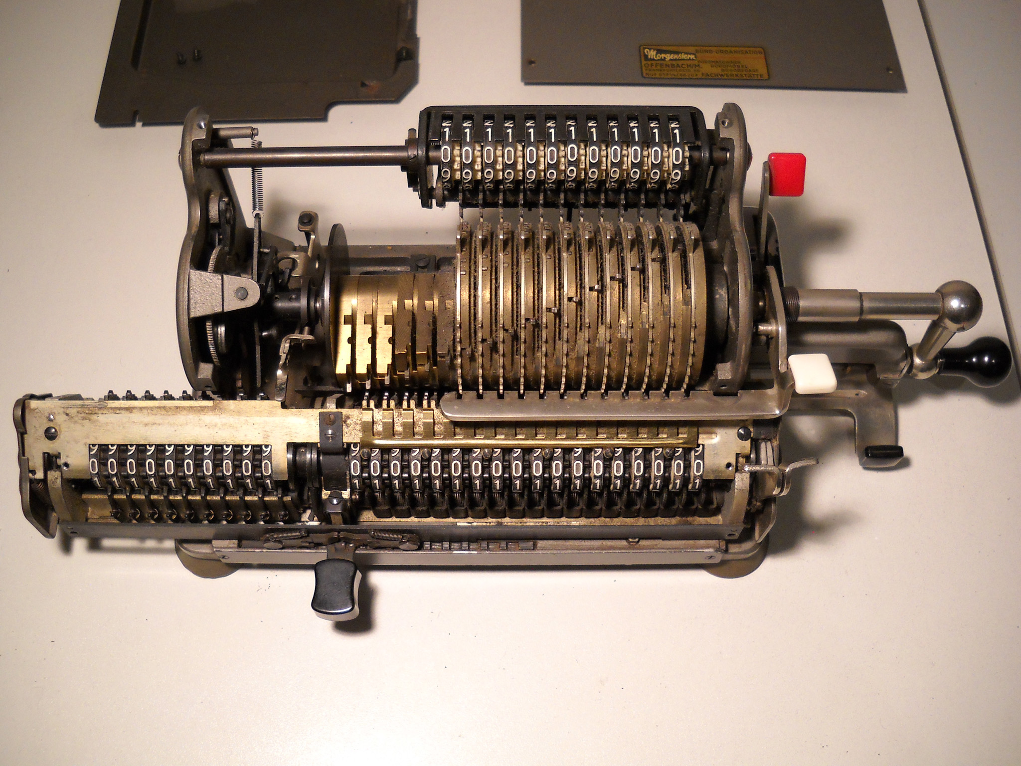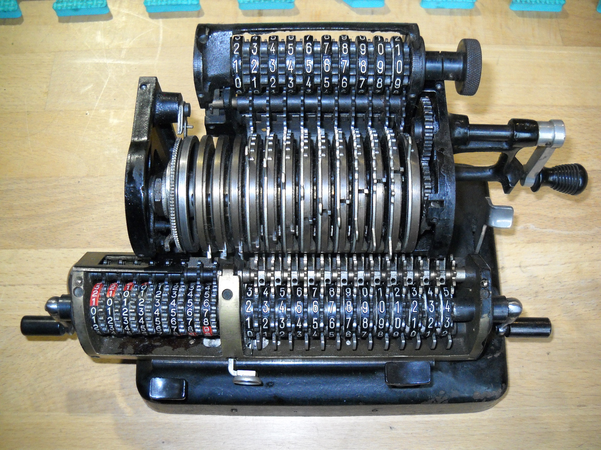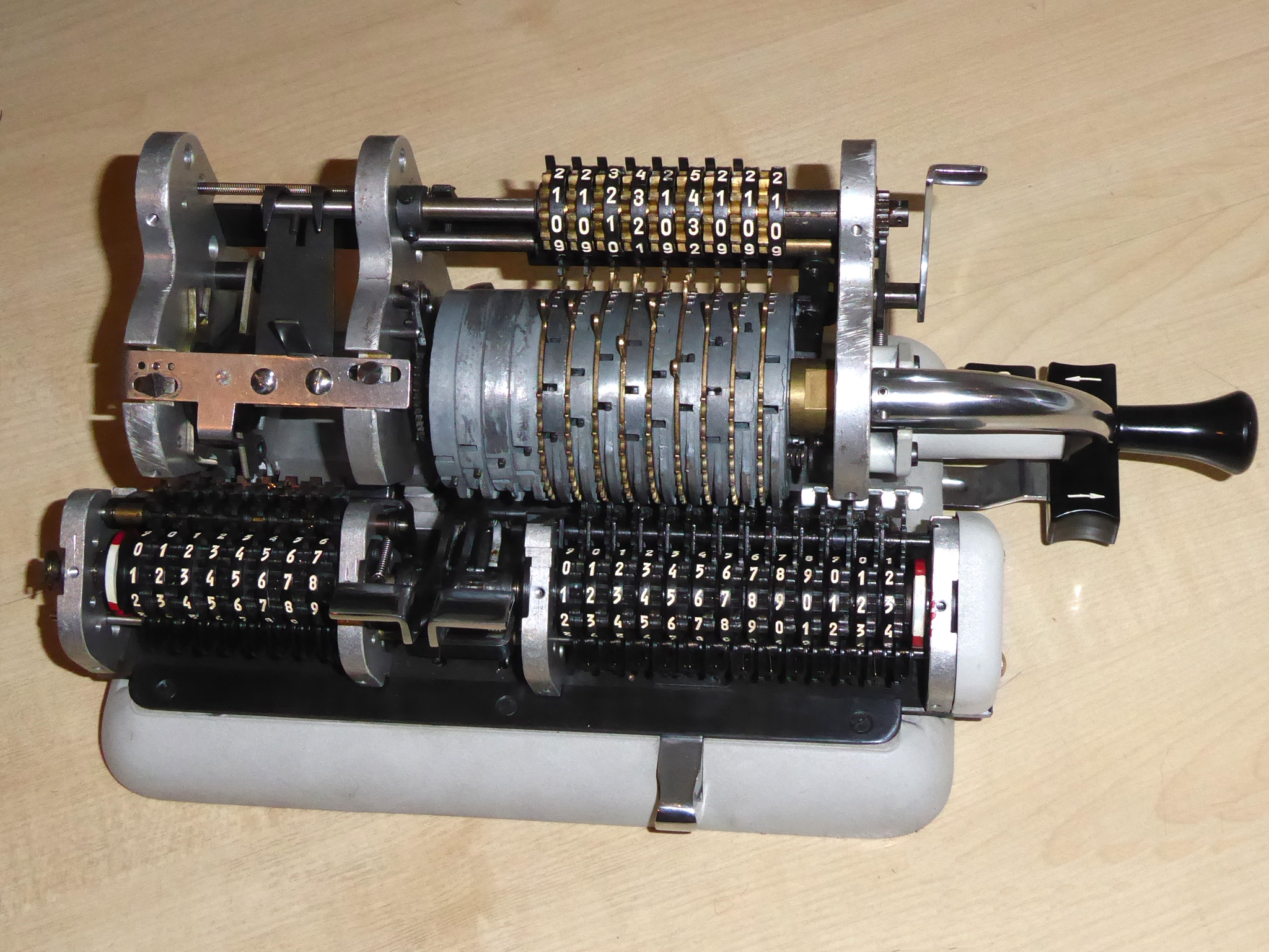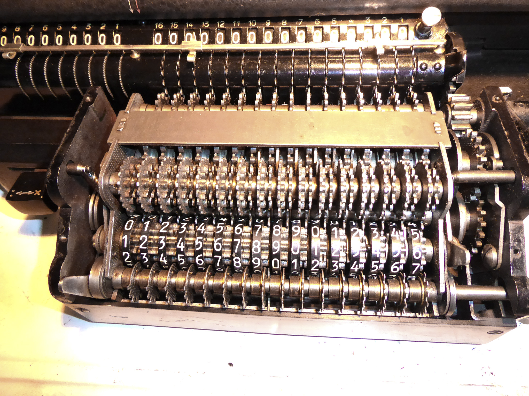 Für alle, die nicht so im Thema sind, hier die Erklärung einiger Fachbegriffe: AdditionsmodusDas Drücken der „Plus“-Taste zählt nicht nur den Wert der Eingabe zum Resultatwerk hinzu, sondern KapazitätIm Zusammenhang mit Rechenmaschinen nur ein anderes Wort für die Stellenzahl der Werke ... klingt aber gelehrter. Schalt(werks)prinzipienJede Zifferneingabe in eine Rechenmaschine muss erst irgendwie erfasst (und meist auch gespeichert) werden. Danach muss der gewünschte Wert natürlich auch seinen Weg zum Ergebnis finden. Zusätzliche Links:Youtube-Video: Staffelwalze (Schema) „Werke“ZehnerübertragWas passiert, wenn in einer Stelle "über die Neun hinaus" addiert werden muss, erklärt die Wikipedia ganz ausführlich. Aber nur die englische Wikipedia erklärt auch, warum die Mechanisierung dieses Vorgangs die größte Herausforderung beim Bau von Rechenmaschinen war. Weitere Erklärungen gewünscht? |