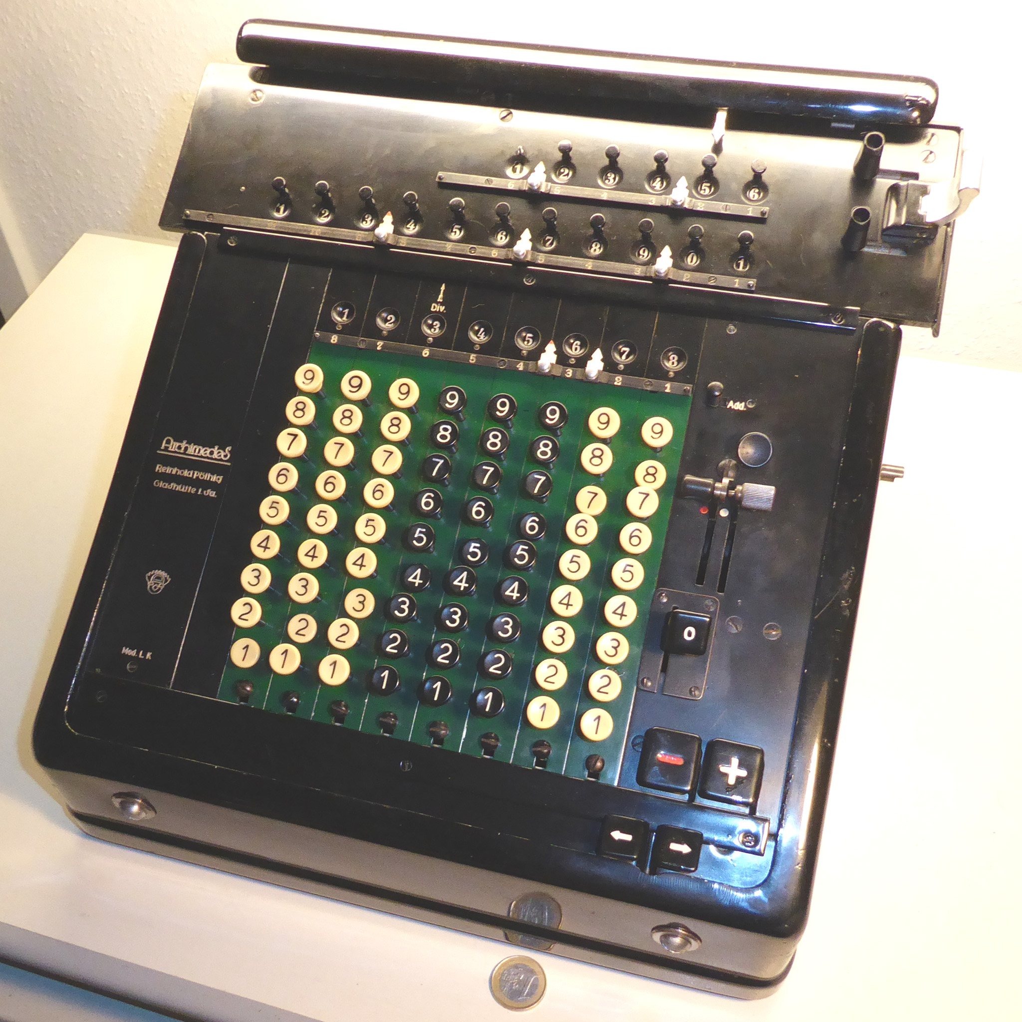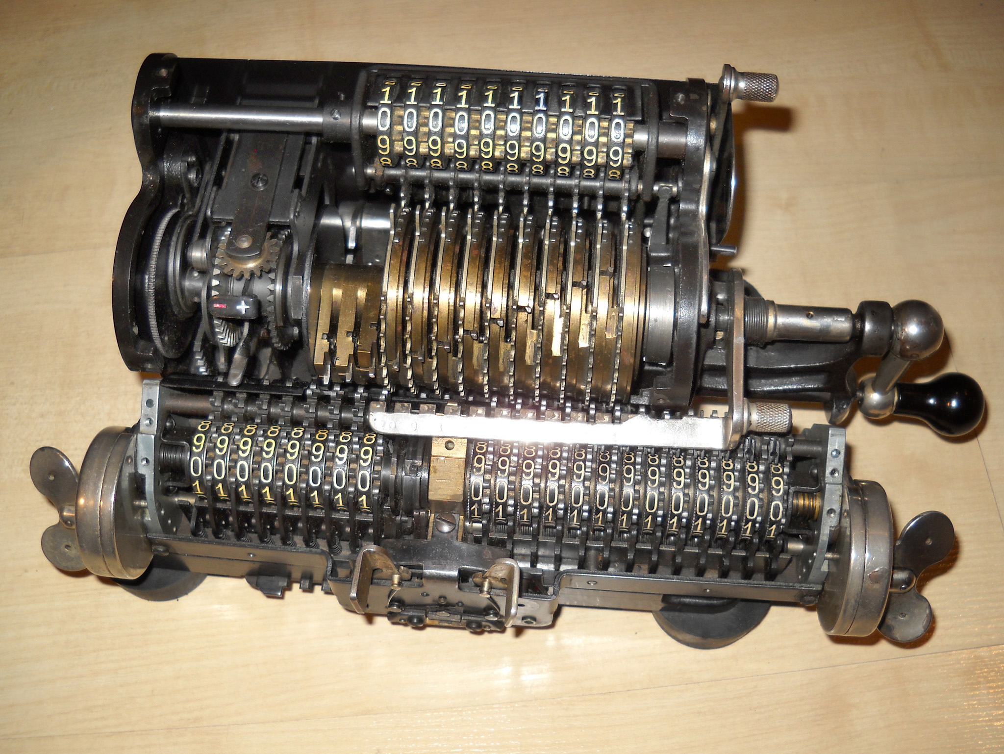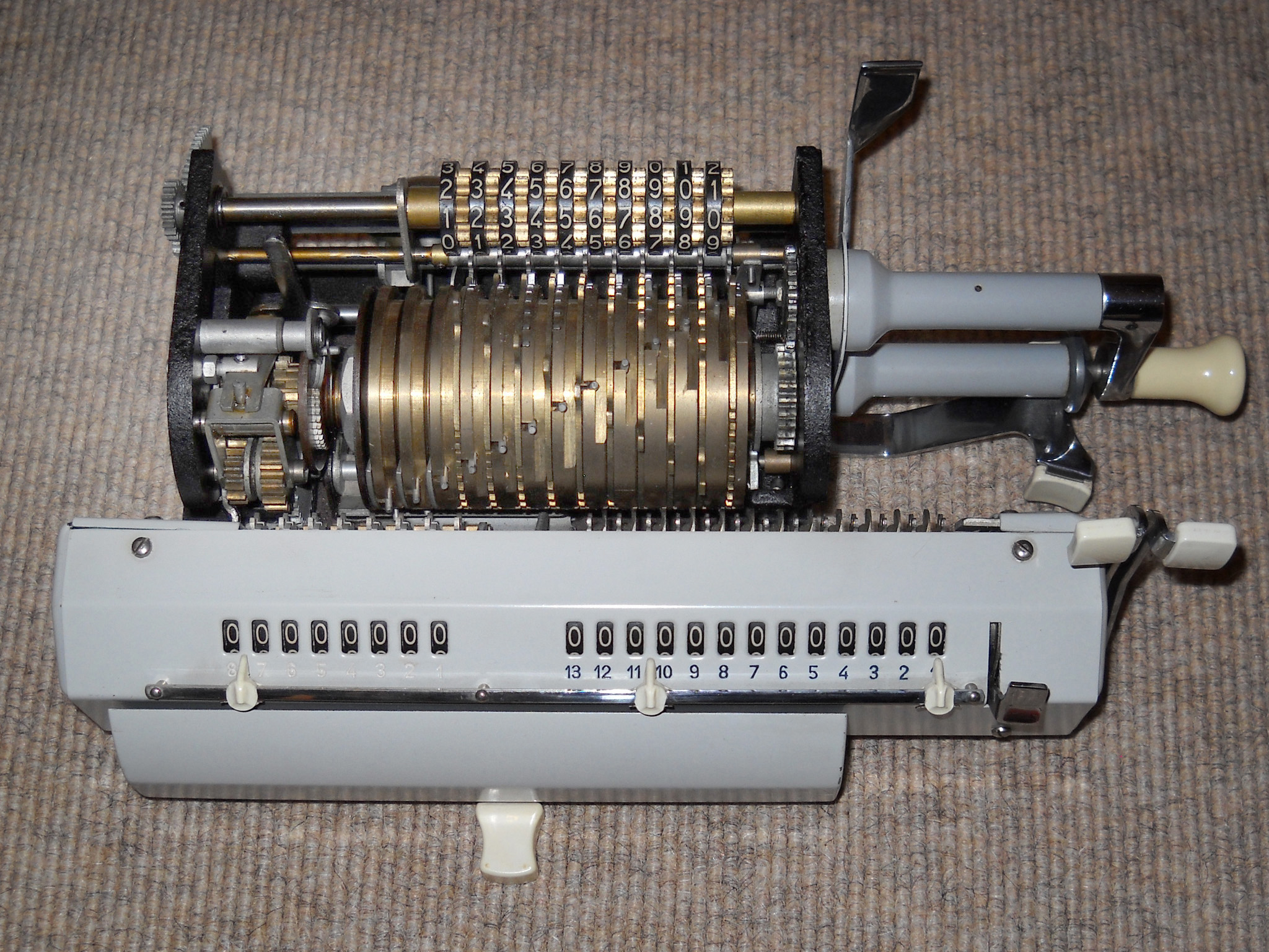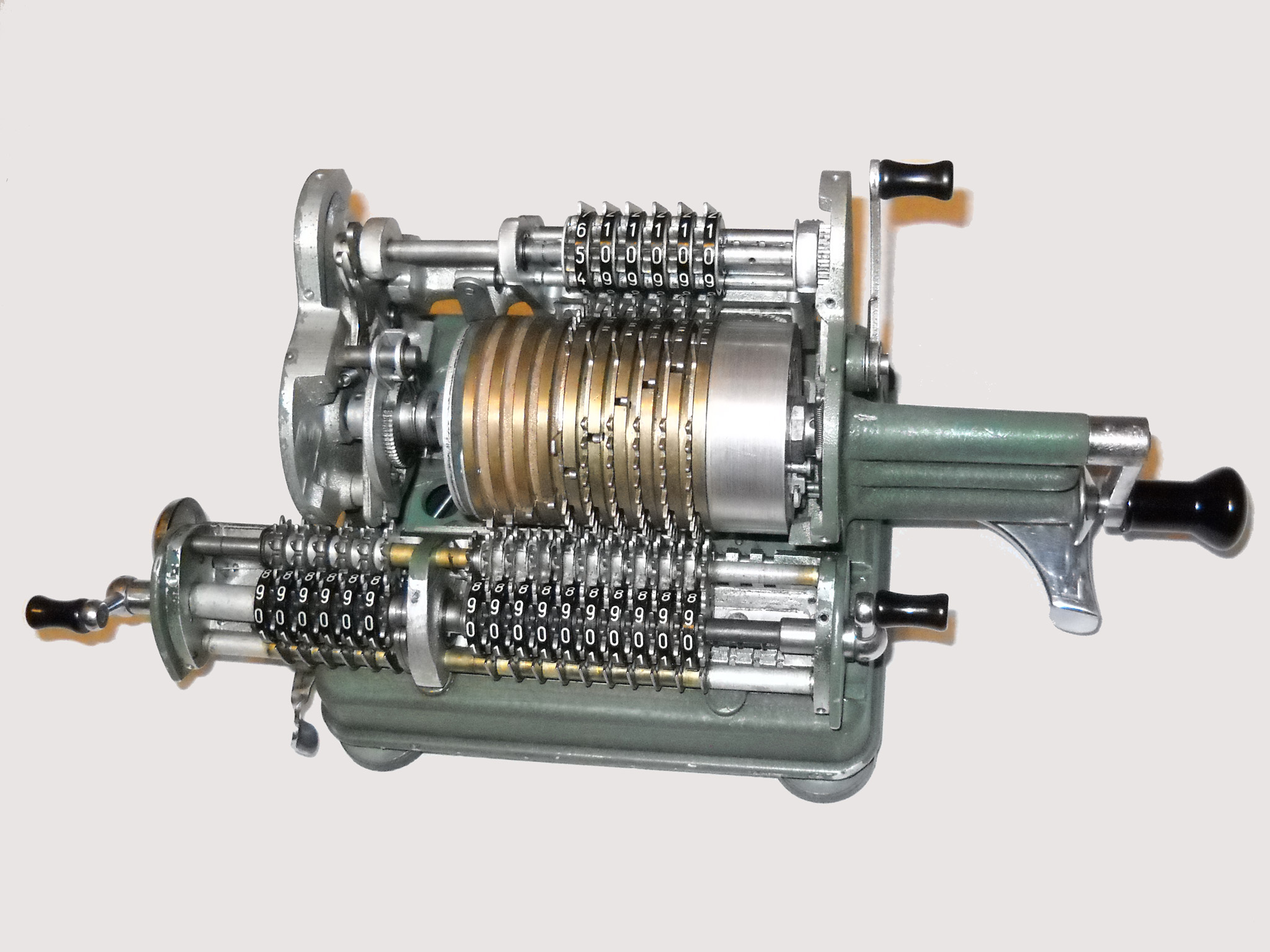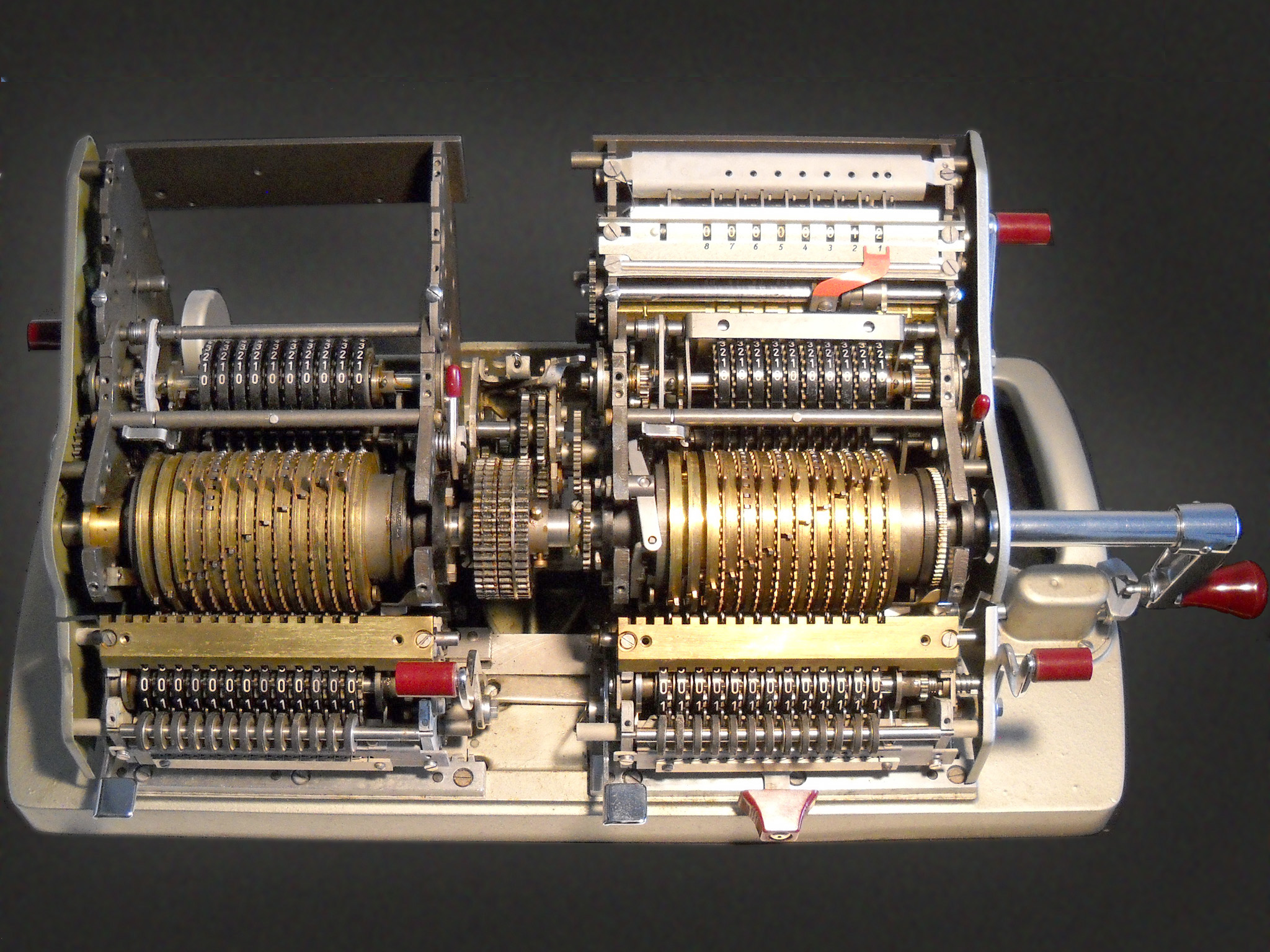 Für alle, die nicht so im Thema sind, hier die Erklärung einiger Fachbegriffe: AdditionsmodusDas Drücken der „Plus“-Taste zählt nicht nur den Wert der Eingabe zum Resultatwerk hinzu, sondern KapazitätIm Zusammenhang mit Rechenmaschinen nur ein anderes Wort für die Stellenzahl der Werke ... klingt aber gelehrter. Schalt(werks)prinzipienJede Zifferneingabe in eine Rechenmaschine muss erst irgendwie erfasst (und meist auch gespeichert) werden. Danach muss der gewünschte Wert natürlich auch seinen Weg zum Ergebnis finden. Zusätzliche Links:Youtube-Video: Staffelwalze (Schema) „Werke“ZehnerübertragWas passiert, wenn in einer Stelle "über die Neun hinaus" addiert werden muss, erklärt die Wikipedia ganz ausführlich. Aber nur die englische Wikipedia erklärt auch, warum die Mechanisierung dieses Vorgangs die größte Herausforderung beim Bau von Rechenmaschinen war. Weitere Erklärungen gewünscht? |