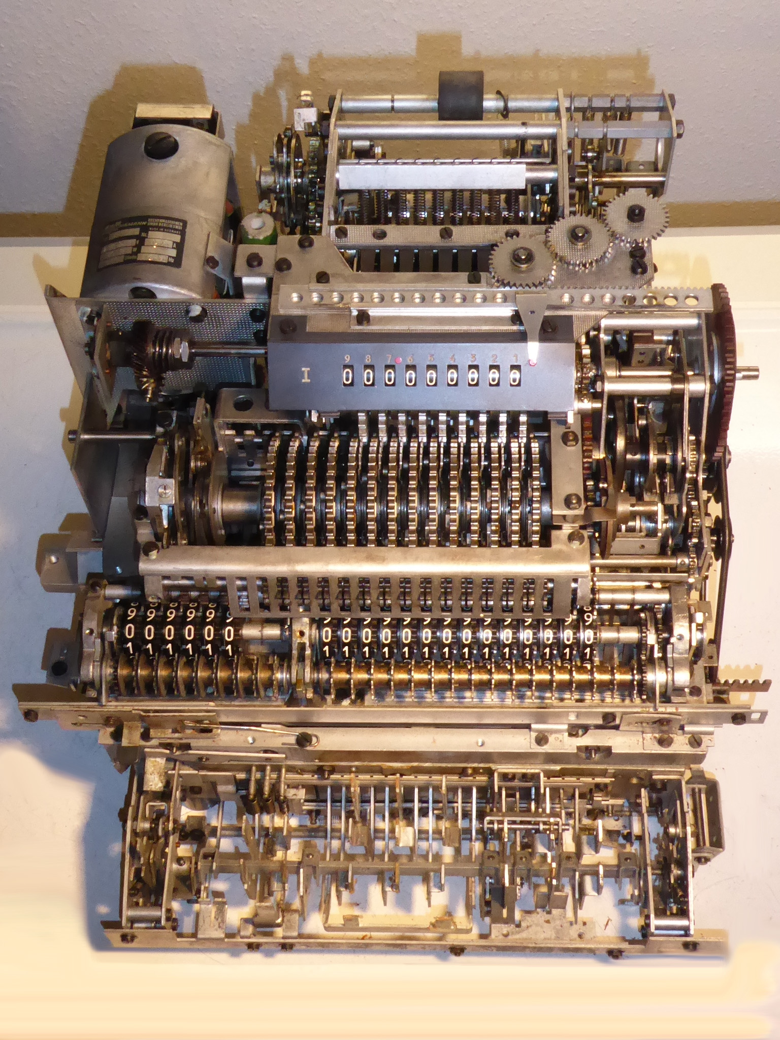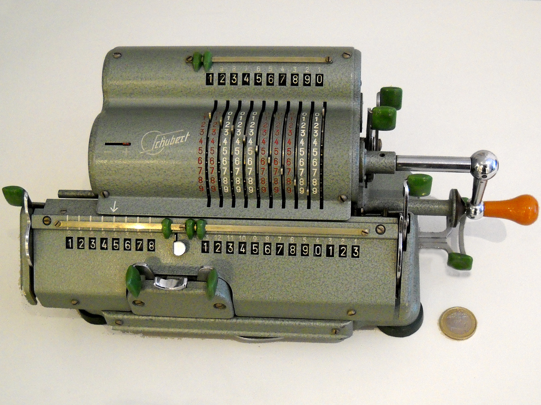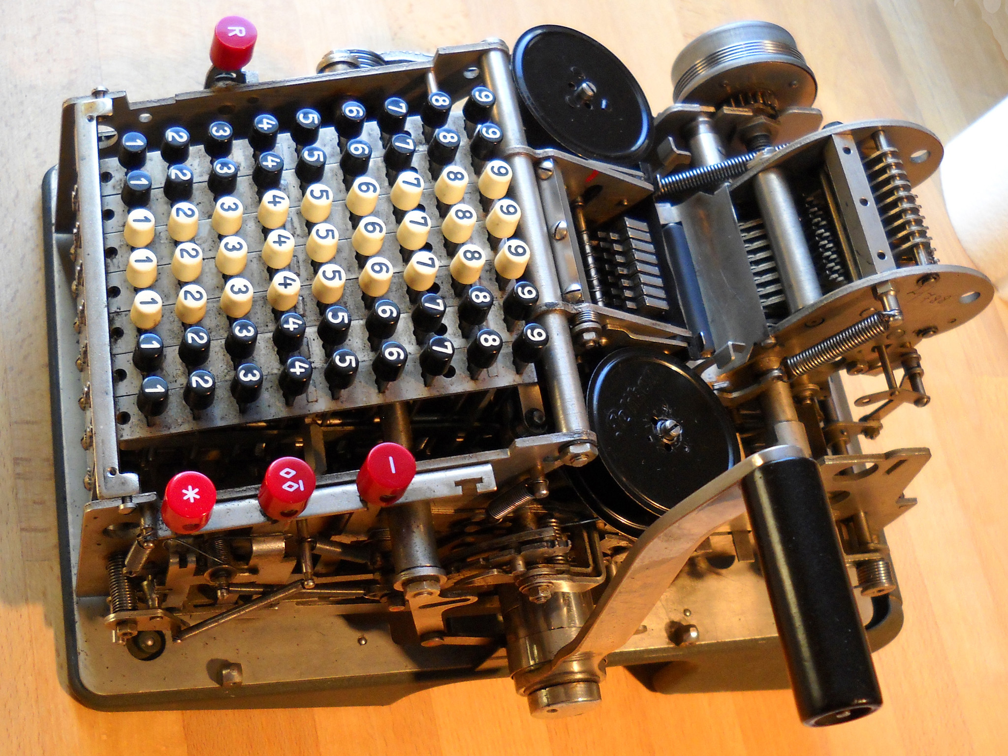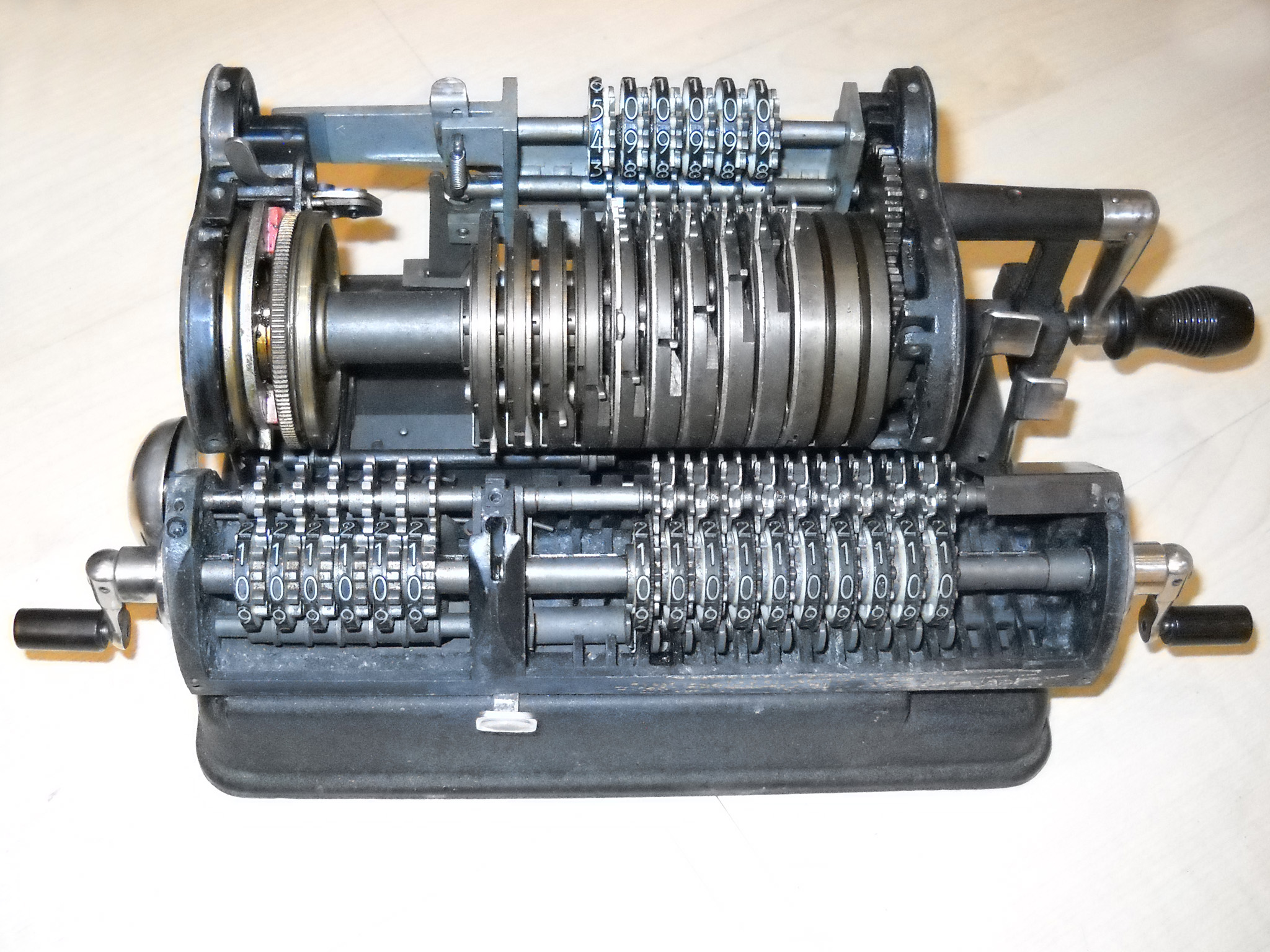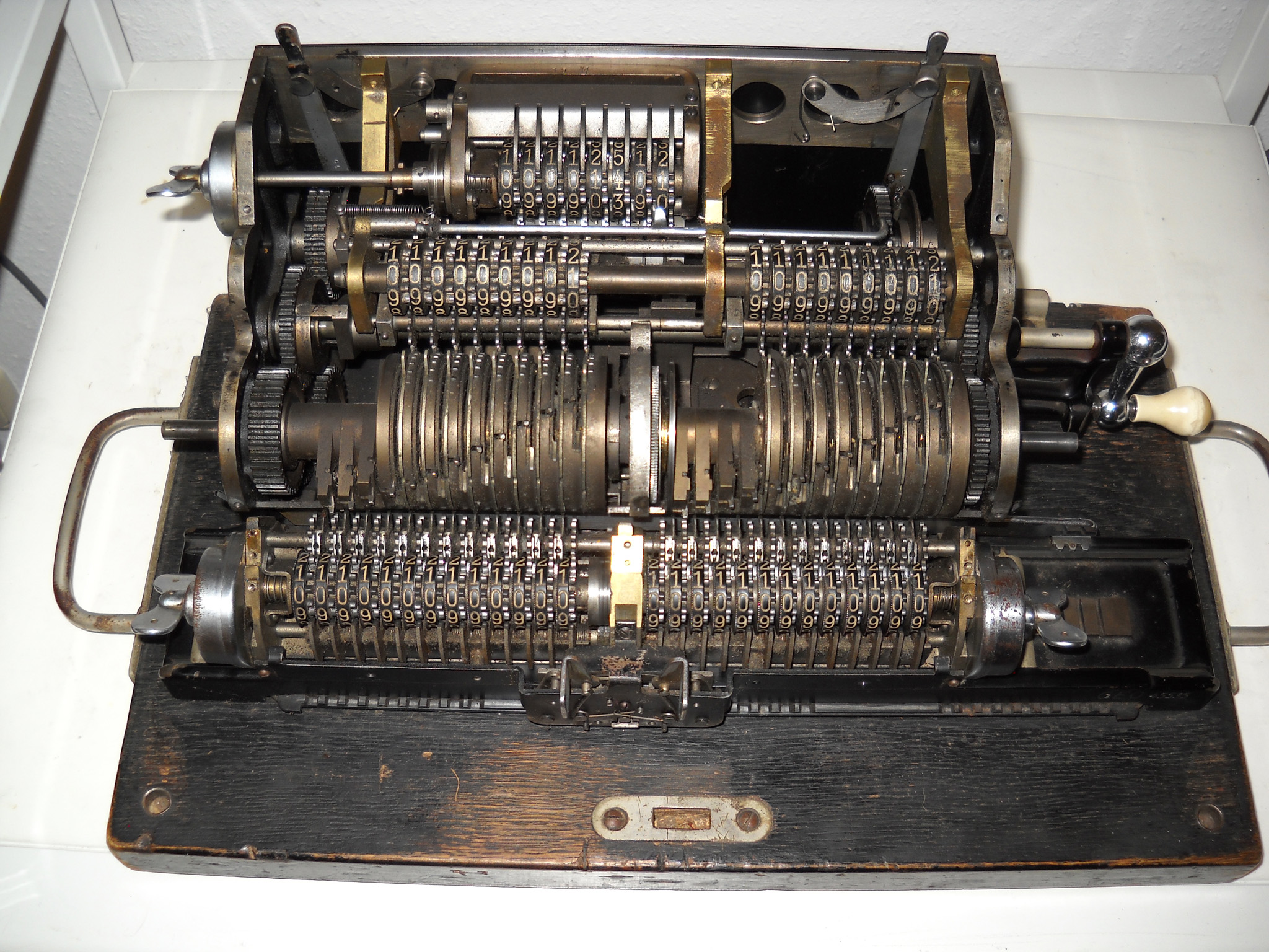 Für alle, die nicht so im Thema sind, hier die Erklärung einiger Fachbegriffe: AdditionsmodusDas Drücken der „Plus“-Taste zählt nicht nur den Wert der Eingabe zum Resultatwerk hinzu, sondern KapazitätIm Zusammenhang mit Rechenmaschinen nur ein anderes Wort für die Stellenzahl der Werke ... klingt aber gelehrter. Schalt(werks)prinzipienJede Zifferneingabe in eine Rechenmaschine muss erst irgendwie erfasst (und meist auch gespeichert) werden. Danach muss der gewünschte Wert natürlich auch seinen Weg zum Ergebnis finden. Zusätzliche Links:Youtube-Video: Staffelwalze (Schema) „Werke“ZehnerübertragWas passiert, wenn in einer Stelle "über die Neun hinaus" addiert werden muss, erklärt die Wikipedia ganz ausführlich. Aber nur die englische Wikipedia erklärt auch, warum die Mechanisierung dieses Vorgangs die größte Herausforderung beim Bau von Rechenmaschinen war. Weitere Erklärungen gewünscht? |