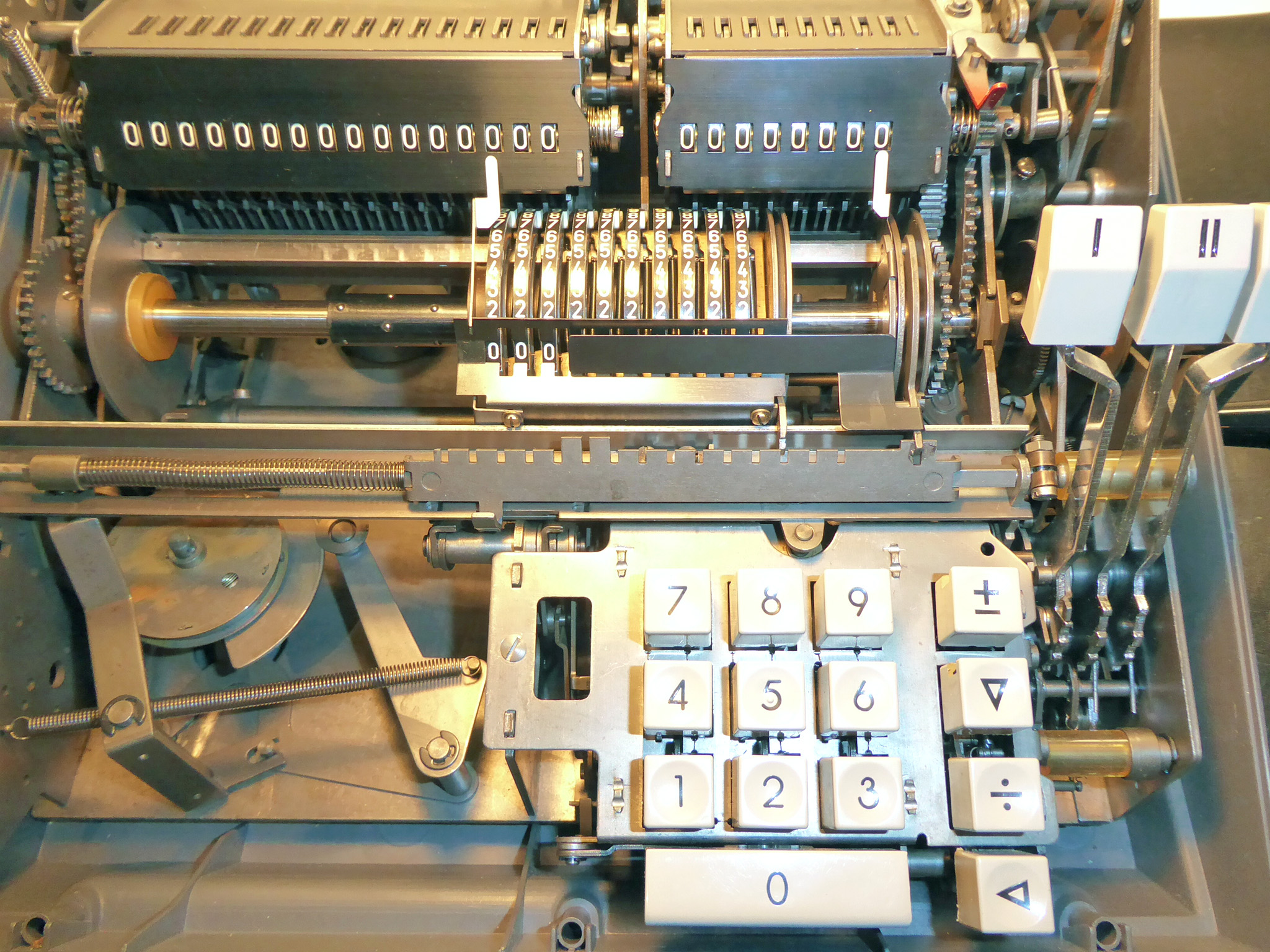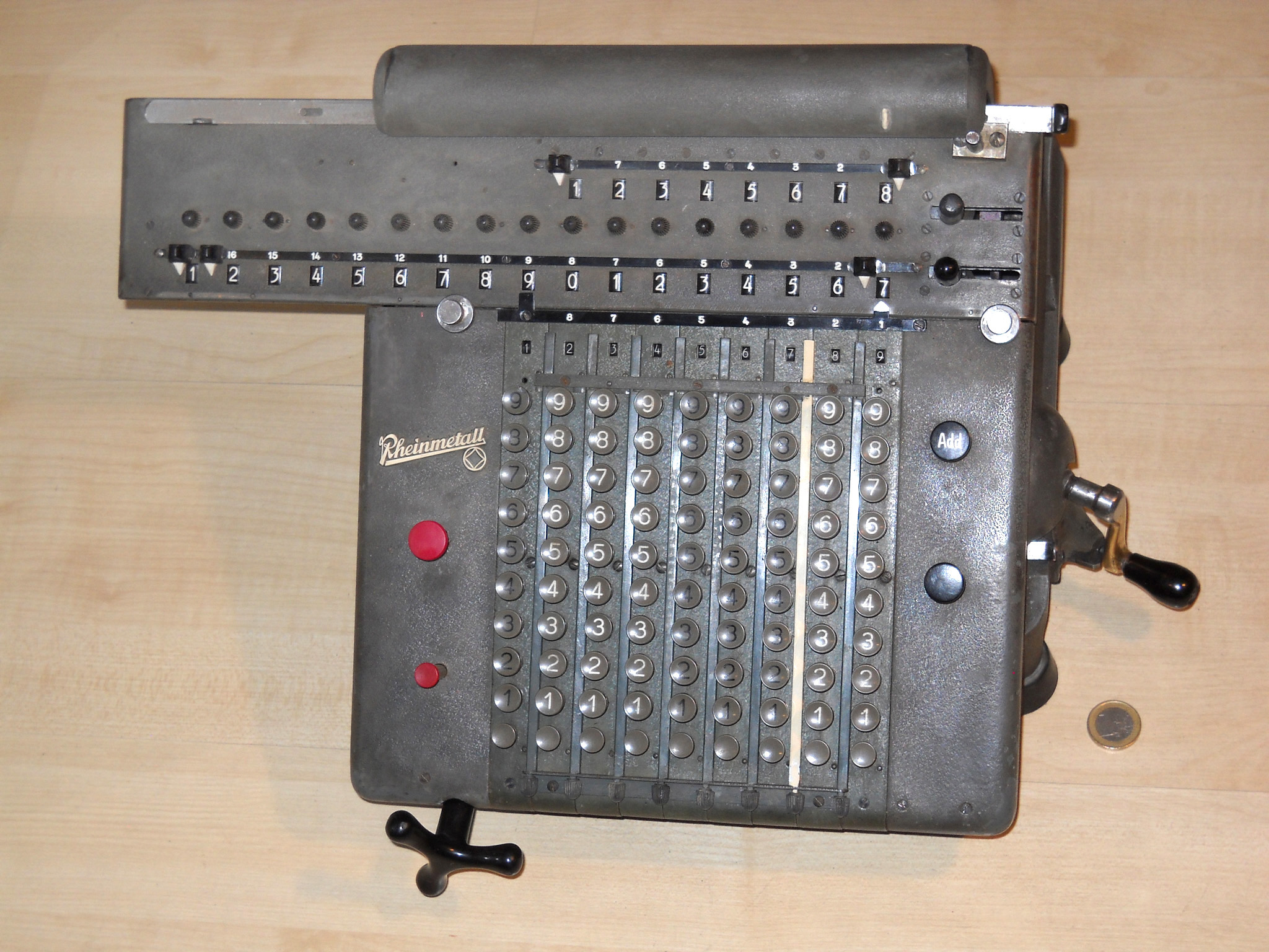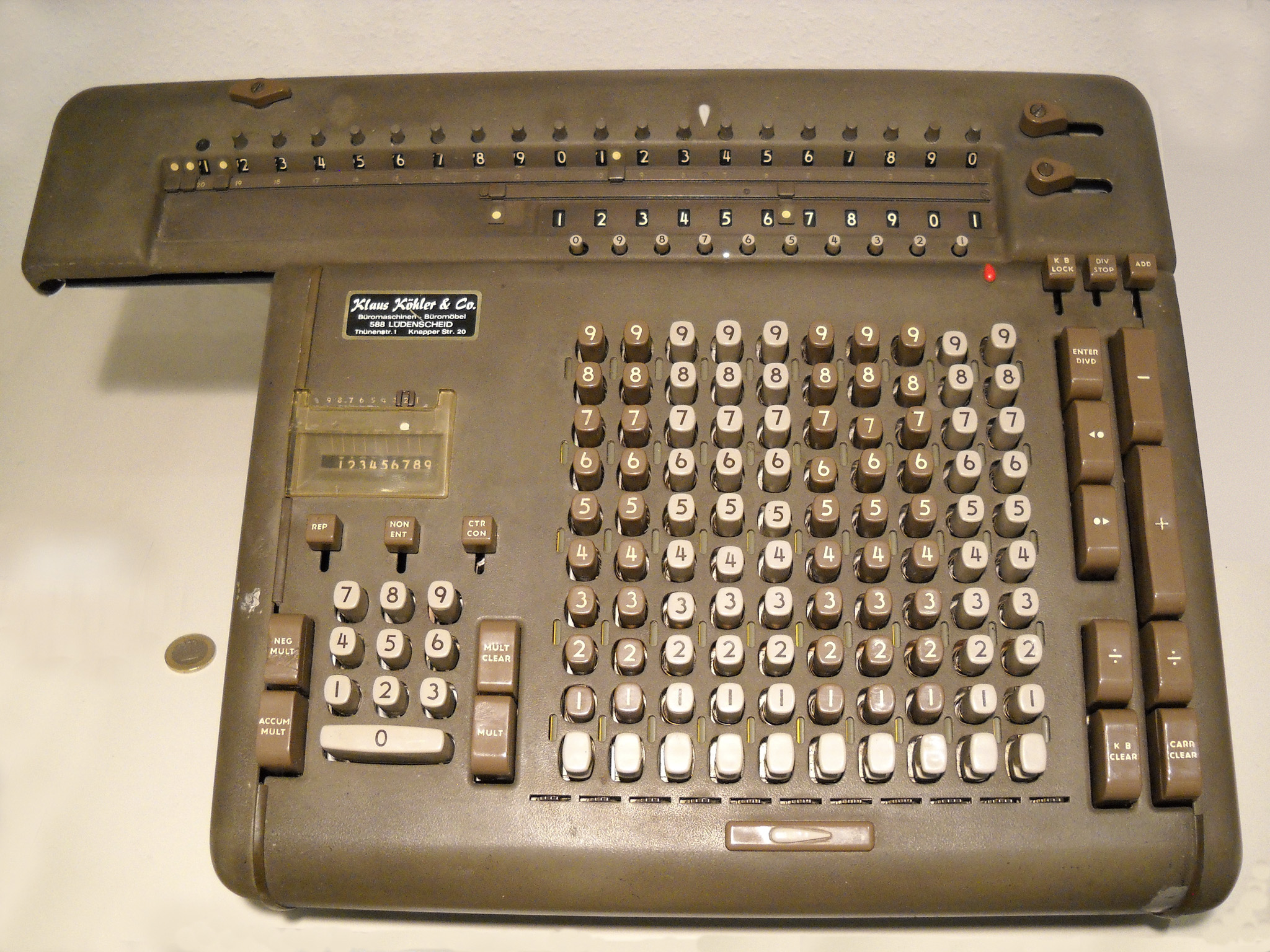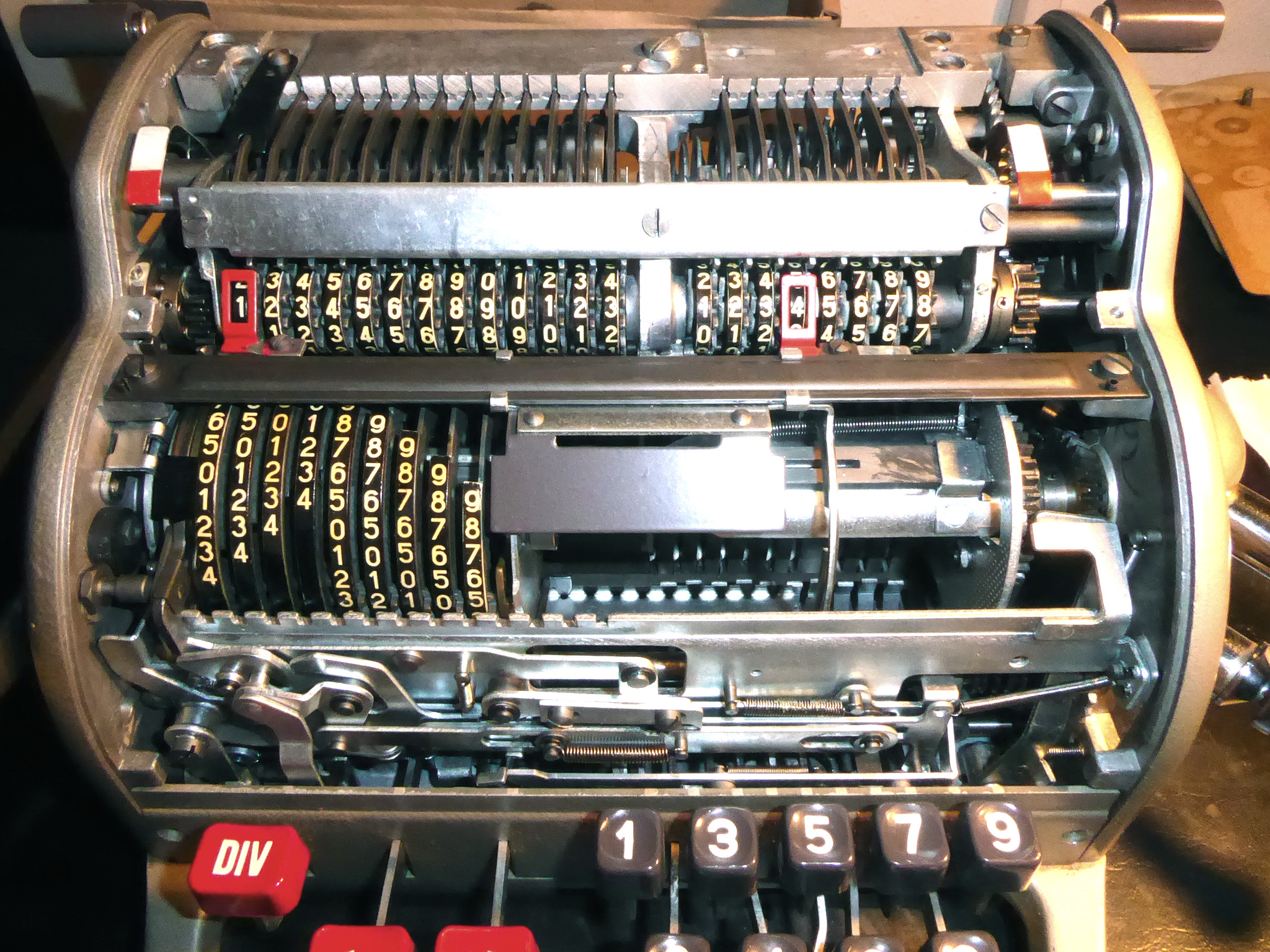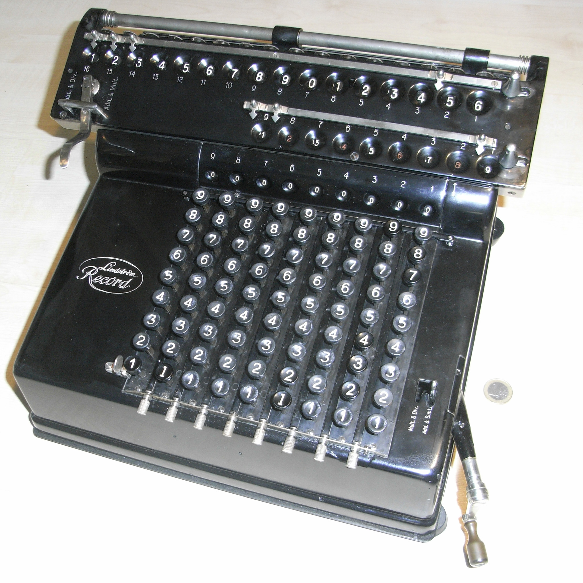Für alle, die nicht so im Thema sind, hier die Erklärung einiger Fachbegriffe: AdditionsmodusDas Drücken der „Plus“-Taste zählt nicht nur den Wert der Eingabe zum Resultatwerk hinzu, sondern KapazitätIm Zusammenhang mit Rechenmaschinen nur ein anderes Wort für die Stellenzahl der Werke ... klingt aber gelehrter. Schalt(werks)prinzipienJede Zifferneingabe in eine Rechenmaschine muss erst irgendwie erfasst (und meist auch gespeichert) werden. Danach muss der gewünschte Wert natürlich auch seinen Weg zum Ergebnis finden. Zusätzliche Links:Youtube-Video: Staffelwalze (Schema) „Werke“ZehnerübertragWas passiert, wenn in einer Stelle "über die Neun hinaus" addiert werden muss, erklärt die Wikipedia ganz ausführlich. Aber nur die englische Wikipedia erklärt auch, warum die Mechanisierung dieses Vorgangs die größte Herausforderung beim Bau von Rechenmaschinen war. Weitere Erklärungen gewünscht? |