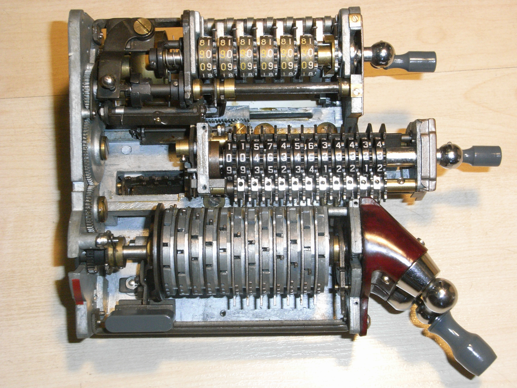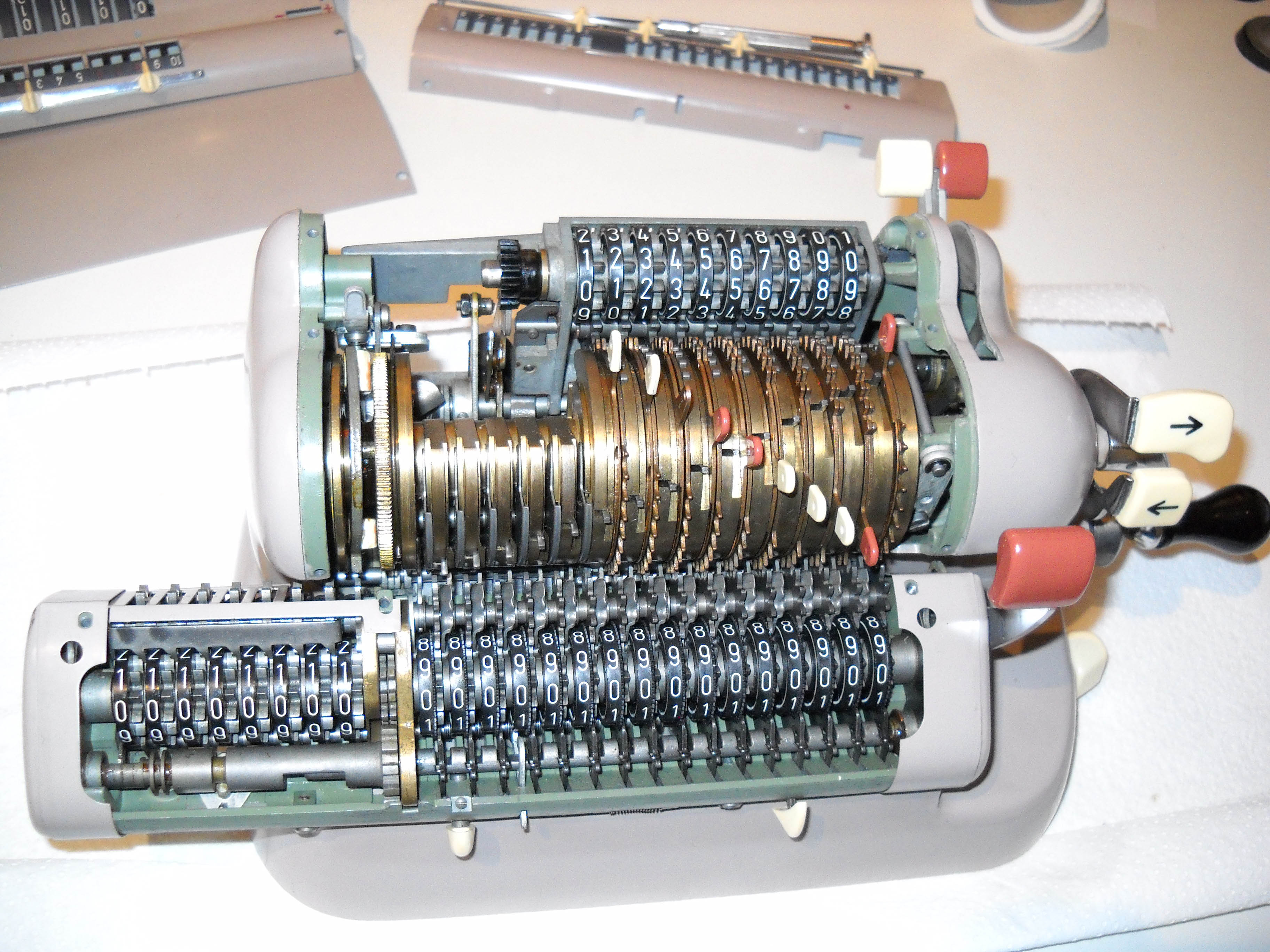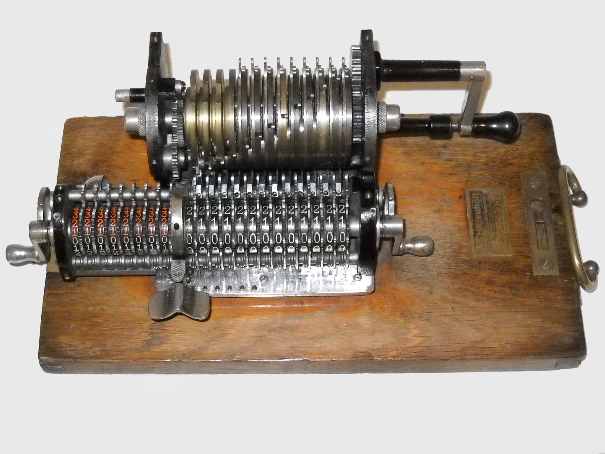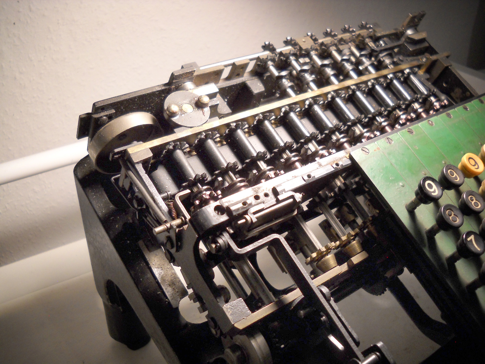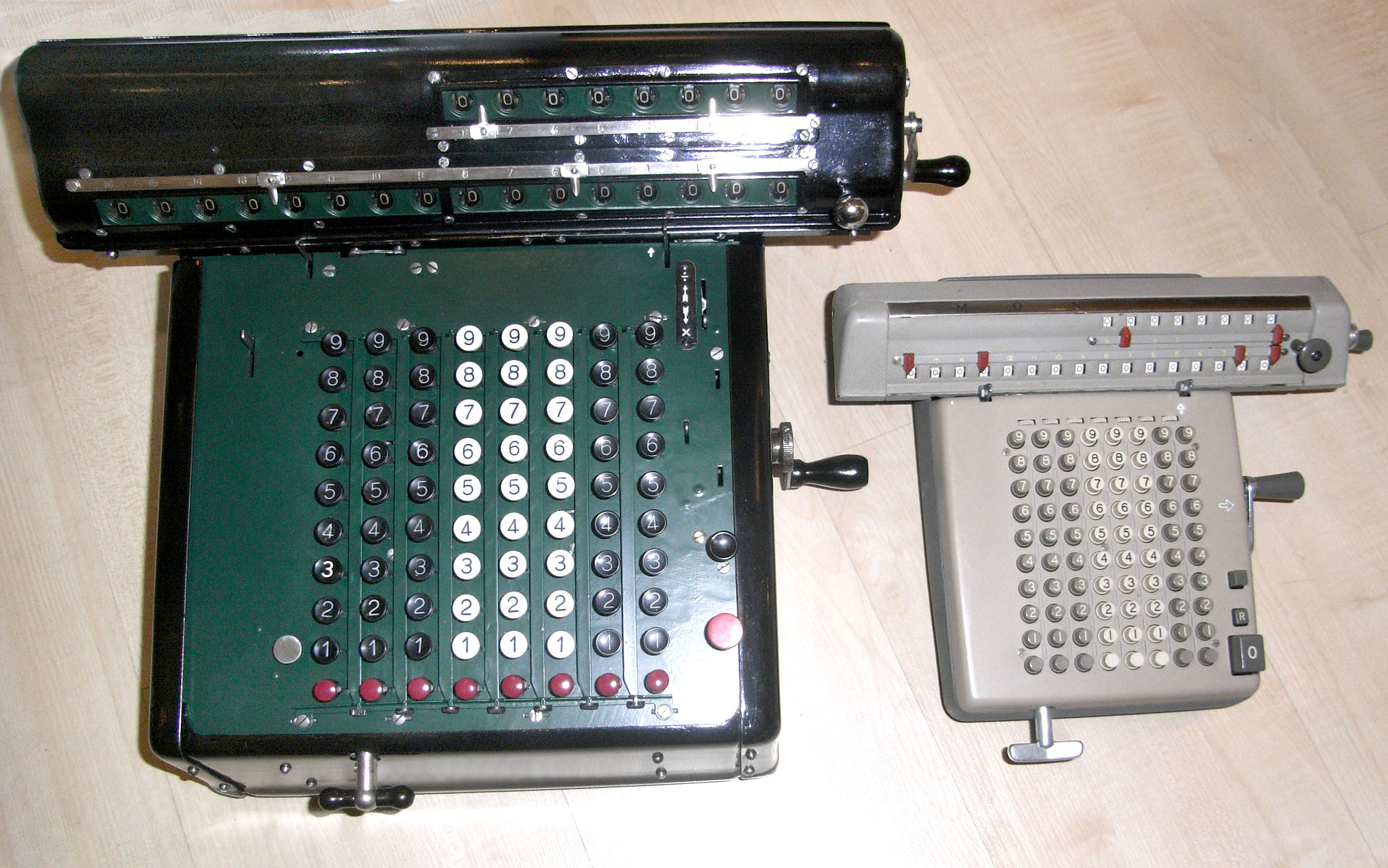 Für alle, die nicht so im Thema sind, hier die Erklärung einiger Fachbegriffe: AdditionsmodusDas Drücken der „Plus“-Taste zählt nicht nur den Wert der Eingabe zum Resultatwerk hinzu, sondern KapazitätIm Zusammenhang mit Rechenmaschinen nur ein anderes Wort für die Stellenzahl der Werke ... klingt aber gelehrter. Schalt(werks)prinzipienJede Zifferneingabe in eine Rechenmaschine muss erst irgendwie erfasst (und meist auch gespeichert) werden. Danach muss der gewünschte Wert natürlich auch seinen Weg zum Ergebnis finden. Zusätzliche Links:Youtube-Video: Staffelwalze (Schema) „Werke“ZehnerübertragWas passiert, wenn in einer Stelle "über die Neun hinaus" addiert werden muss, erklärt die Wikipedia ganz ausführlich. Aber nur die englische Wikipedia erklärt auch, warum die Mechanisierung dieses Vorgangs die größte Herausforderung beim Bau von Rechenmaschinen war. Weitere Erklärungen gewünscht? |