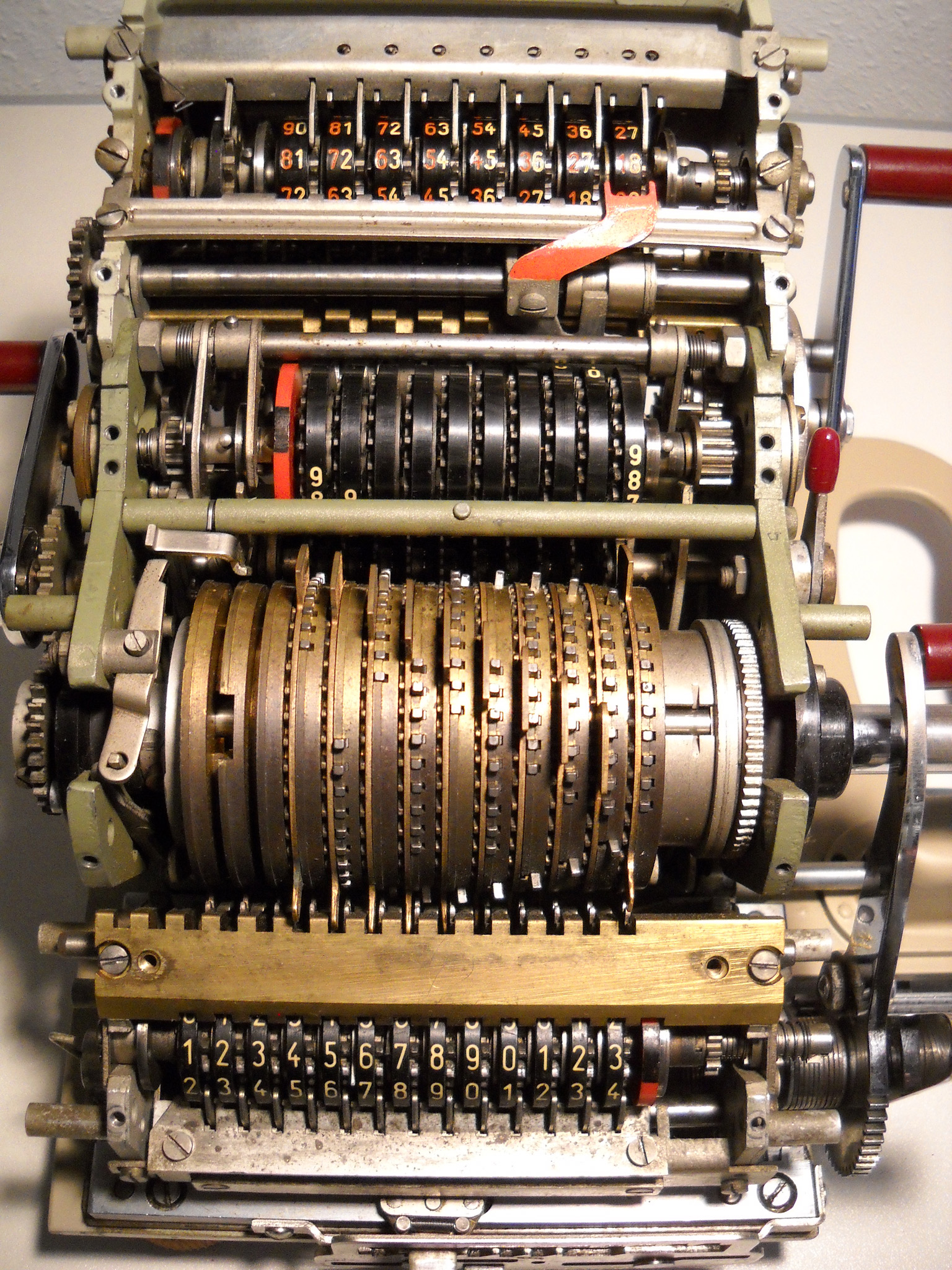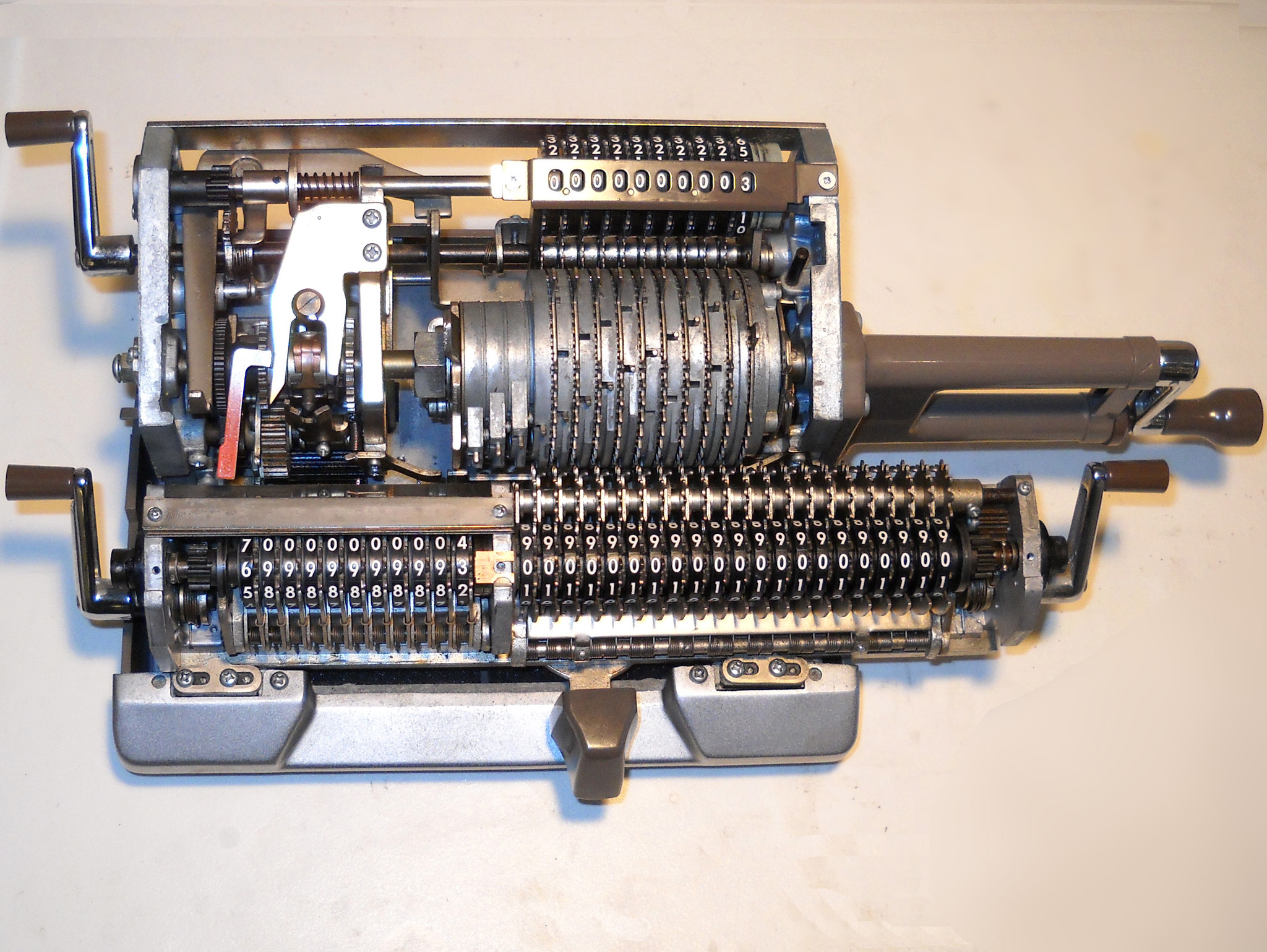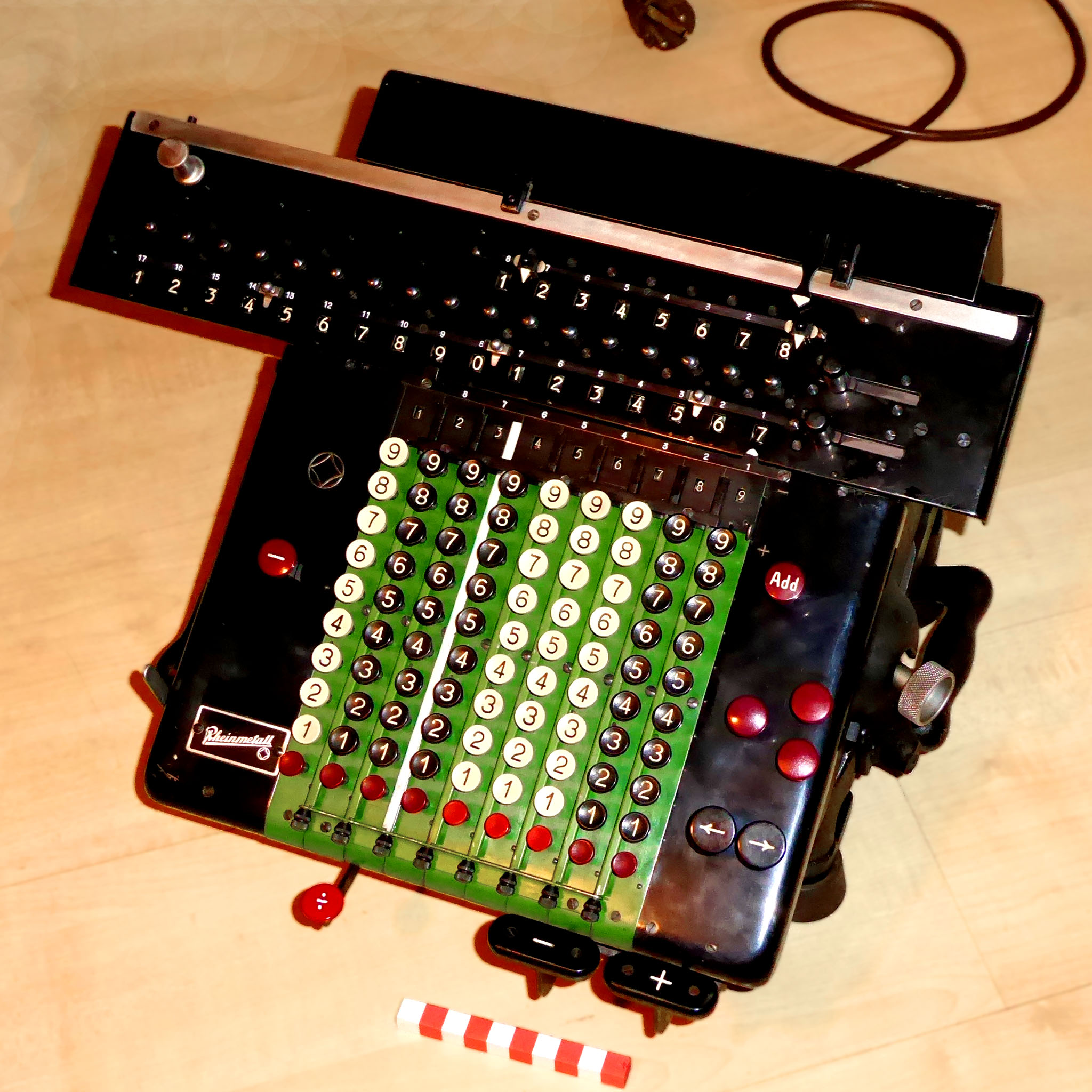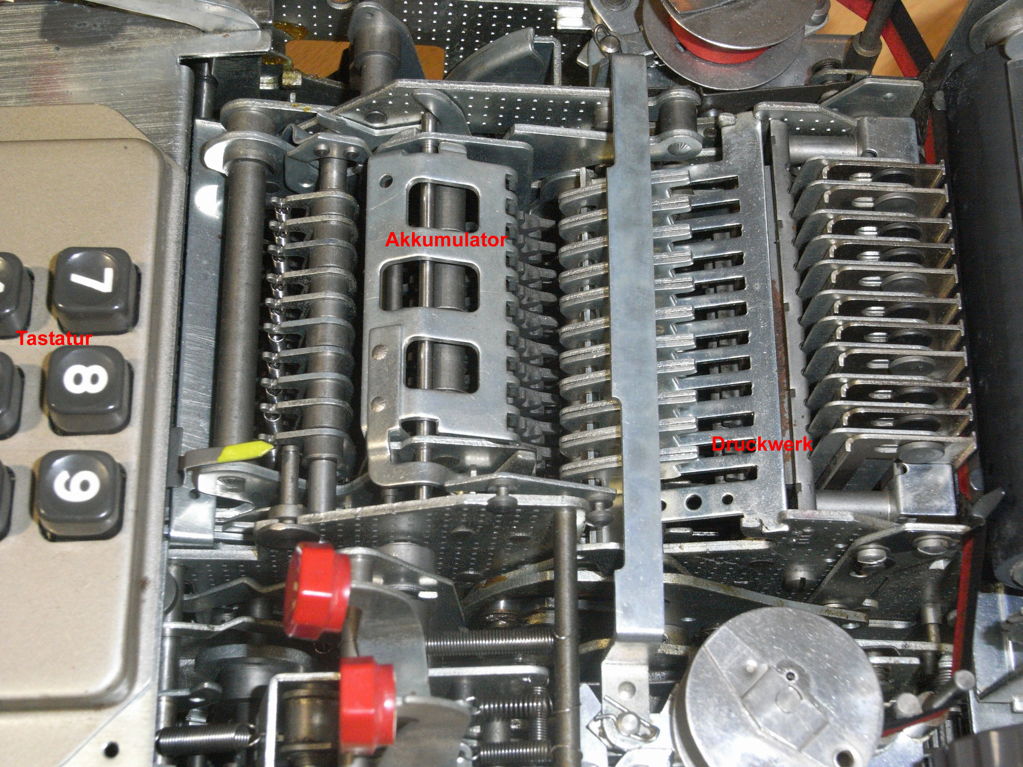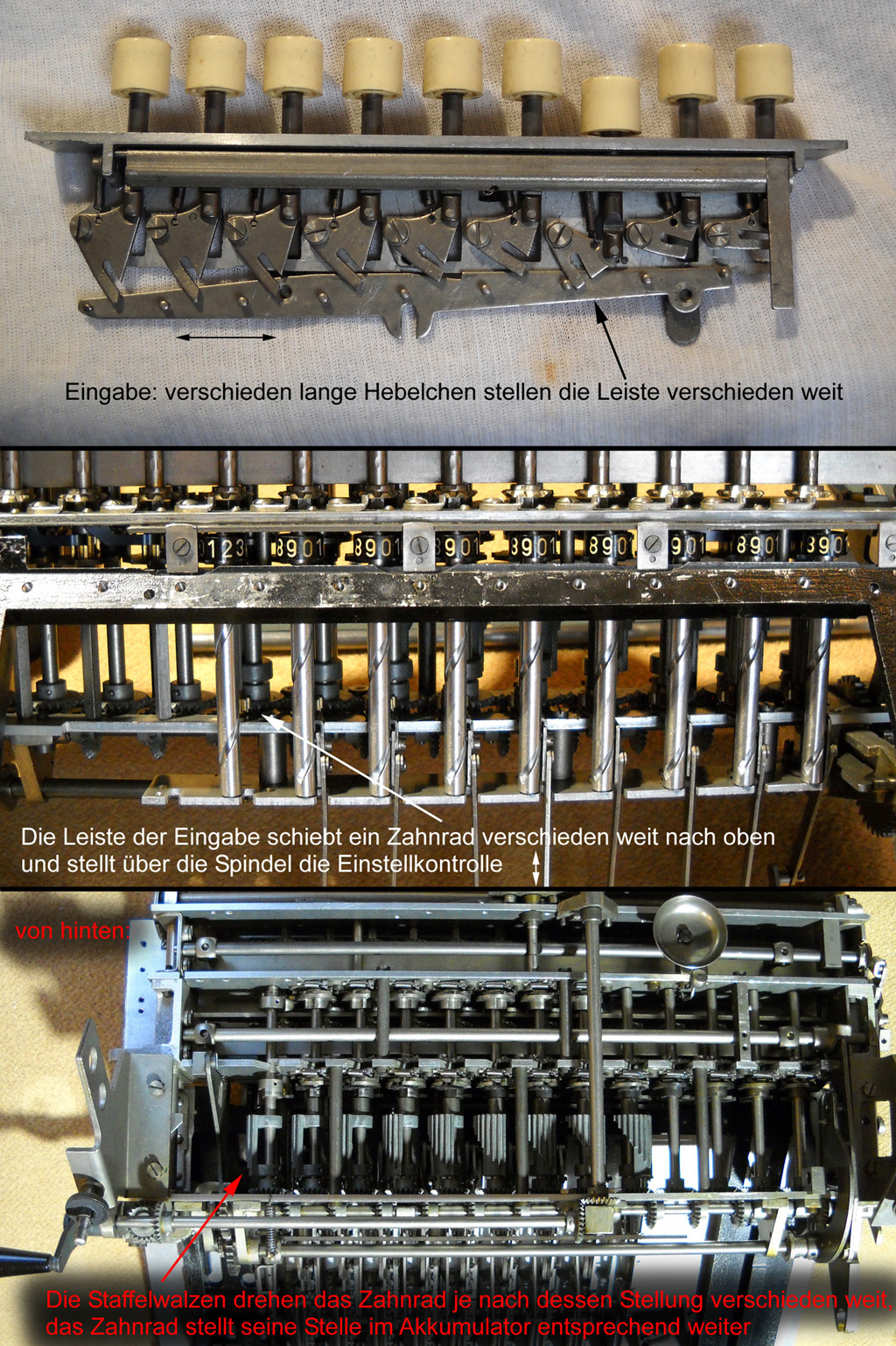 Für alle, die nicht so im Thema sind, hier die Erklärung einiger Fachbegriffe: AdditionsmodusDas Drücken der „Plus“-Taste zählt nicht nur den Wert der Eingabe zum Resultatwerk hinzu, sondern KapazitätIm Zusammenhang mit Rechenmaschinen nur ein anderes Wort für die Stellenzahl der Werke ... klingt aber gelehrter. Schalt(werks)prinzipienJede Zifferneingabe in eine Rechenmaschine muss erst irgendwie erfasst (und meist auch gespeichert) werden. Danach muss der gewünschte Wert natürlich auch seinen Weg zum Ergebnis finden. Zusätzliche Links:Youtube-Video: Staffelwalze (Schema) „Werke“ZehnerübertragWas passiert, wenn in einer Stelle "über die Neun hinaus" addiert werden muss, erklärt die Wikipedia ganz ausführlich. Aber nur die englische Wikipedia erklärt auch, warum die Mechanisierung dieses Vorgangs die größte Herausforderung beim Bau von Rechenmaschinen war. Weitere Erklärungen gewünscht? |