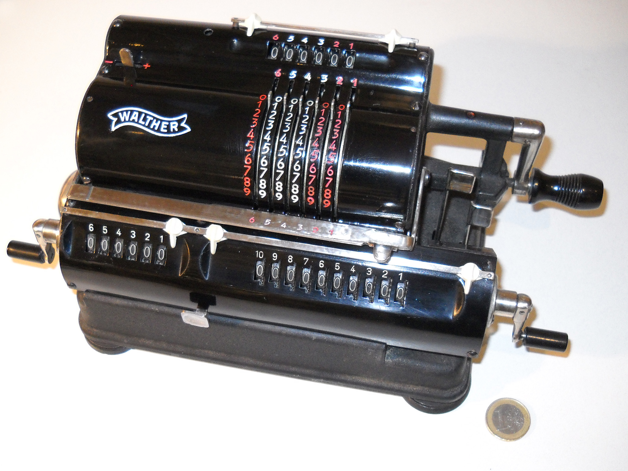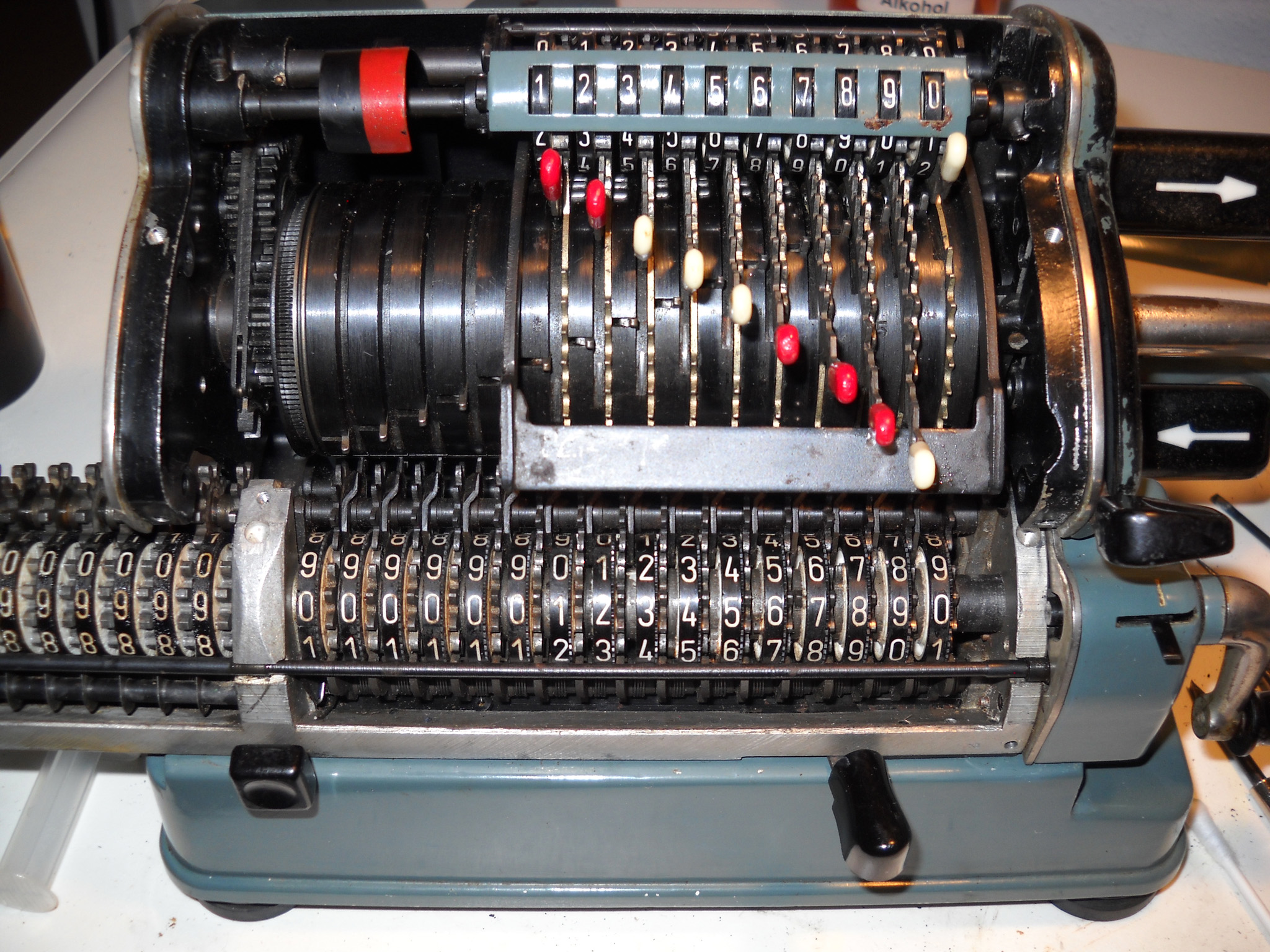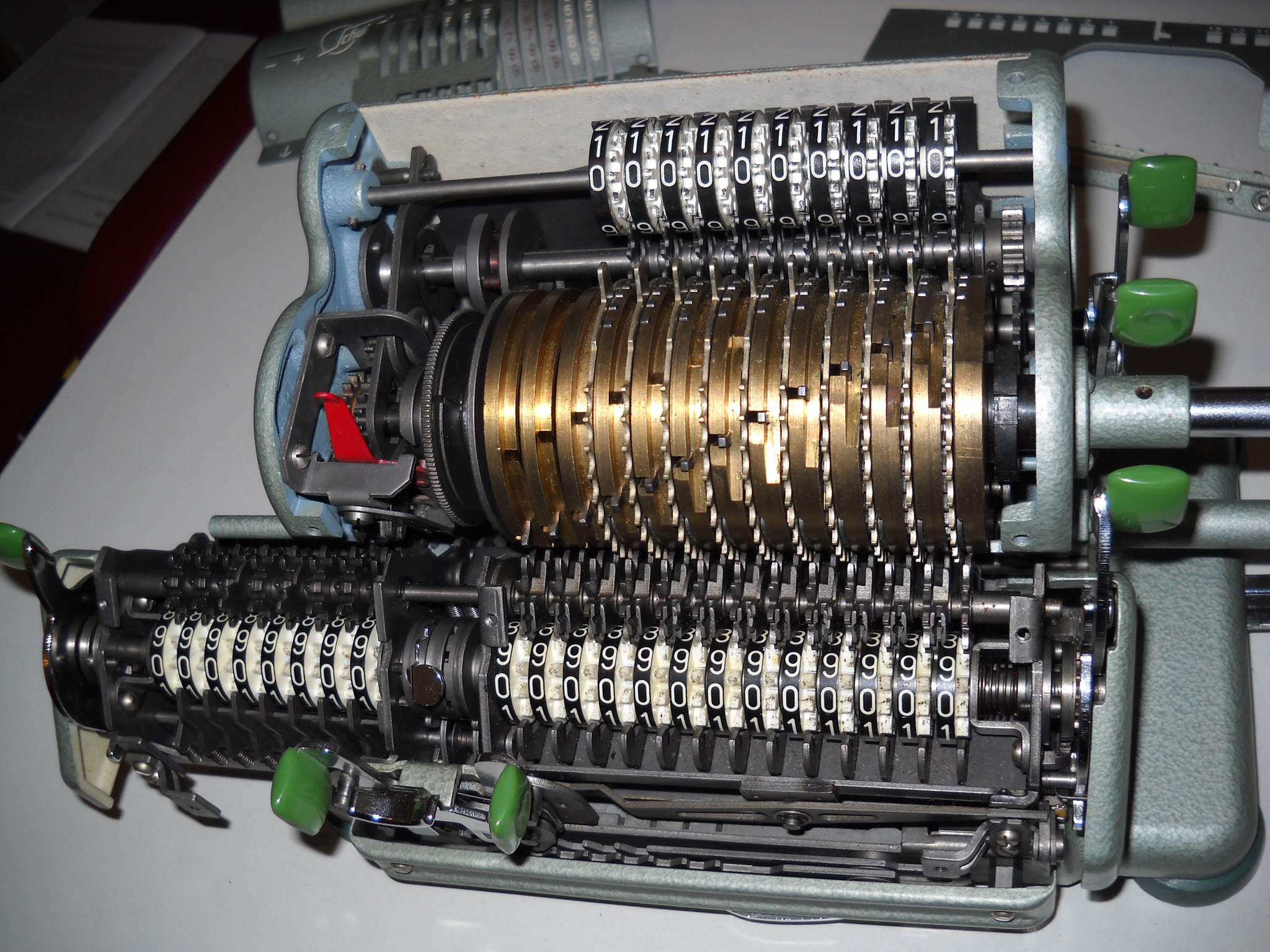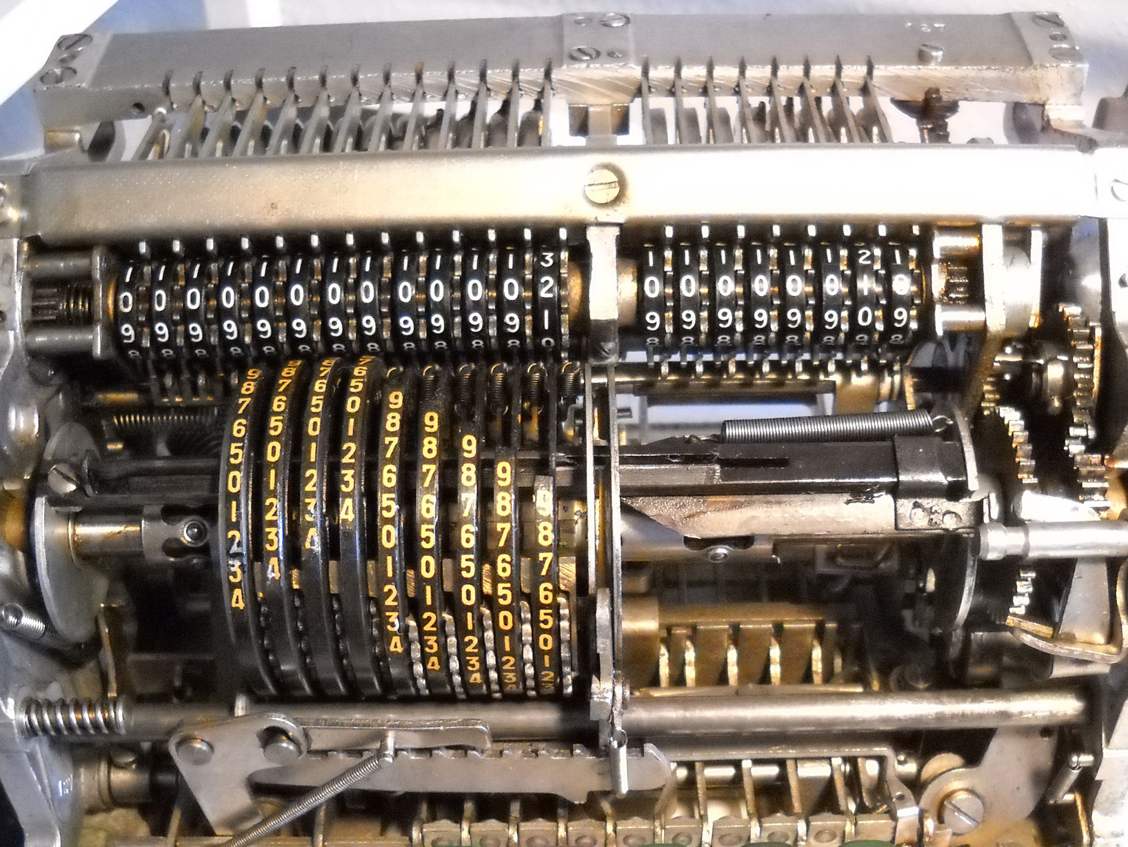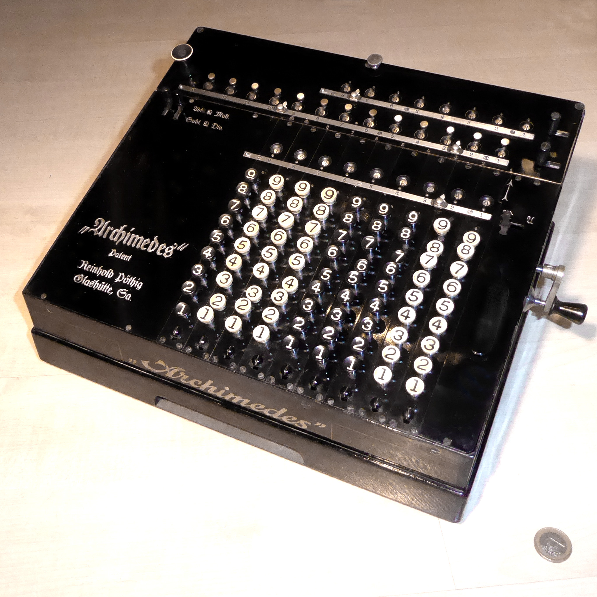 Für alle, die nicht so im Thema sind, hier die Erklärung einiger Fachbegriffe: AdditionsmodusDas Drücken der „Plus“-Taste zählt nicht nur den Wert der Eingabe zum Resultatwerk hinzu, sondern KapazitätIm Zusammenhang mit Rechenmaschinen nur ein anderes Wort für die Stellenzahl der Werke ... klingt aber gelehrter. Schalt(werks)prinzipienJede Zifferneingabe in eine Rechenmaschine muss erst irgendwie erfasst (und meist auch gespeichert) werden. Danach muss der gewünschte Wert natürlich auch seinen Weg zum Ergebnis finden. Zusätzliche Links:Youtube-Video: Staffelwalze (Schema) „Werke“ZehnerübertragWas passiert, wenn in einer Stelle "über die Neun hinaus" addiert werden muss, erklärt die Wikipedia ganz ausführlich. Aber nur die englische Wikipedia erklärt auch, warum die Mechanisierung dieses Vorgangs die größte Herausforderung beim Bau von Rechenmaschinen war. Weitere Erklärungen gewünscht? |