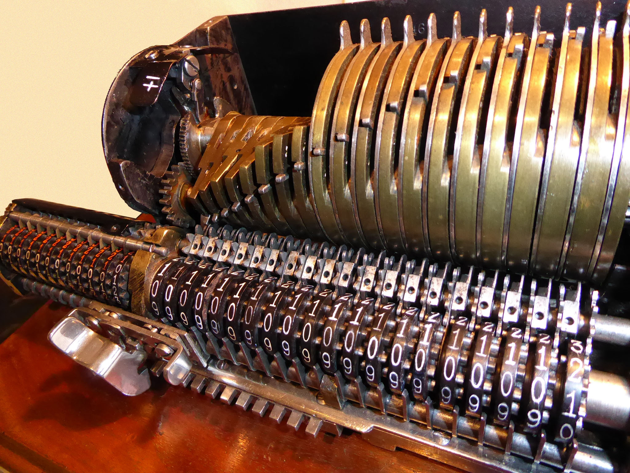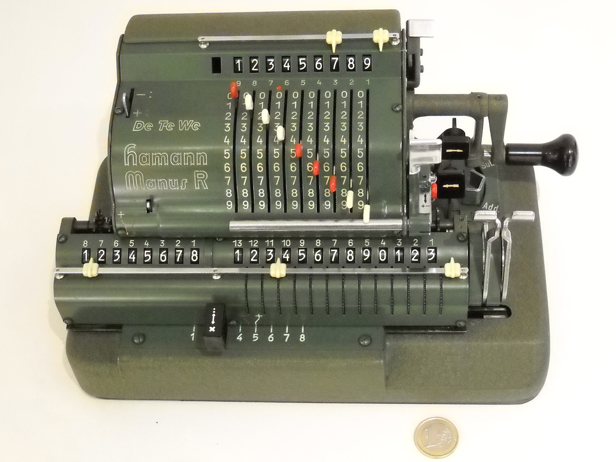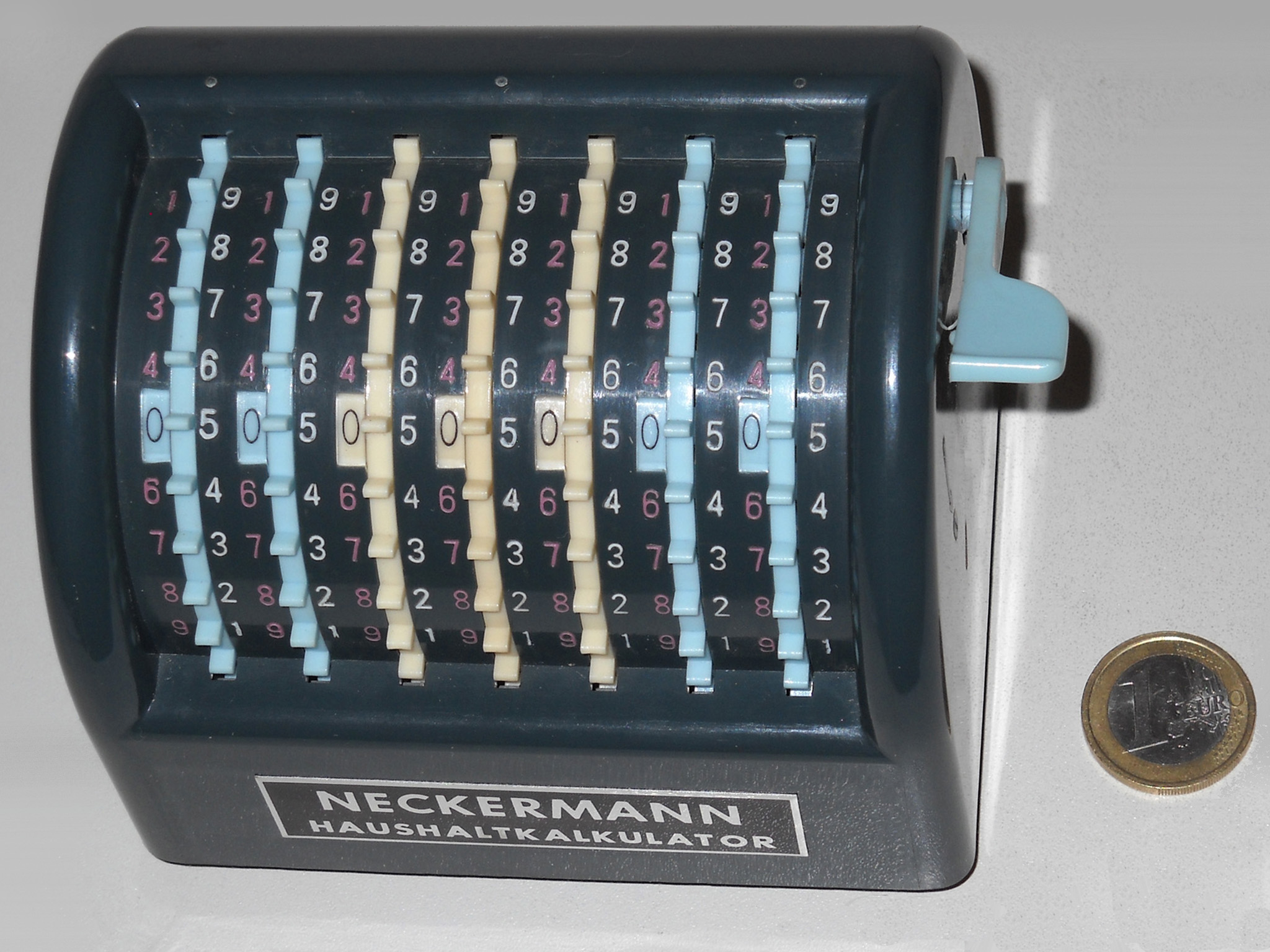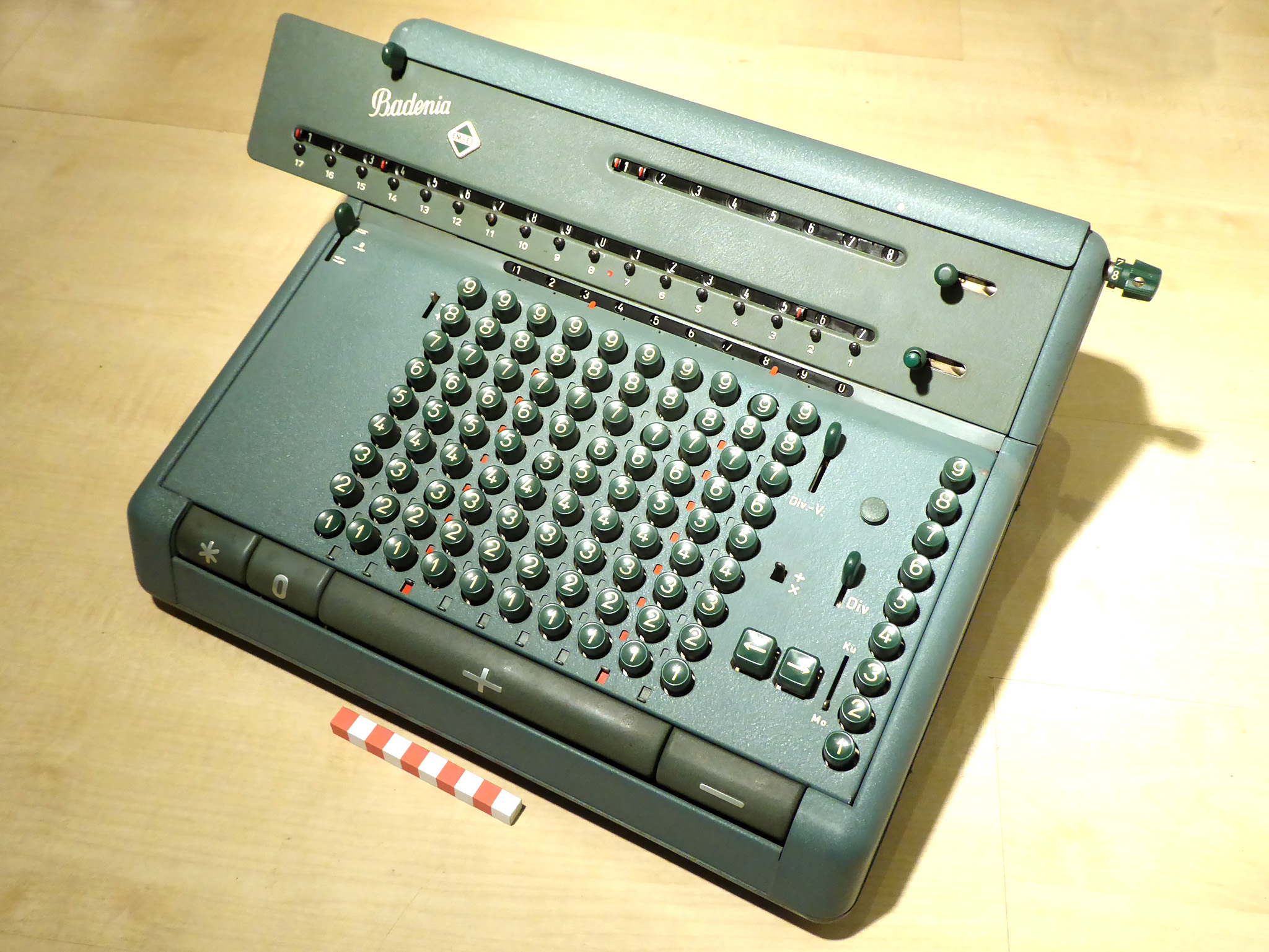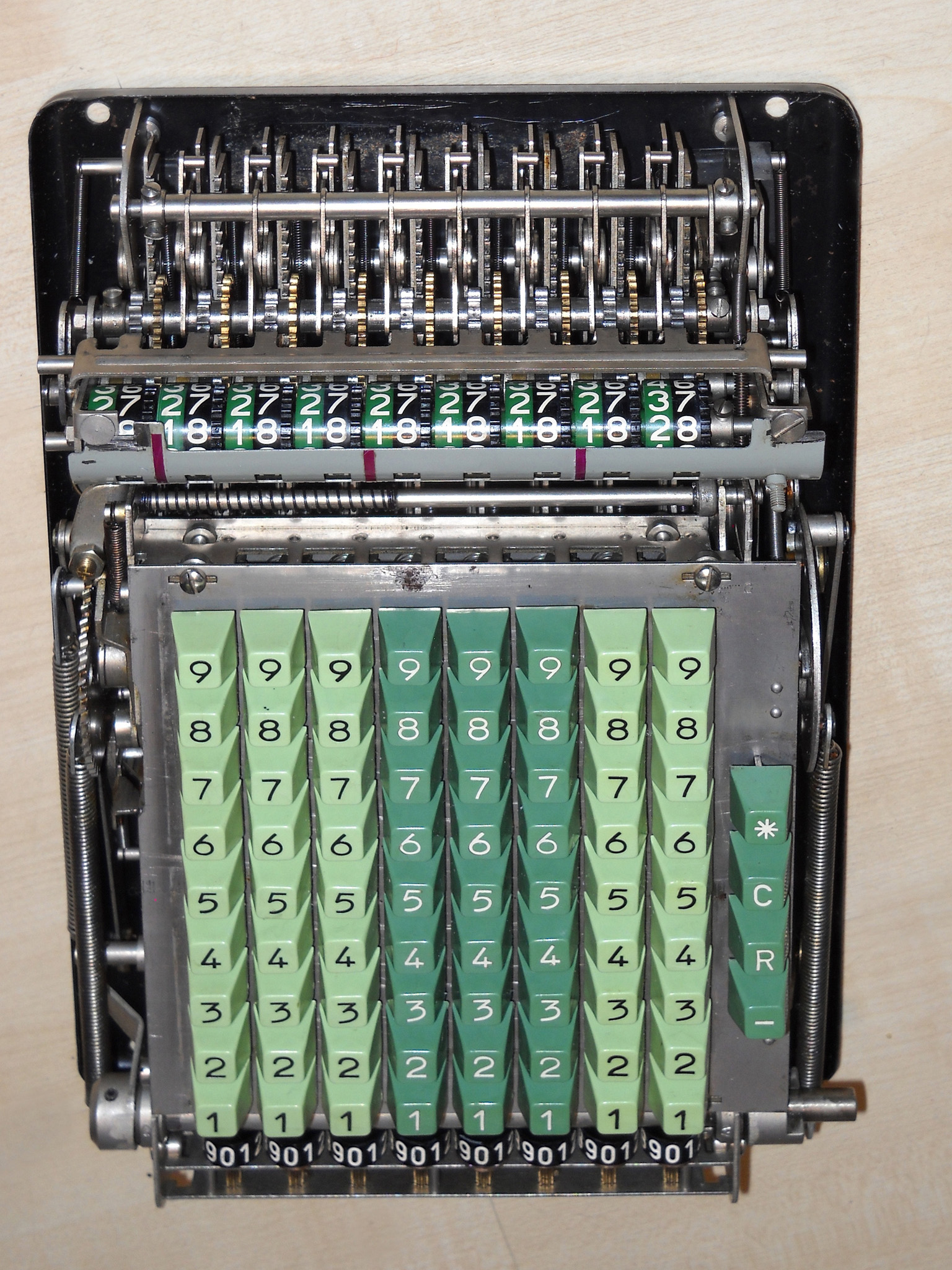 Für alle, die nicht so im Thema sind, hier die Erklärung einiger Fachbegriffe: AdditionsmodusDas Drücken der „Plus“-Taste zählt nicht nur den Wert der Eingabe zum Resultatwerk hinzu, sondern KapazitätIm Zusammenhang mit Rechenmaschinen nur ein anderes Wort für die Stellenzahl der Werke ... klingt aber gelehrter. Schalt(werks)prinzipienJede Zifferneingabe in eine Rechenmaschine muss erst irgendwie erfasst (und meist auch gespeichert) werden. Danach muss der gewünschte Wert natürlich auch seinen Weg zum Ergebnis finden. Zusätzliche Links:Youtube-Video: Staffelwalze (Schema) „Werke“ZehnerübertragWas passiert, wenn in einer Stelle "über die Neun hinaus" addiert werden muss, erklärt die Wikipedia ganz ausführlich. Aber nur die englische Wikipedia erklärt auch, warum die Mechanisierung dieses Vorgangs die größte Herausforderung beim Bau von Rechenmaschinen war. Weitere Erklärungen gewünscht? |