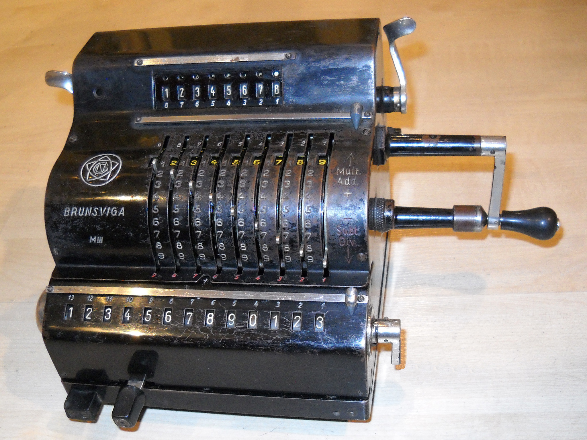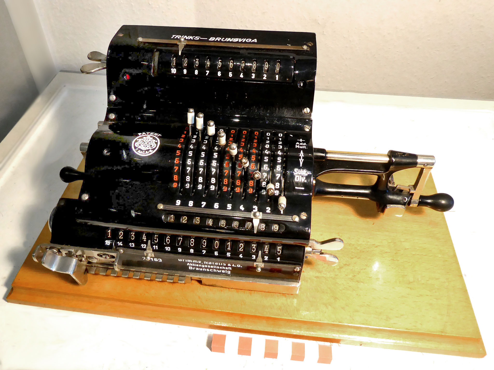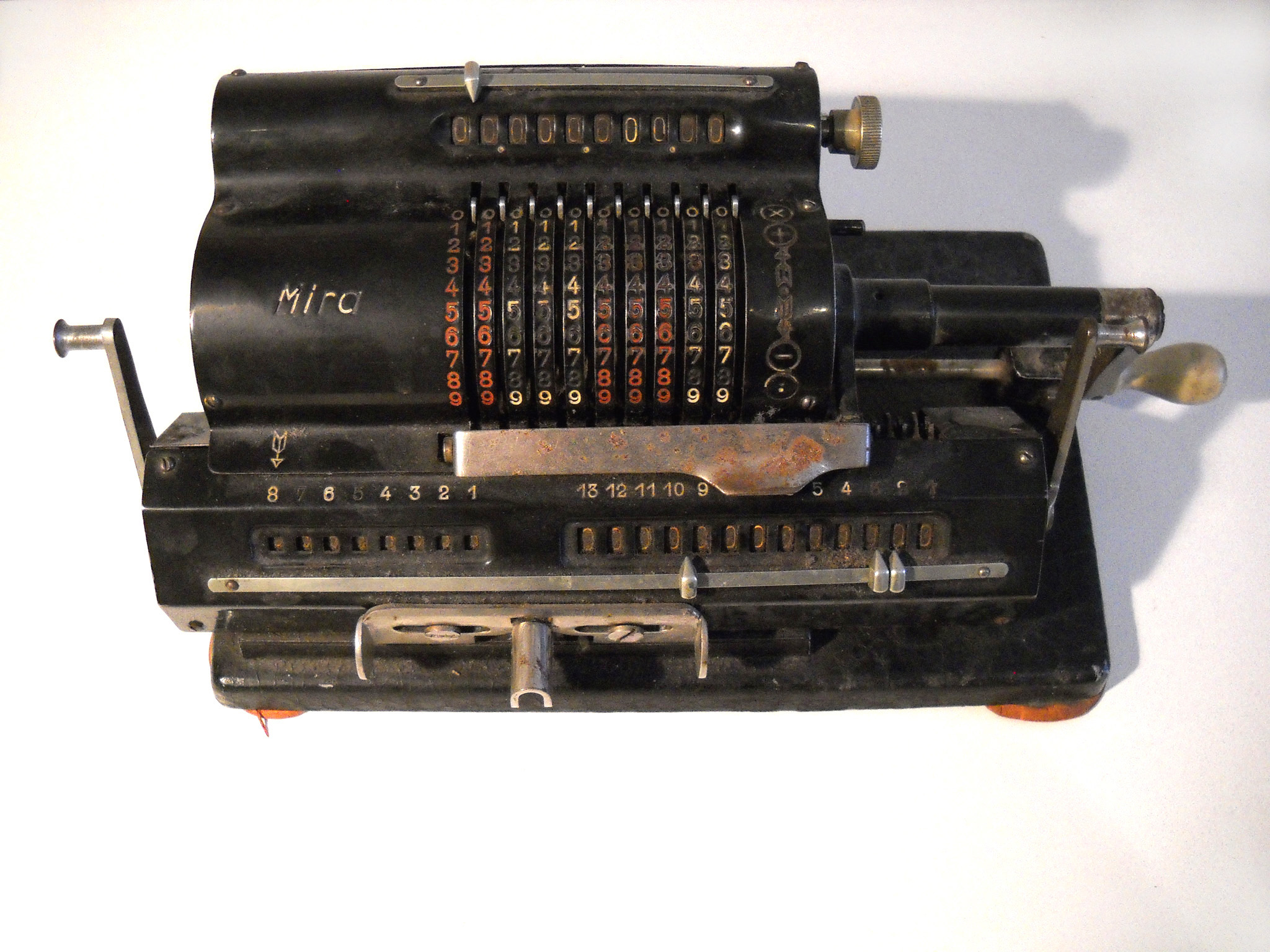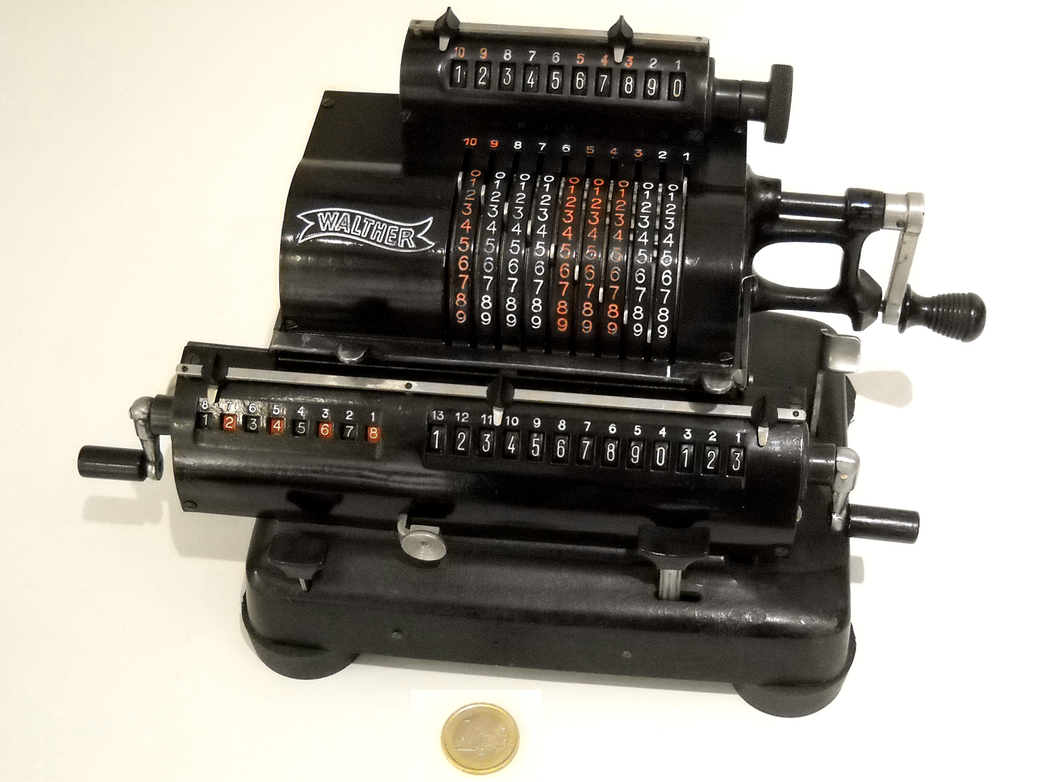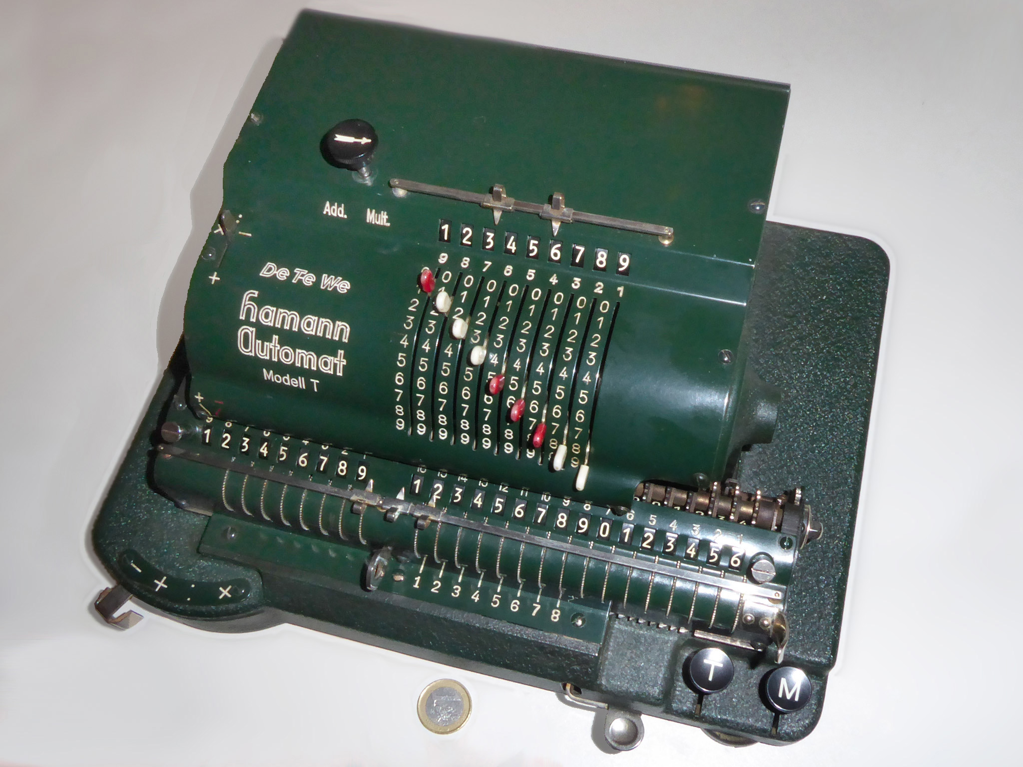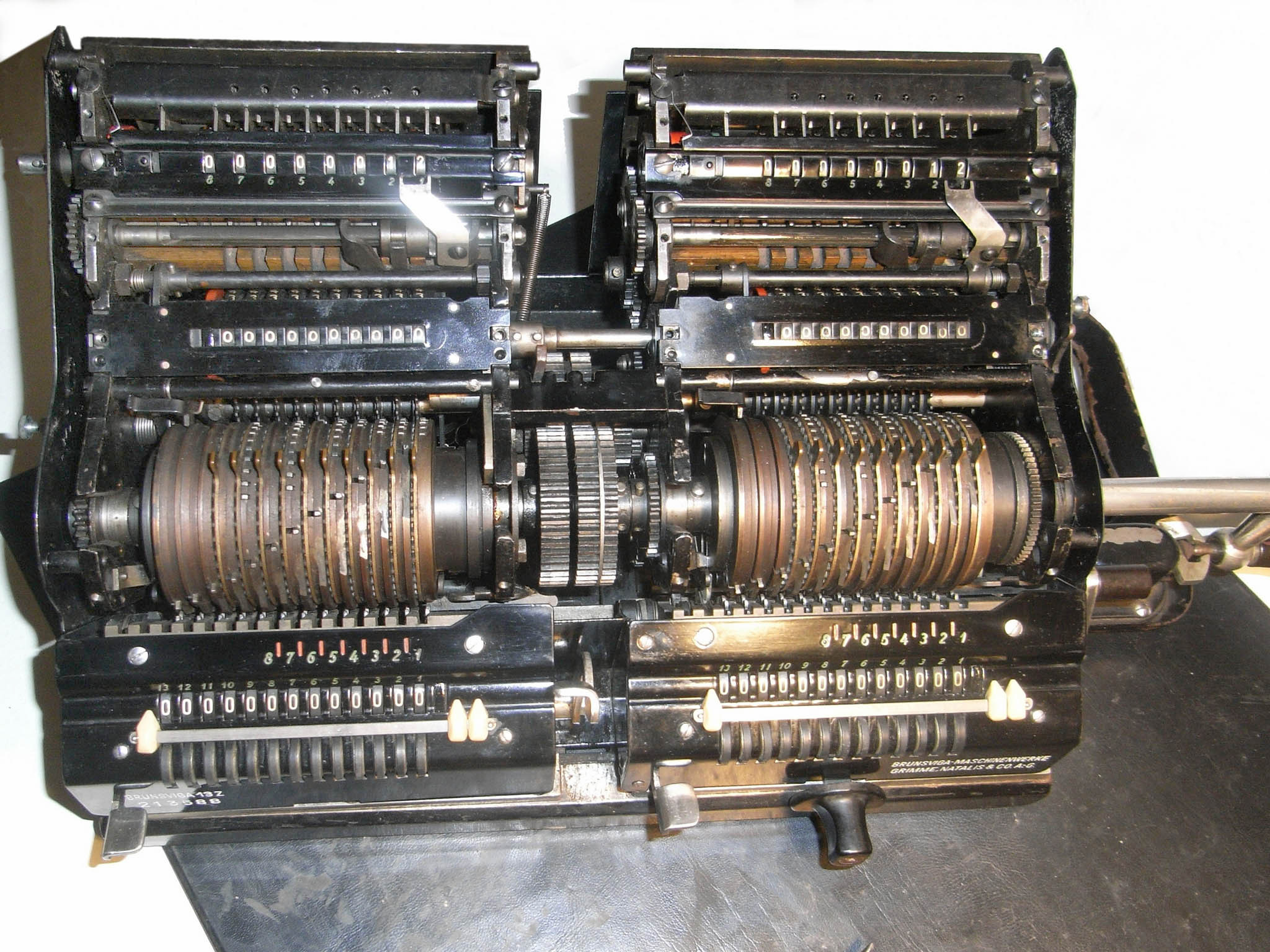 Für alle, die nicht so im Thema sind, hier die Erklärung einiger Fachbegriffe: AdditionsmodusDas Drücken der „Plus“-Taste zählt nicht nur den Wert der Eingabe zum Resultatwerk hinzu, sondern KapazitätIm Zusammenhang mit Rechenmaschinen nur ein anderes Wort für die Stellenzahl der Werke ... klingt aber gelehrter. Schalt(werks)prinzipienJede Zifferneingabe in eine Rechenmaschine muss erst irgendwie erfasst (und meist auch gespeichert) werden. Danach muss der gewünschte Wert natürlich auch seinen Weg zum Ergebnis finden. Zusätzliche Links:Youtube-Video: Staffelwalze (Schema) „Werke“ZehnerübertragWas passiert, wenn in einer Stelle "über die Neun hinaus" addiert werden muss, erklärt die Wikipedia ganz ausführlich. Aber nur die englische Wikipedia erklärt auch, warum die Mechanisierung dieses Vorgangs die größte Herausforderung beim Bau von Rechenmaschinen war. Weitere Erklärungen gewünscht? |