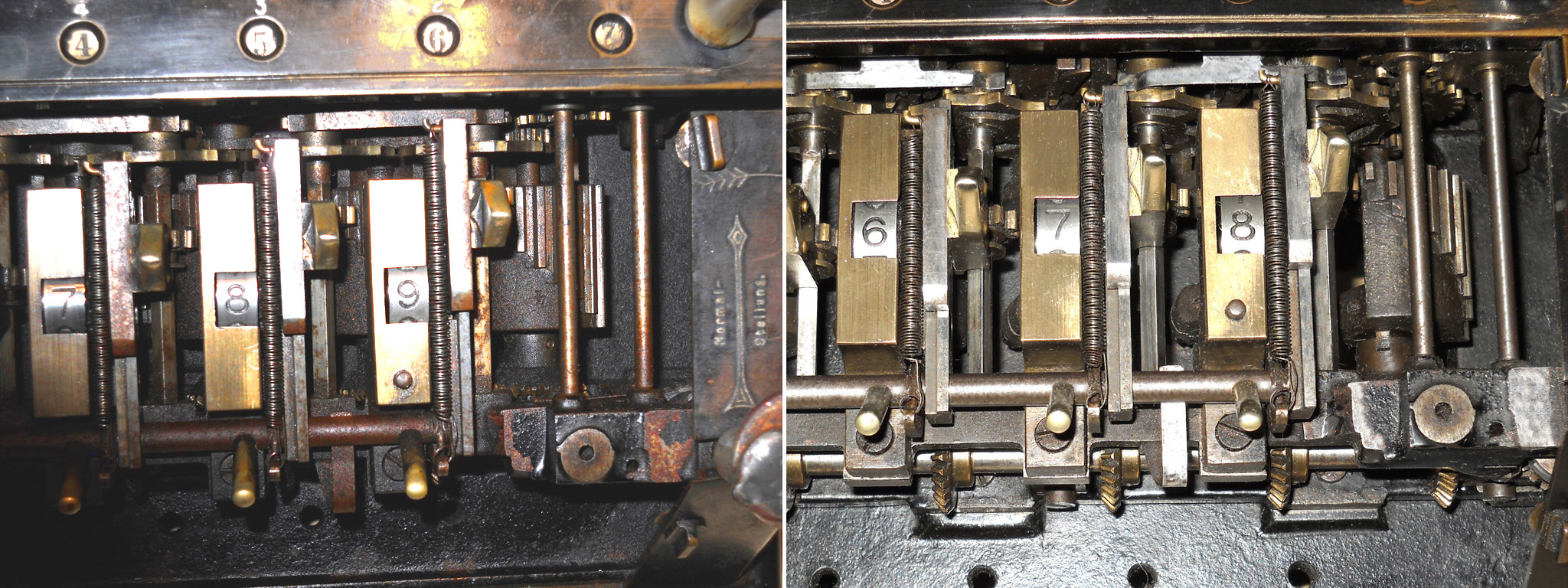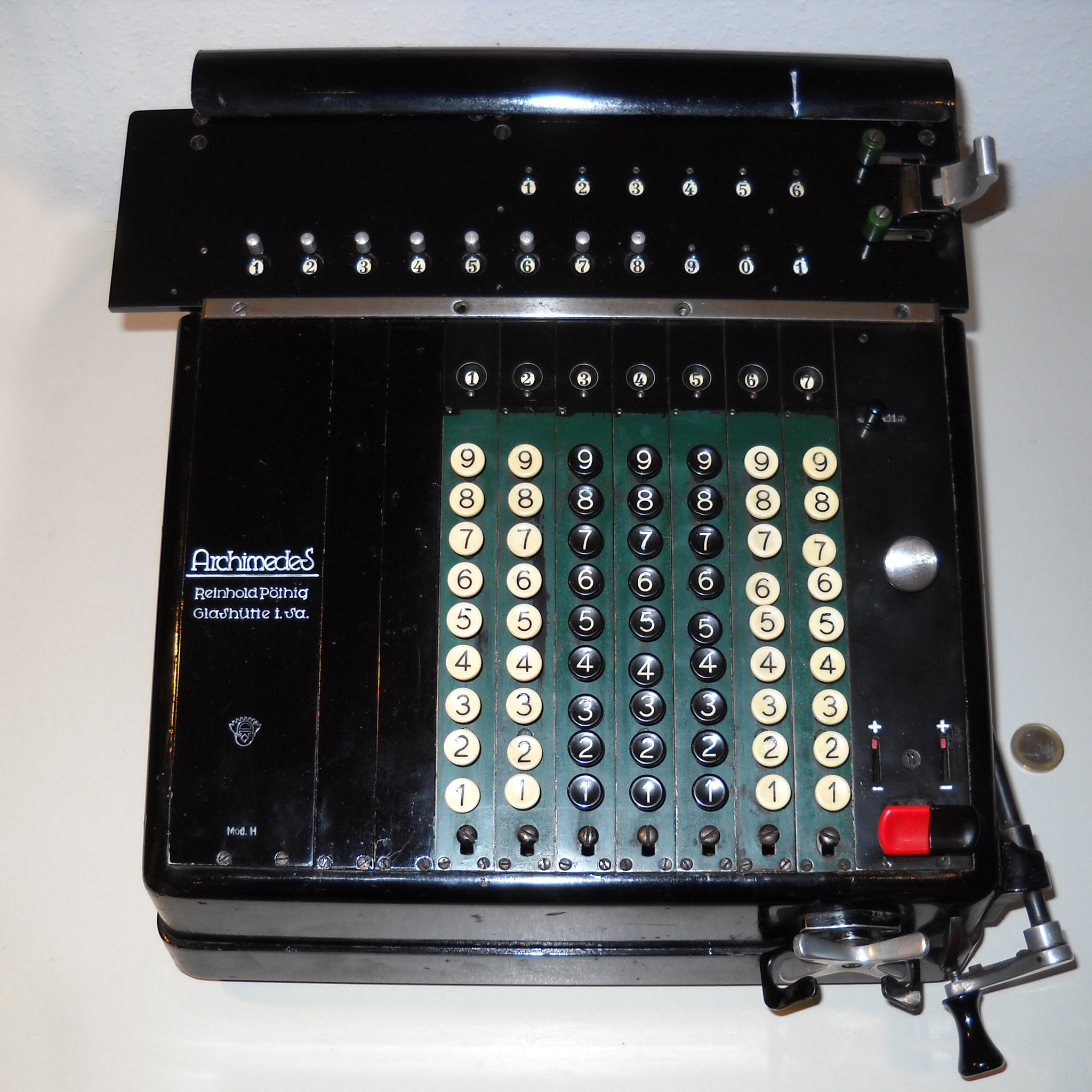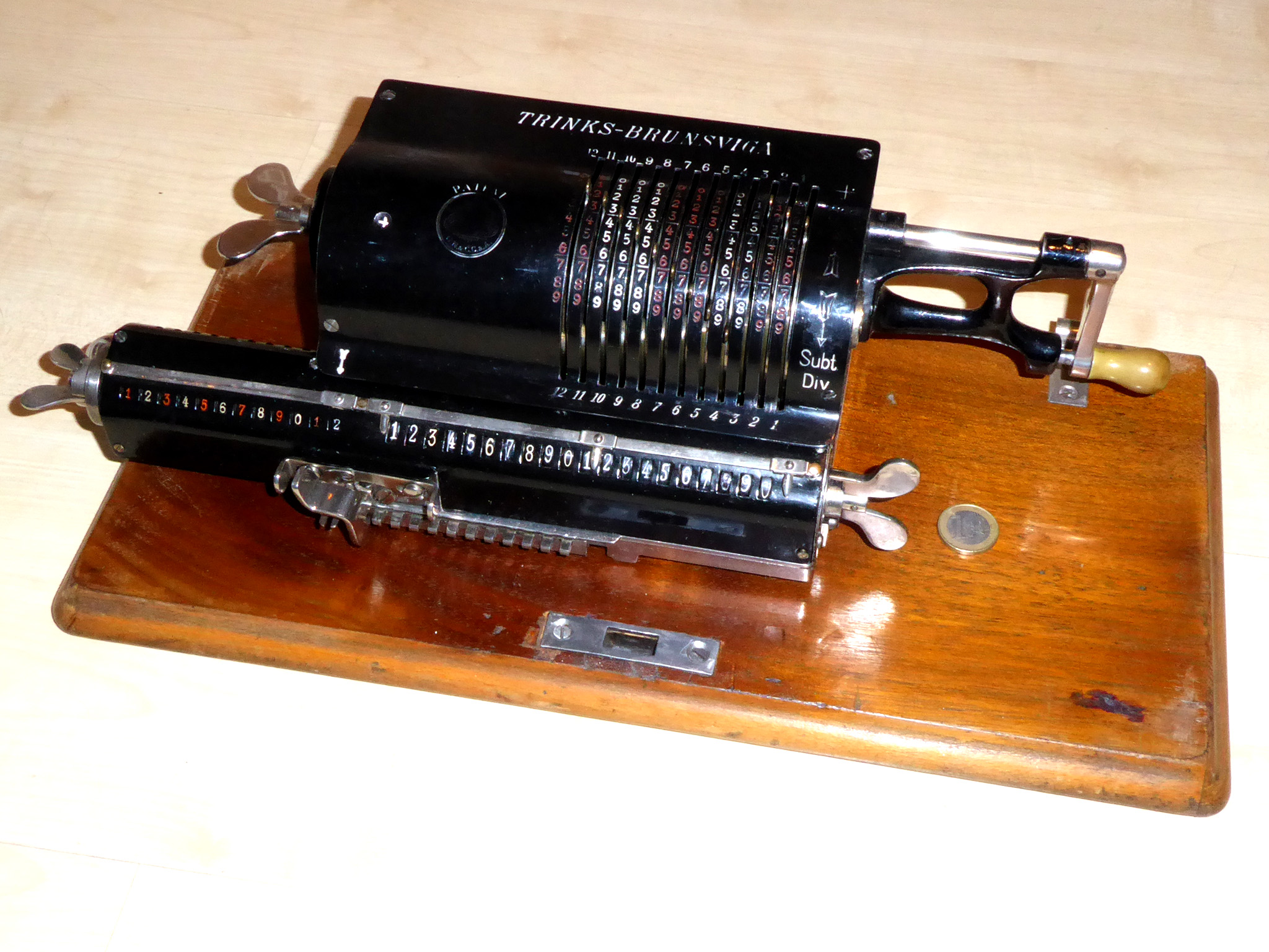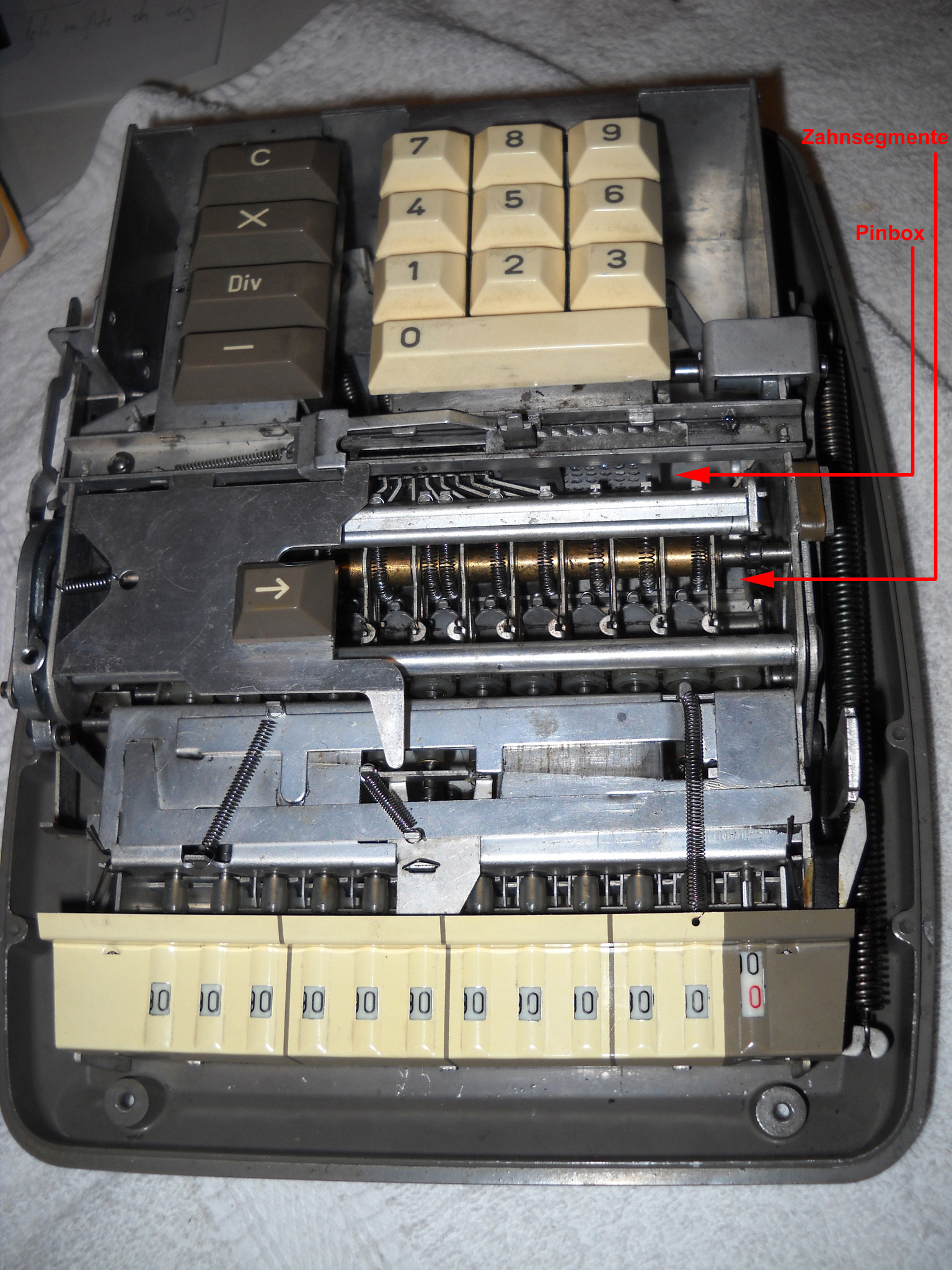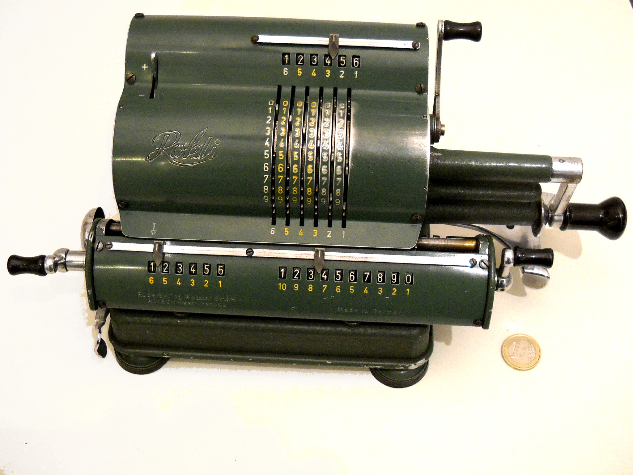 Für alle, die nicht so im Thema sind, hier die Erklärung einiger Fachbegriffe: AdditionsmodusDas Drücken der „Plus“-Taste zählt nicht nur den Wert der Eingabe zum Resultatwerk hinzu, sondern KapazitätIm Zusammenhang mit Rechenmaschinen nur ein anderes Wort für die Stellenzahl der Werke ... klingt aber gelehrter. Schalt(werks)prinzipienJede Zifferneingabe in eine Rechenmaschine muss erst irgendwie erfasst (und meist auch gespeichert) werden. Danach muss der gewünschte Wert natürlich auch seinen Weg zum Ergebnis finden. Zusätzliche Links:Youtube-Video: Staffelwalze (Schema) „Werke“ZehnerübertragWas passiert, wenn in einer Stelle "über die Neun hinaus" addiert werden muss, erklärt die Wikipedia ganz ausführlich. Aber nur die englische Wikipedia erklärt auch, warum die Mechanisierung dieses Vorgangs die größte Herausforderung beim Bau von Rechenmaschinen war. Weitere Erklärungen gewünscht? |