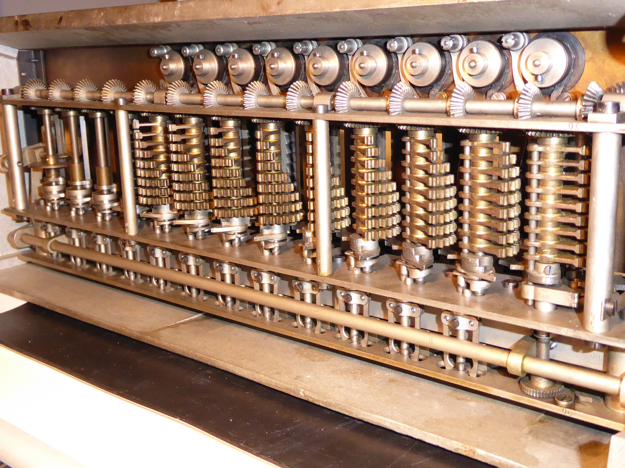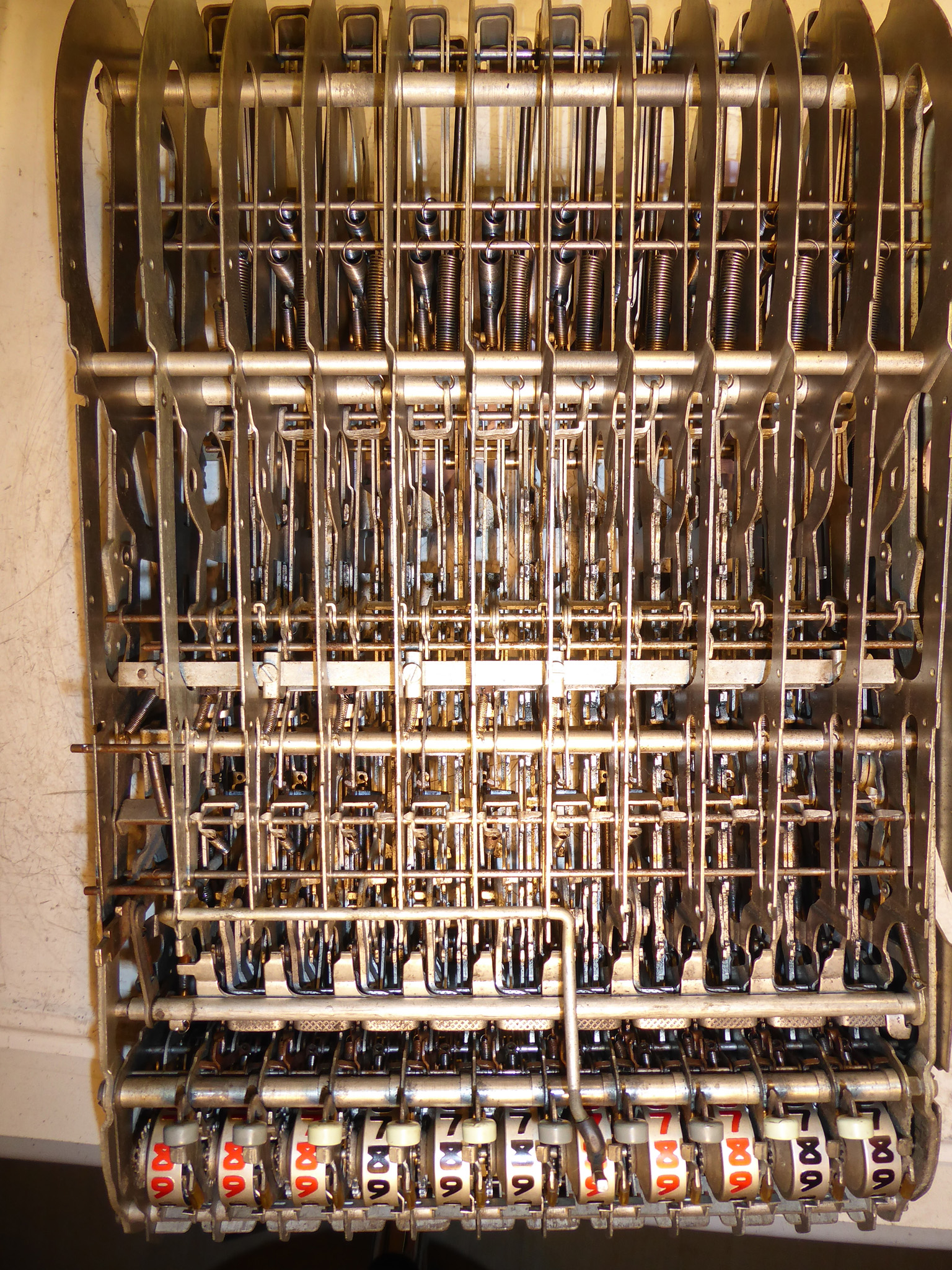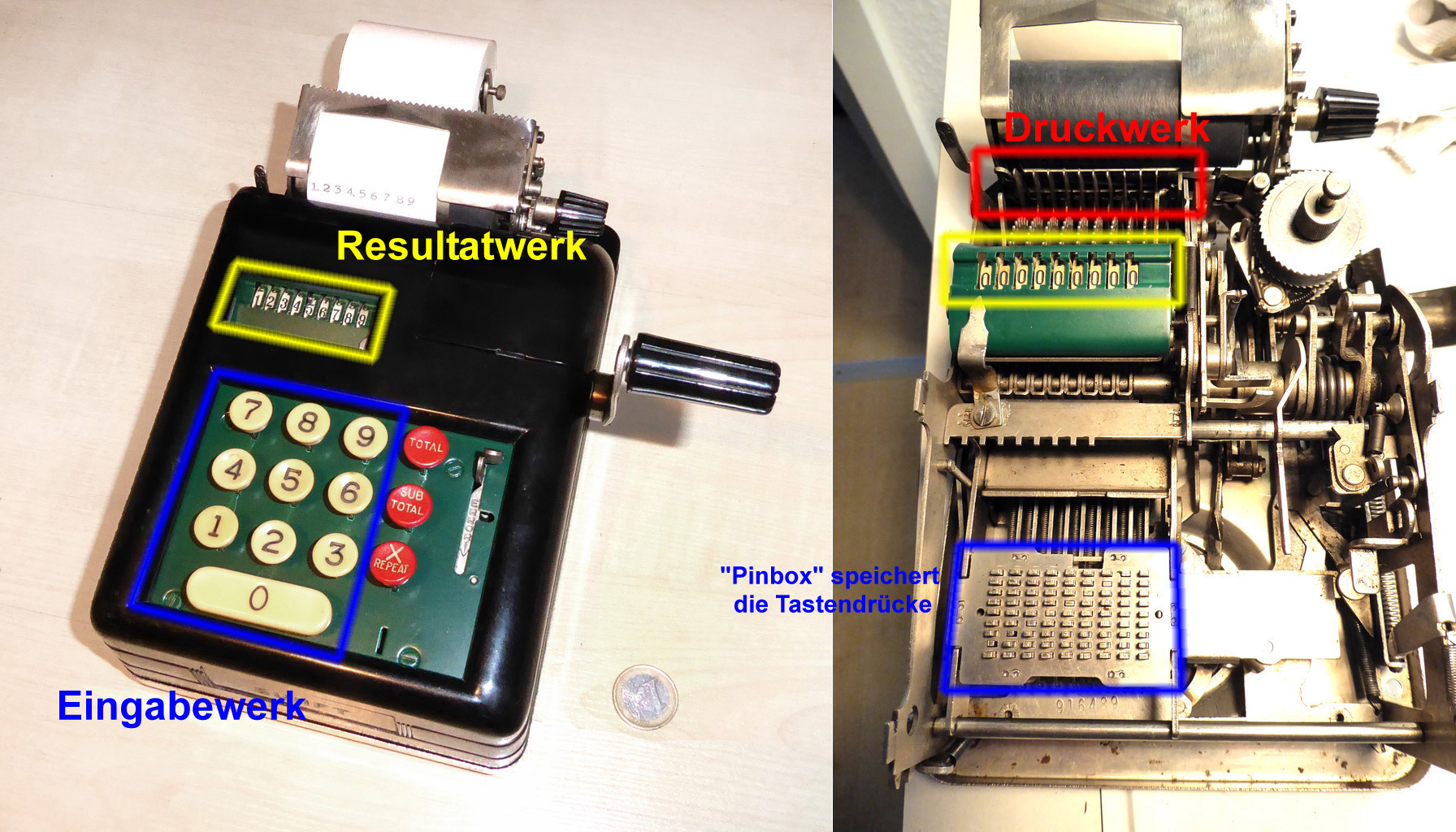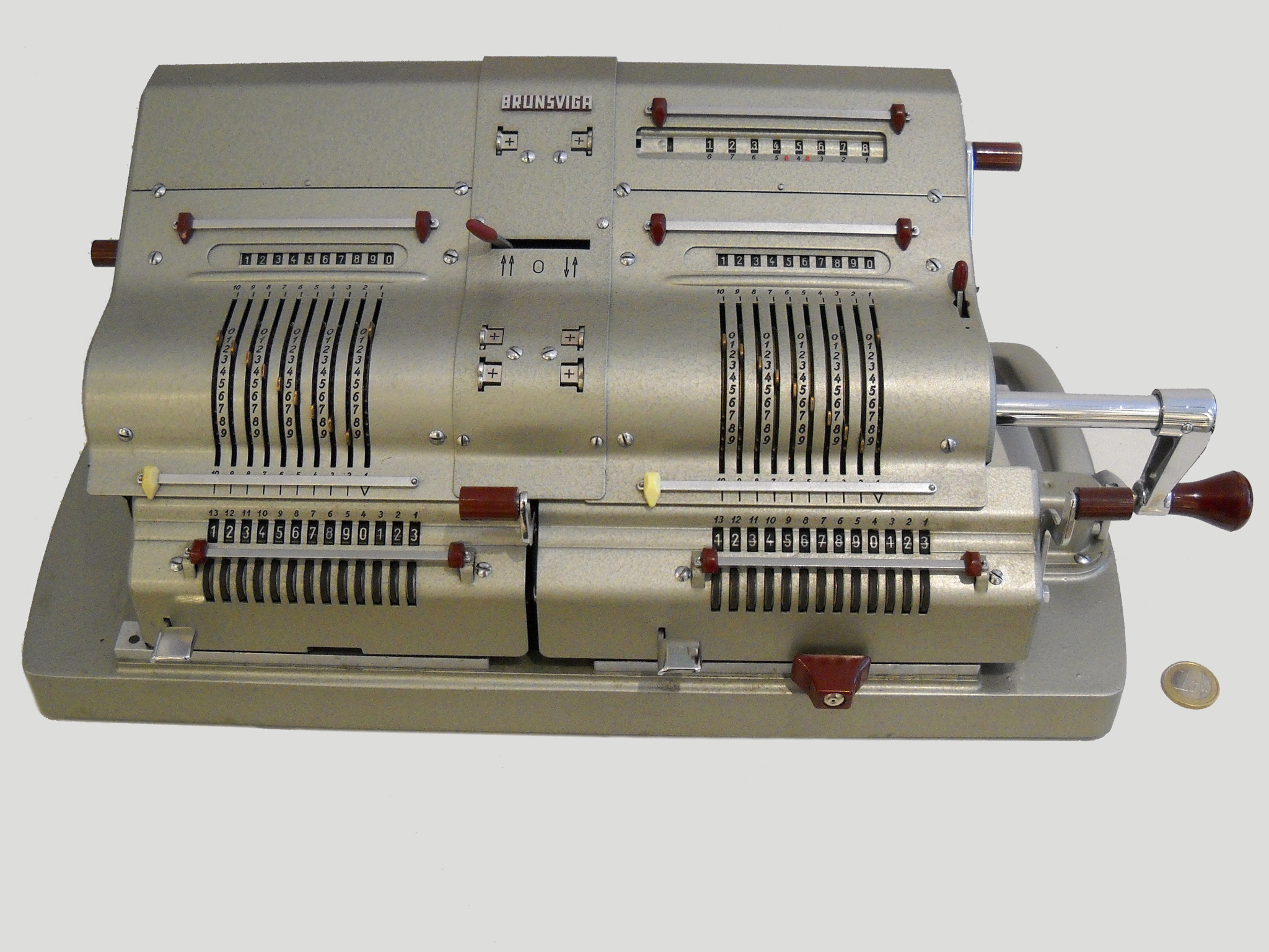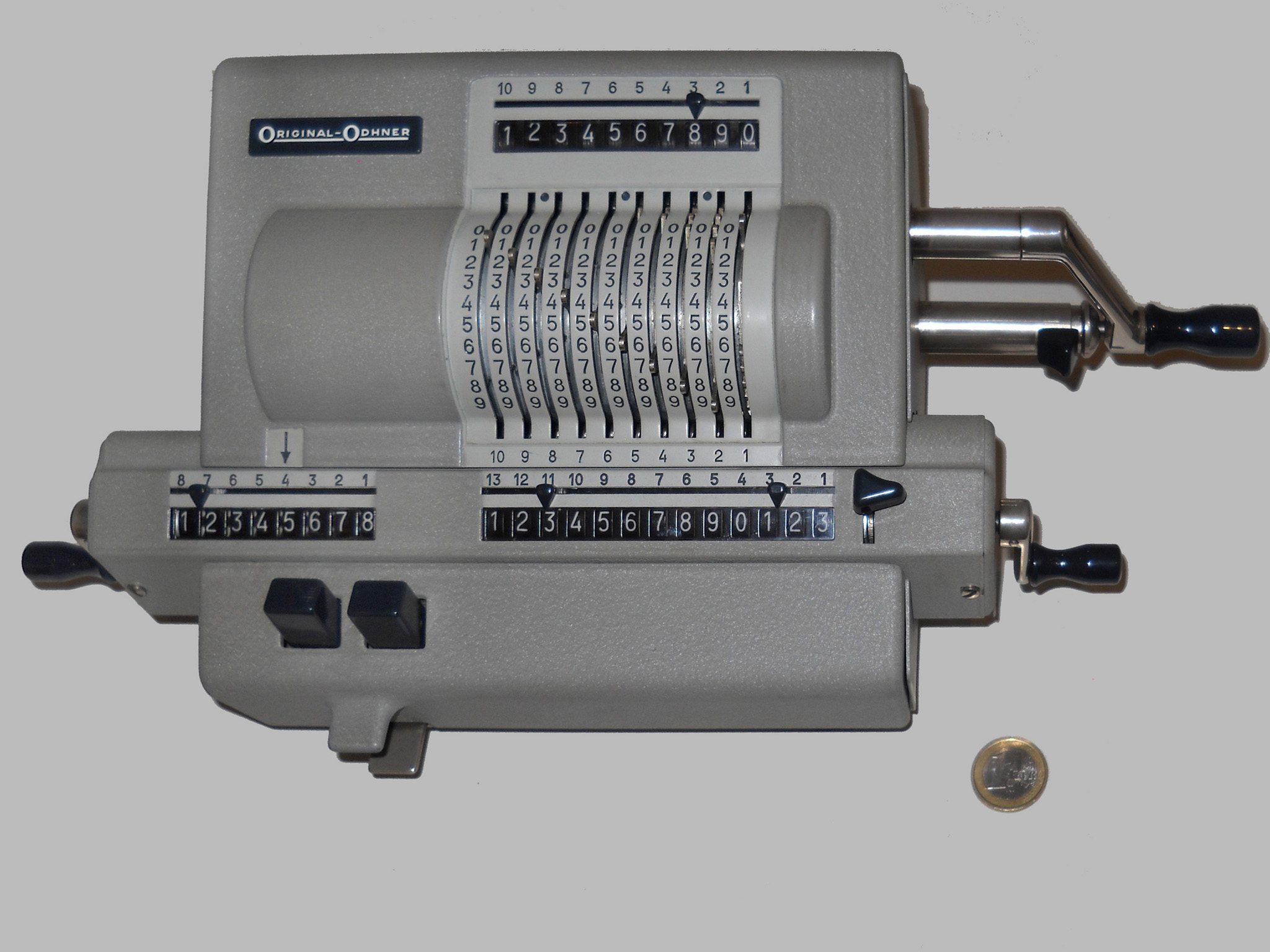 Für alle, die nicht so im Thema sind, hier die Erklärung einiger Fachbegriffe: AdditionsmodusDas Drücken der „Plus“-Taste zählt nicht nur den Wert der Eingabe zum Resultatwerk hinzu, sondern KapazitätIm Zusammenhang mit Rechenmaschinen nur ein anderes Wort für die Stellenzahl der Werke ... klingt aber gelehrter. Schalt(werks)prinzipienJede Zifferneingabe in eine Rechenmaschine muss erst irgendwie erfasst (und meist auch gespeichert) werden. Danach muss der gewünschte Wert natürlich auch seinen Weg zum Ergebnis finden. Zusätzliche Links:Youtube-Video: Staffelwalze (Schema) „Werke“ZehnerübertragWas passiert, wenn in einer Stelle "über die Neun hinaus" addiert werden muss, erklärt die Wikipedia ganz ausführlich. Aber nur die englische Wikipedia erklärt auch, warum die Mechanisierung dieses Vorgangs die größte Herausforderung beim Bau von Rechenmaschinen war. Weitere Erklärungen gewünscht? |