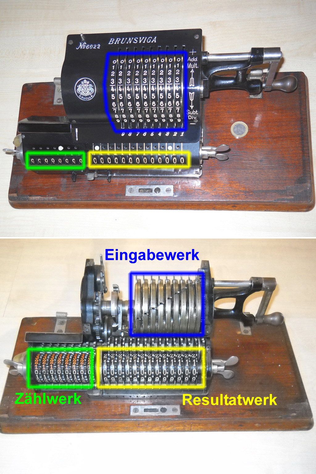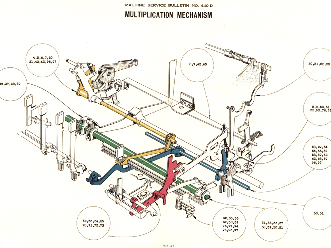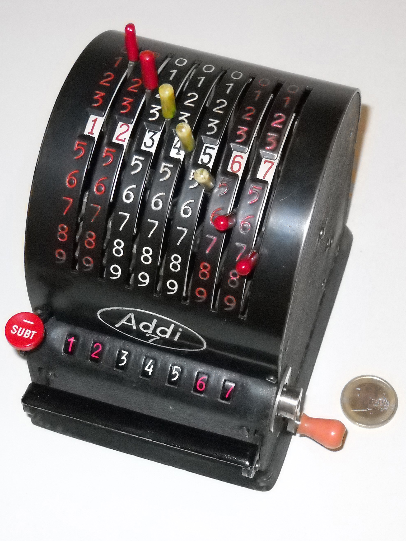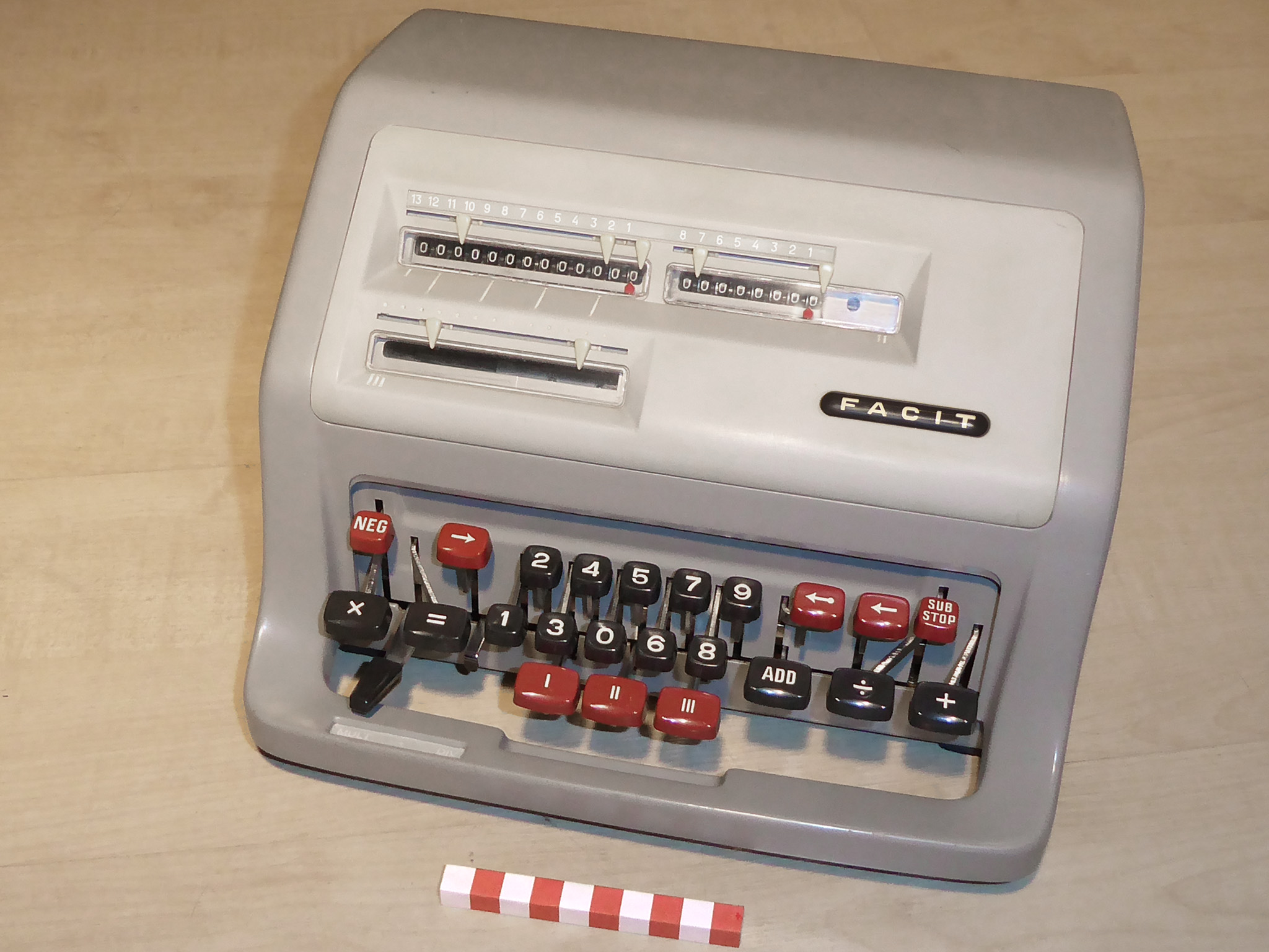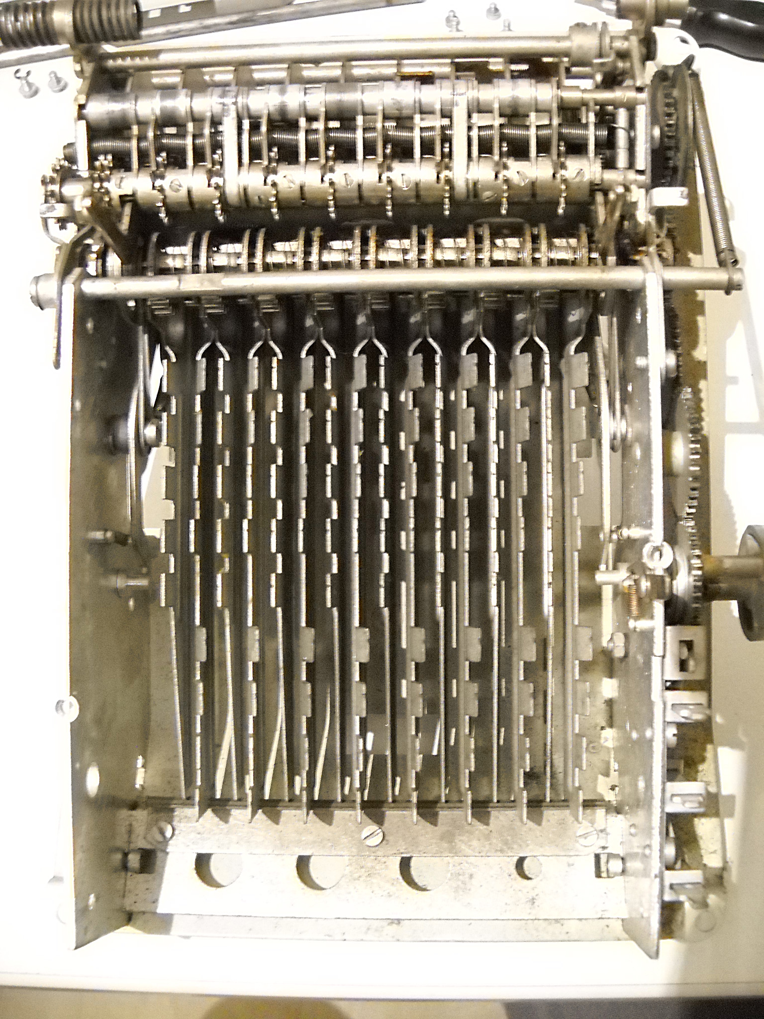 Für alle, die nicht so im Thema sind, hier die Erklärung einiger Fachbegriffe: AdditionsmodusDas Drücken der „Plus“-Taste zählt nicht nur den Wert der Eingabe zum Resultatwerk hinzu, sondern KapazitätIm Zusammenhang mit Rechenmaschinen nur ein anderes Wort für die Stellenzahl der Werke ... klingt aber gelehrter. Schalt(werks)prinzipienJede Zifferneingabe in eine Rechenmaschine muss erst irgendwie erfasst (und meist auch gespeichert) werden. Danach muss der gewünschte Wert natürlich auch seinen Weg zum Ergebnis finden. Zusätzliche Links:Youtube-Video: Staffelwalze (Schema) „Werke“ZehnerübertragWas passiert, wenn in einer Stelle "über die Neun hinaus" addiert werden muss, erklärt die Wikipedia ganz ausführlich. Aber nur die englische Wikipedia erklärt auch, warum die Mechanisierung dieses Vorgangs die größte Herausforderung beim Bau von Rechenmaschinen war. Weitere Erklärungen gewünscht? |