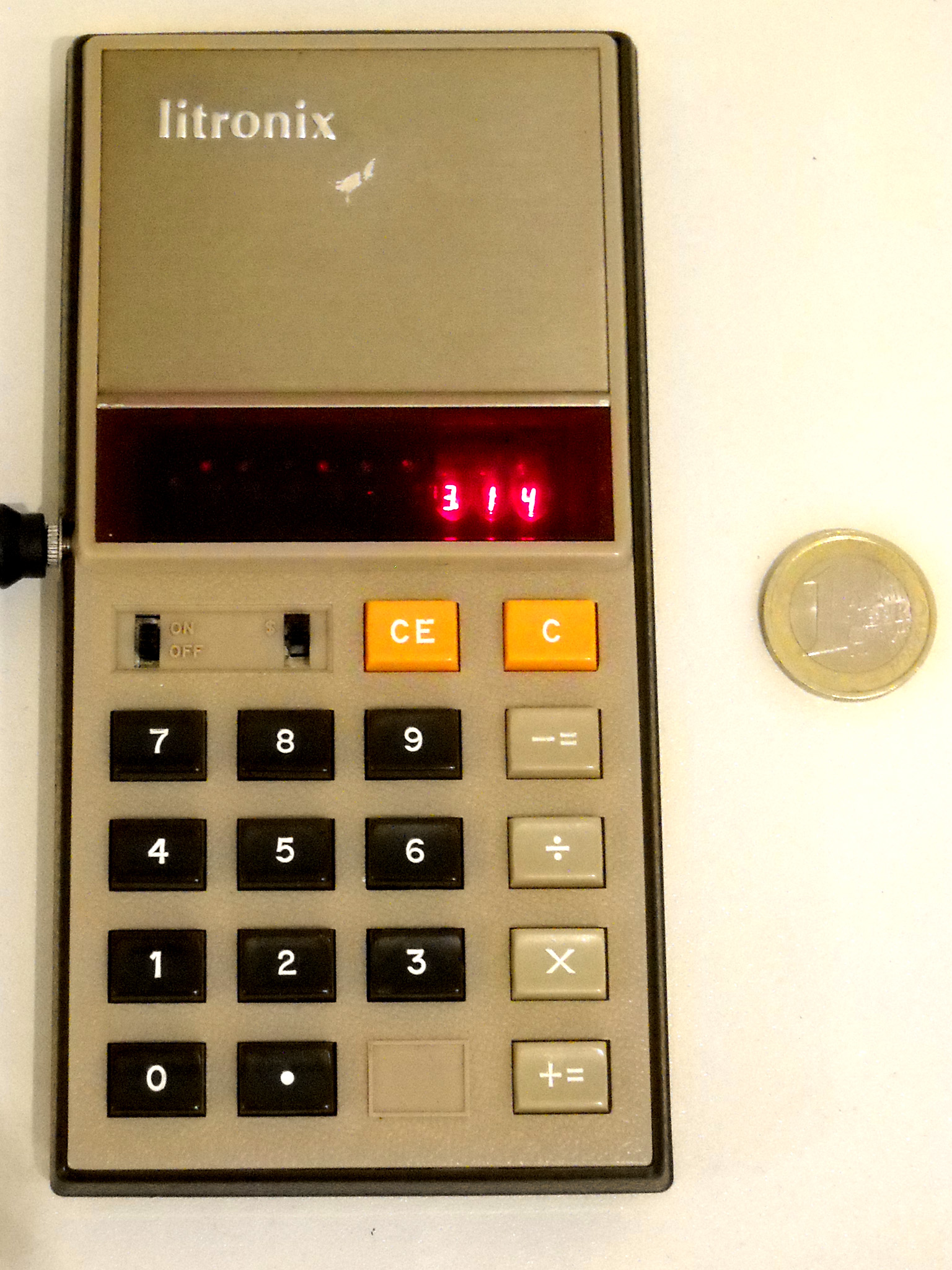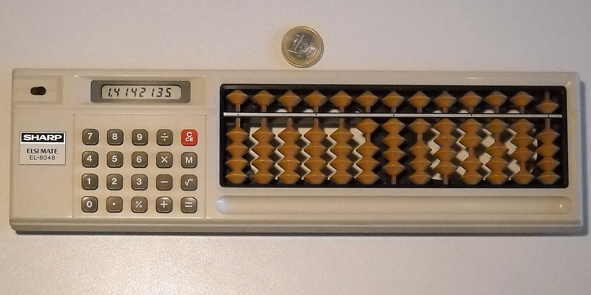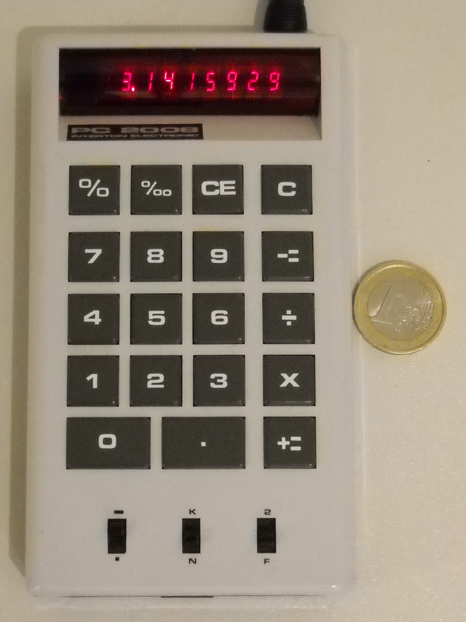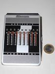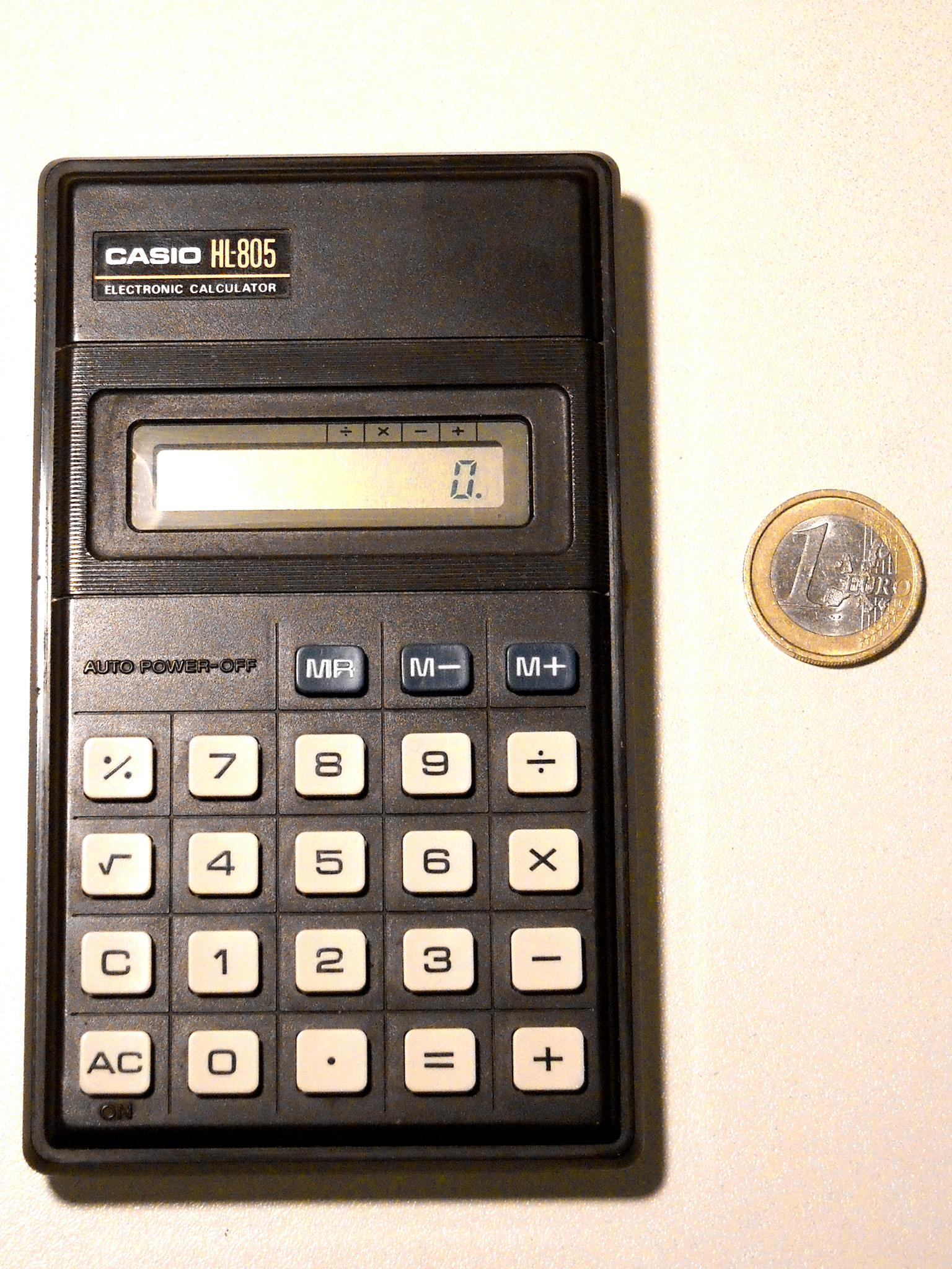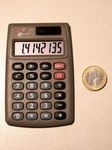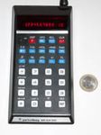 Ein aktueller Taschenrechner-Winzling mit 33 g, kaum größer als eine Scheckkarte. Rechner dieser Klasse sind heute Wegwerfware wie Kugelschreiber oder Feuerzeuge. Dieser Zwerg wirkt trotzdem recht solide, hat etwas mehr als die Minimalausstattung und eine ganz passable Tastatur. Er wird immer noch (zumindest Stand Ende 2024) als Neuware angeboten, und das seit vielen Jahren. Speicher und alle Funktionen sind in einem Chip integriert, der offenbar von Xerox stammt. |