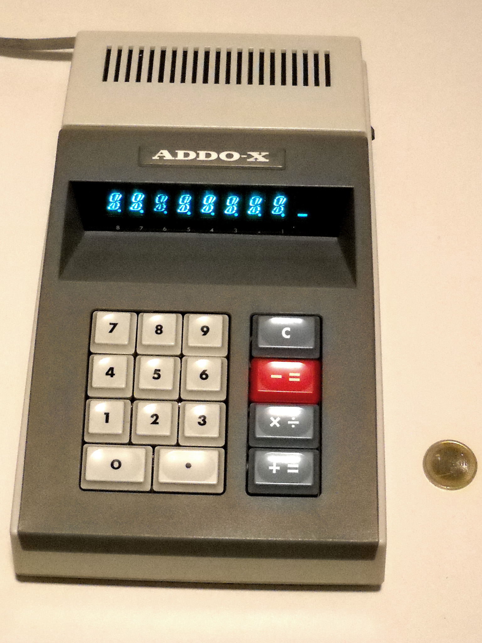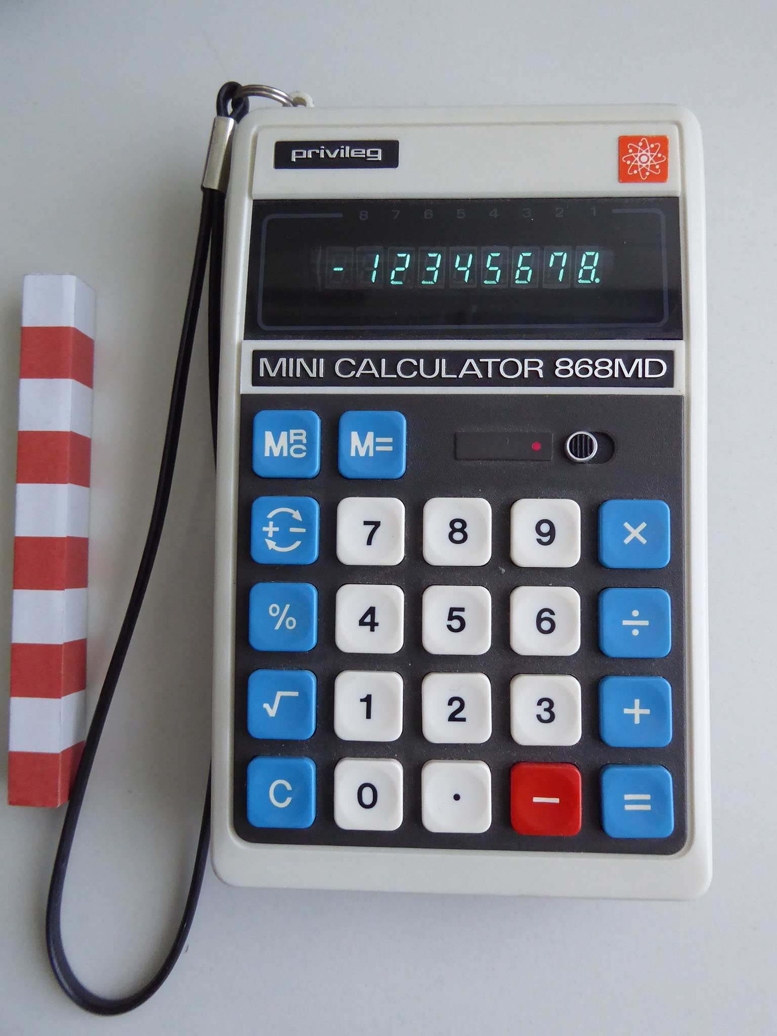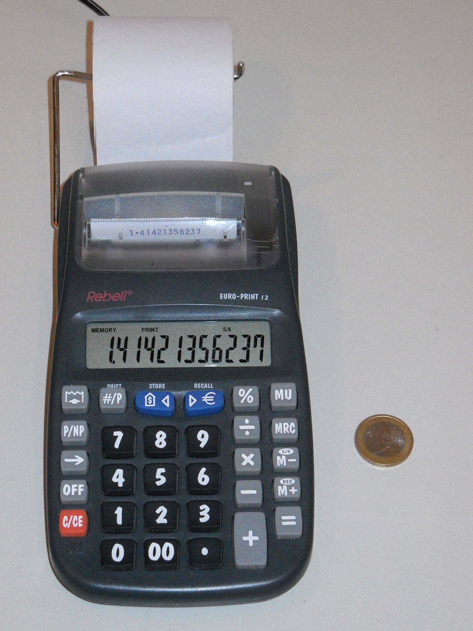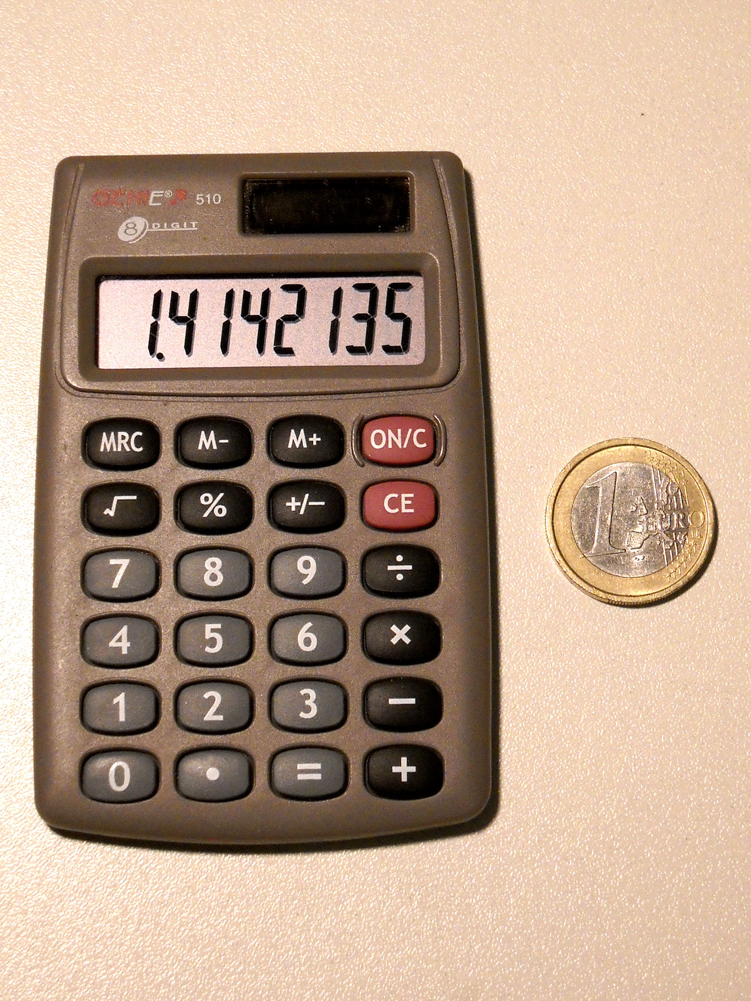 Ein aktueller Taschenrechner-Winzling mit 33 g, kaum größer als eine Scheckkarte. Rechner dieser Klasse sind heute Wegwerfware wie Kugelschreiber oder Feuerzeuge. Dieser Zwerg wirkt trotzdem recht solide, hat etwas mehr als die Minimalausstattung und eine ganz passable Tastatur. Er wird immer noch (zumindest Stand Ende 2024) als Neuware angeboten, und das seit vielen Jahren. Speicher und alle Funktionen sind in einem Chip integriert, der offenbar von Xerox stammt. |