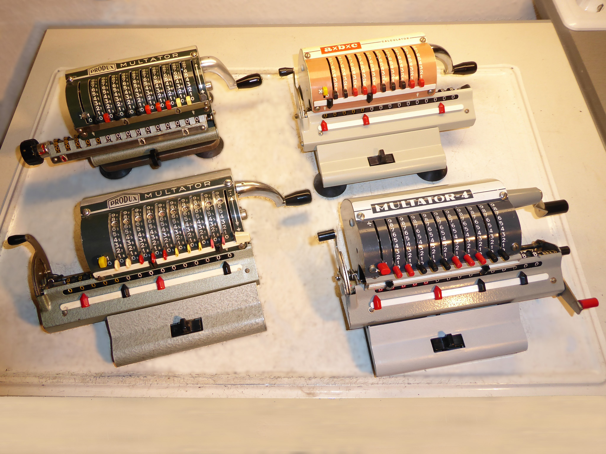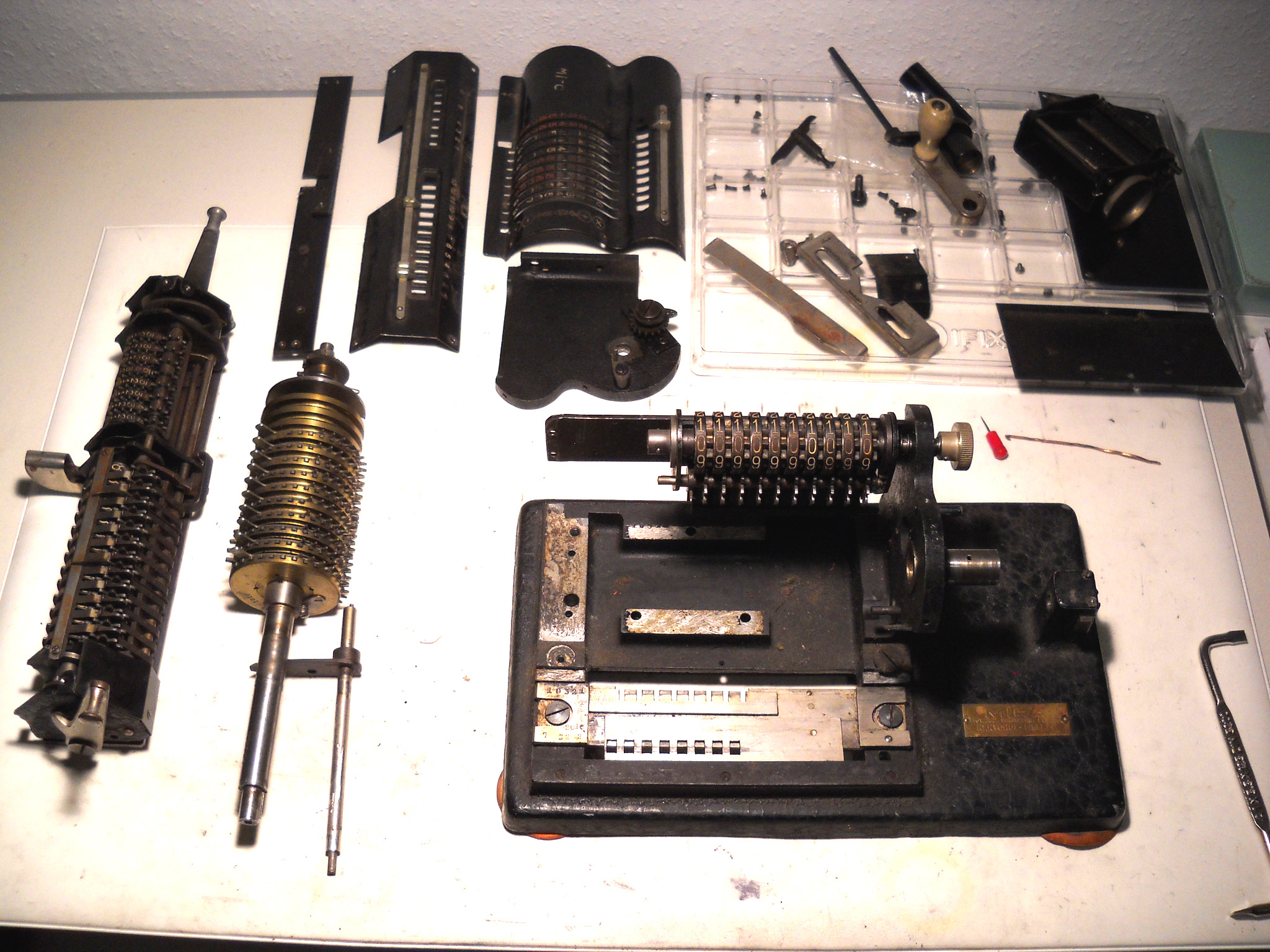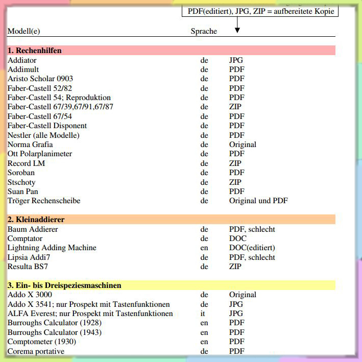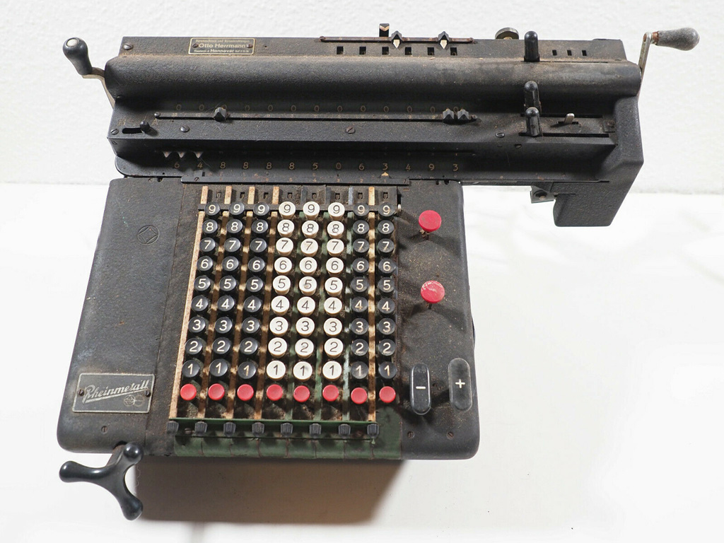 Möchten Sie einen groben Überblick über die Geschichte des mechanischen Rechnens? Die Aufklappmenüs unter Geschichte(n) sind für Sie gedacht! Suchen Sie Infos über... ...eine bestimmte Maschine? Dann in der Gesamtliste nachschauen, ob ich die habe - dort ggf. anklicken. ...einen bestimmten Hersteller? Dessen älteste (=oberste, fettgedruckte) Maschine in der Gesamtliste anklicken - unter der steht meist ein wenig zur Firma. Häufig kann man sich durch die Geräte eines Herstellers „durchklicken“ - ich bemühe mich, dafür interne Links zu setzen. Haben Sie eine alte Rechenmaschine und suchen eine Anleitung dafür? Vielleicht habe ich da was - wenn ja, finden Sie das in der Liste der vorhandenen Anleitungen. Wenn nicht, dann kann ich vielleicht trotzdem ein paar Hinweise zur Nutzung geben - fragen Sie einfach! Haben Sie Interesse am Erwerb einer funktionierenden Maschine? Ein paar Dubletten und für die Sammlung unwichtige Objekte gibt es günstig unter Abzugeben. Alle anderen gezeigten Objekte sind nicht verkäuflich. (O.k. - kommt auf den Preis an... )Suchen Sie weitere Infos im Netz? Die Linkliste hilft - ich versuche, die stets aktuell zu halten. |