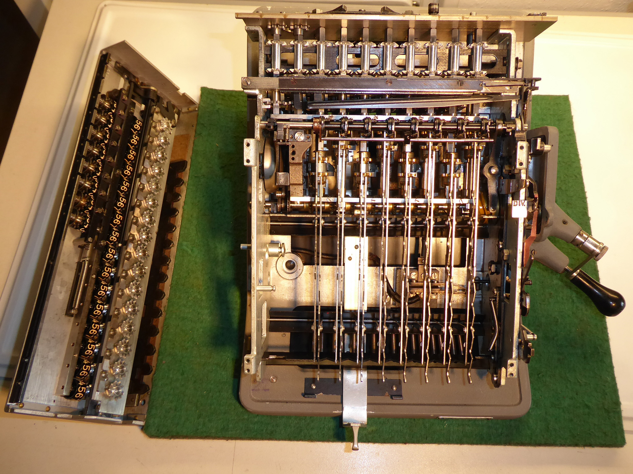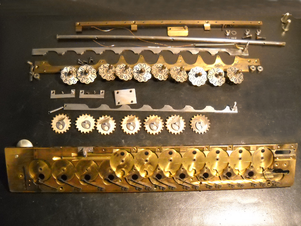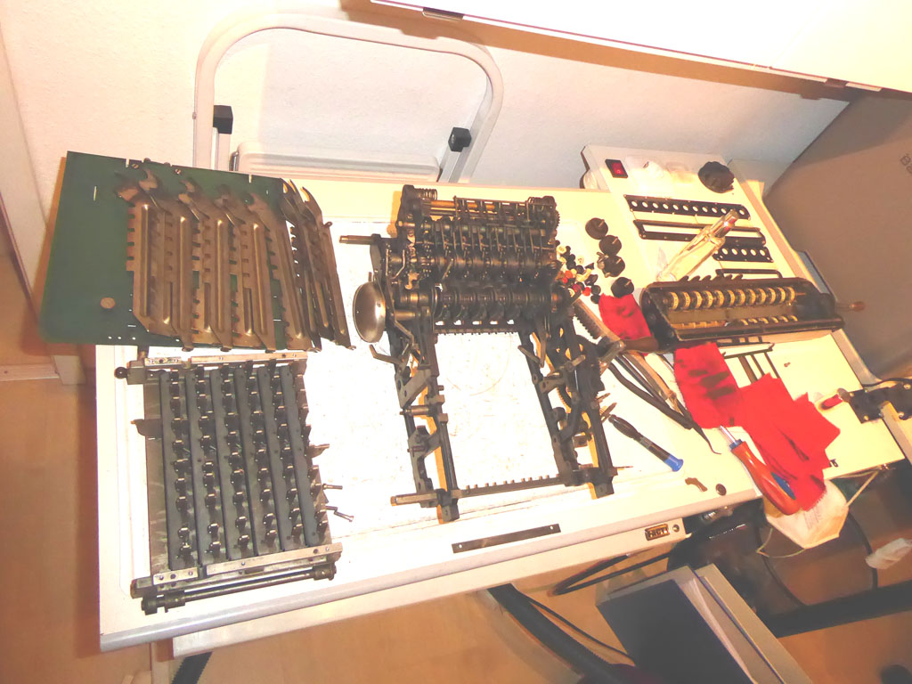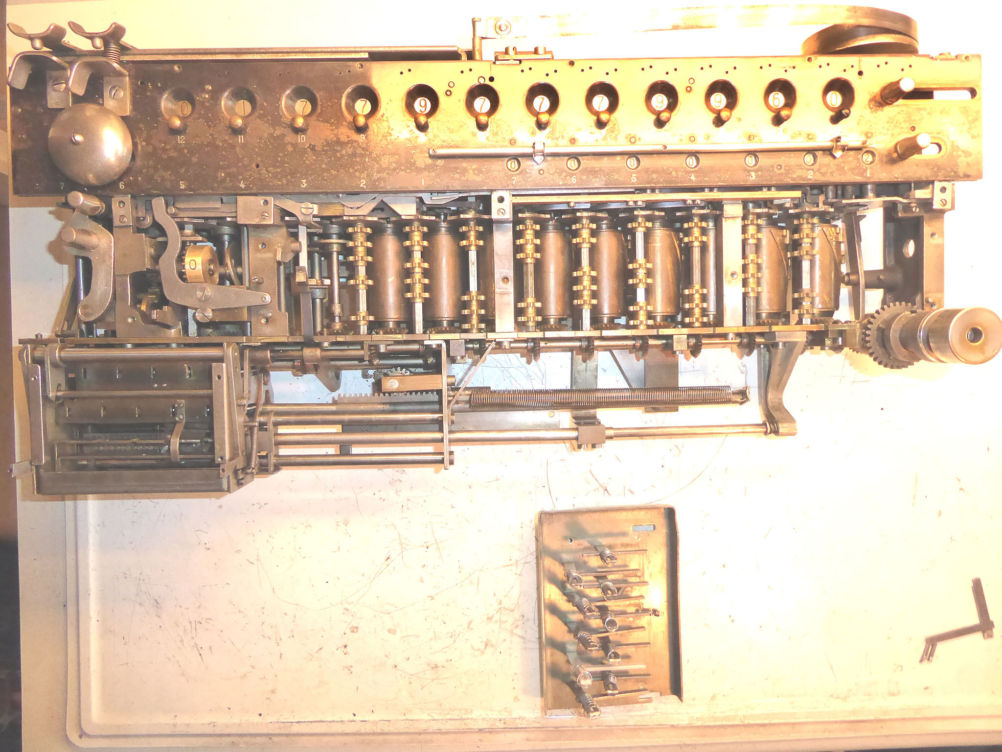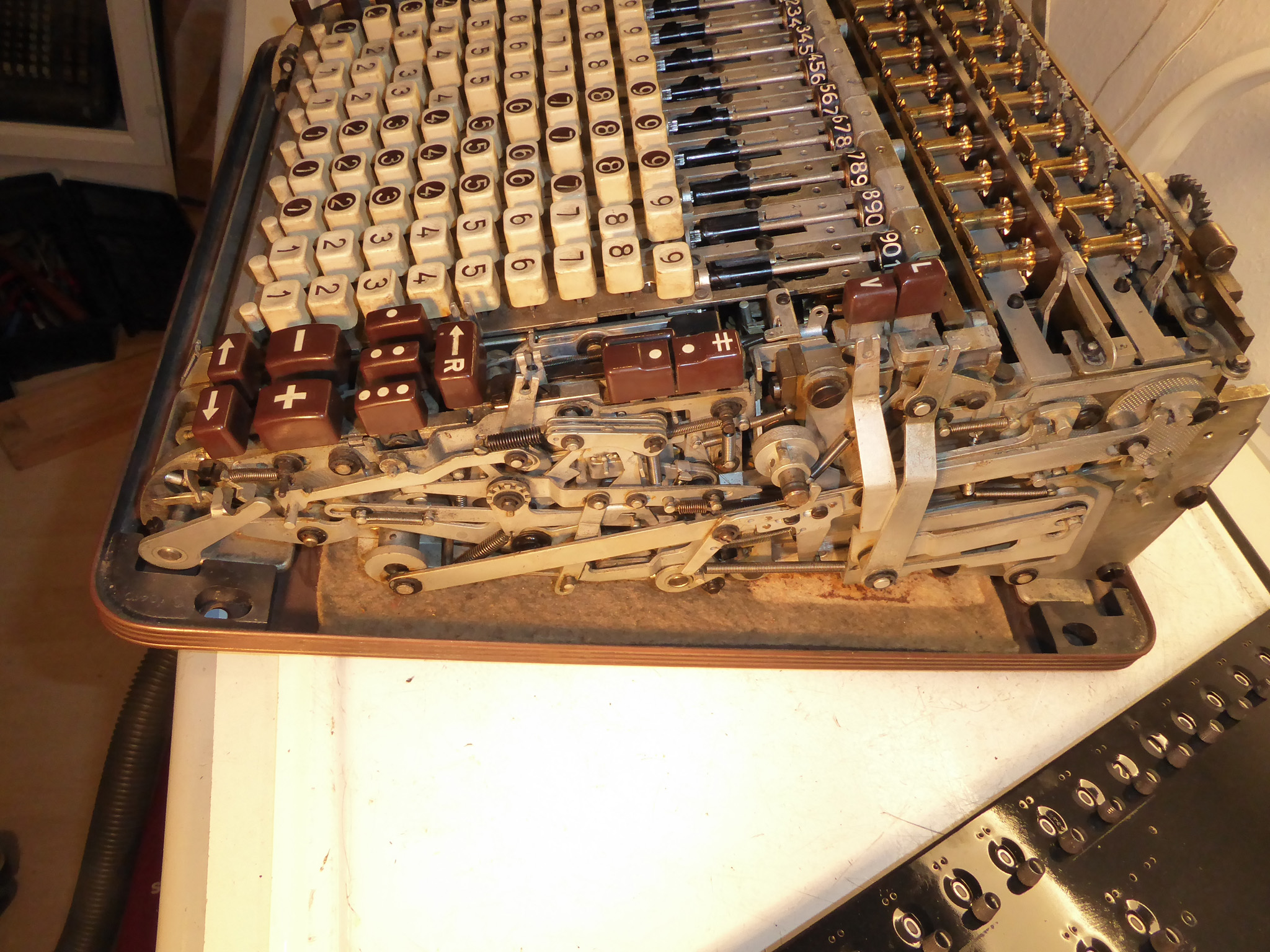 Feder der RW-Löschung eingehängt, defekte Rückdrehsperre neu gesplintet, Ziffern im ZW neu eingelegt, unpassende Schraube der ZW-Löschkurbel ersetzt, Stifte der Kommastecker nachgearbeitet, vergraute Pappe unter dem Glas ersetzt. Im Holzkasten, mit Schlüssel und vier Kommasteckern. Französische Anleitung im Netz gefunden. |