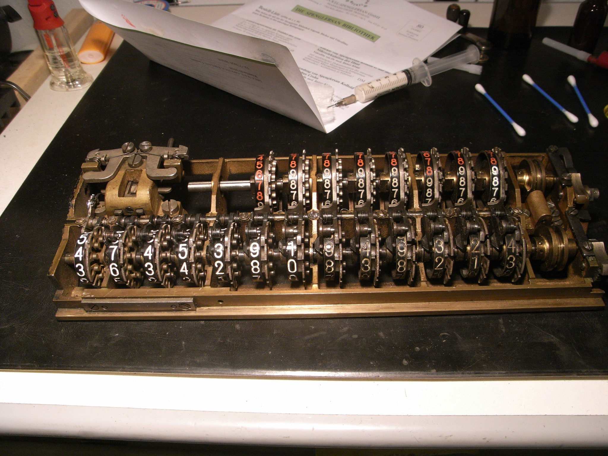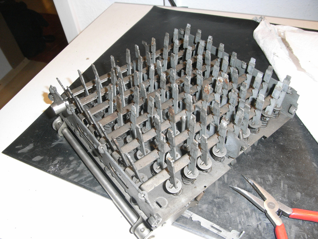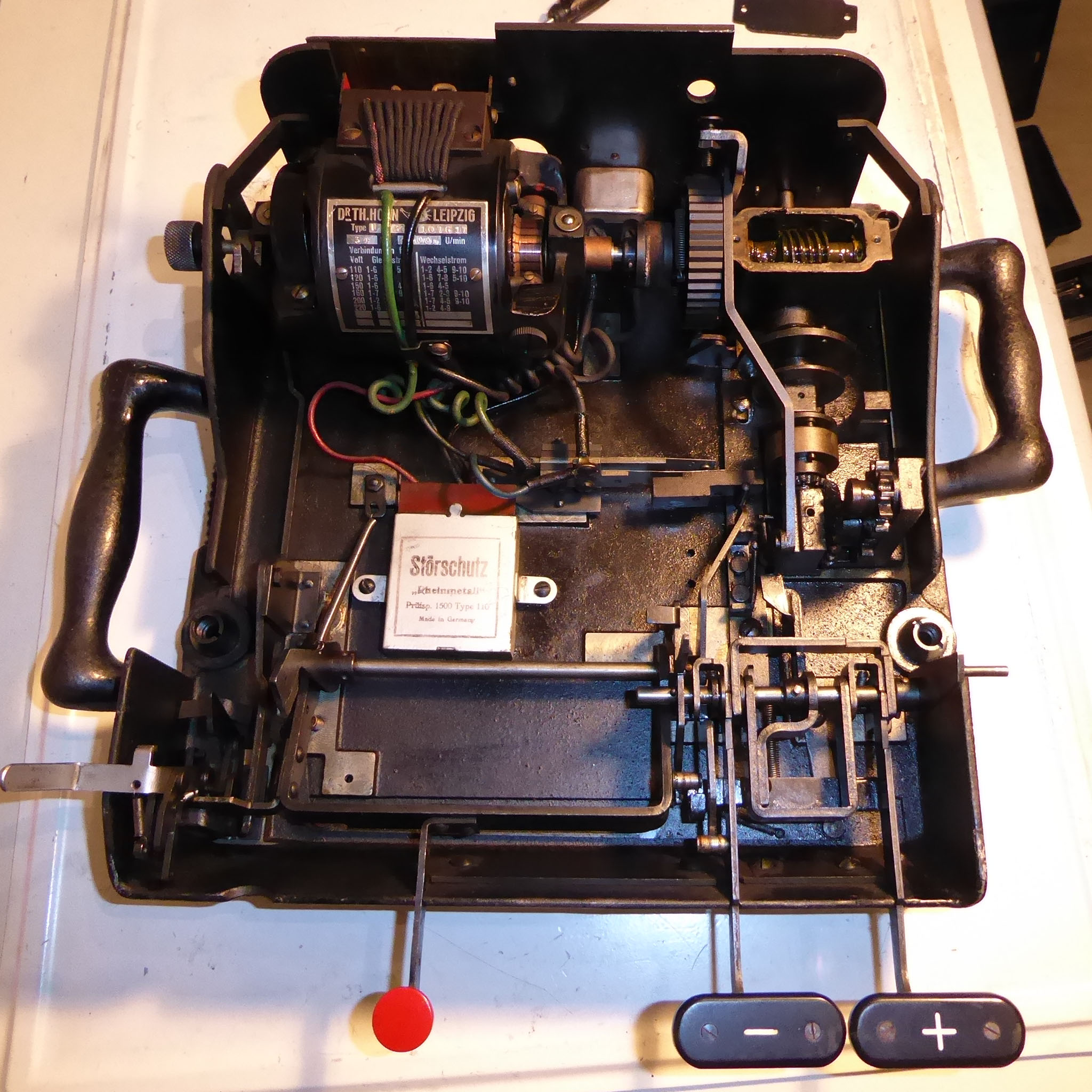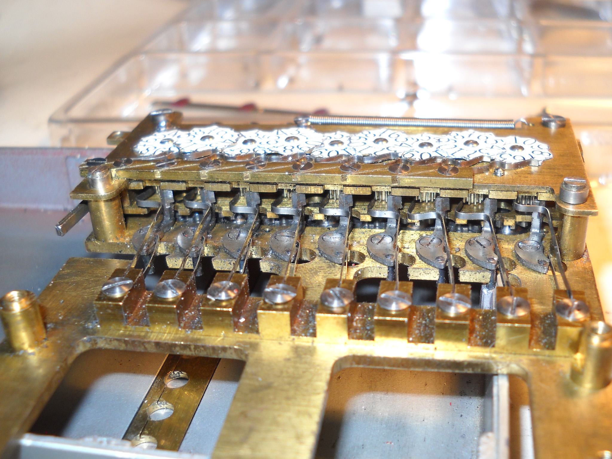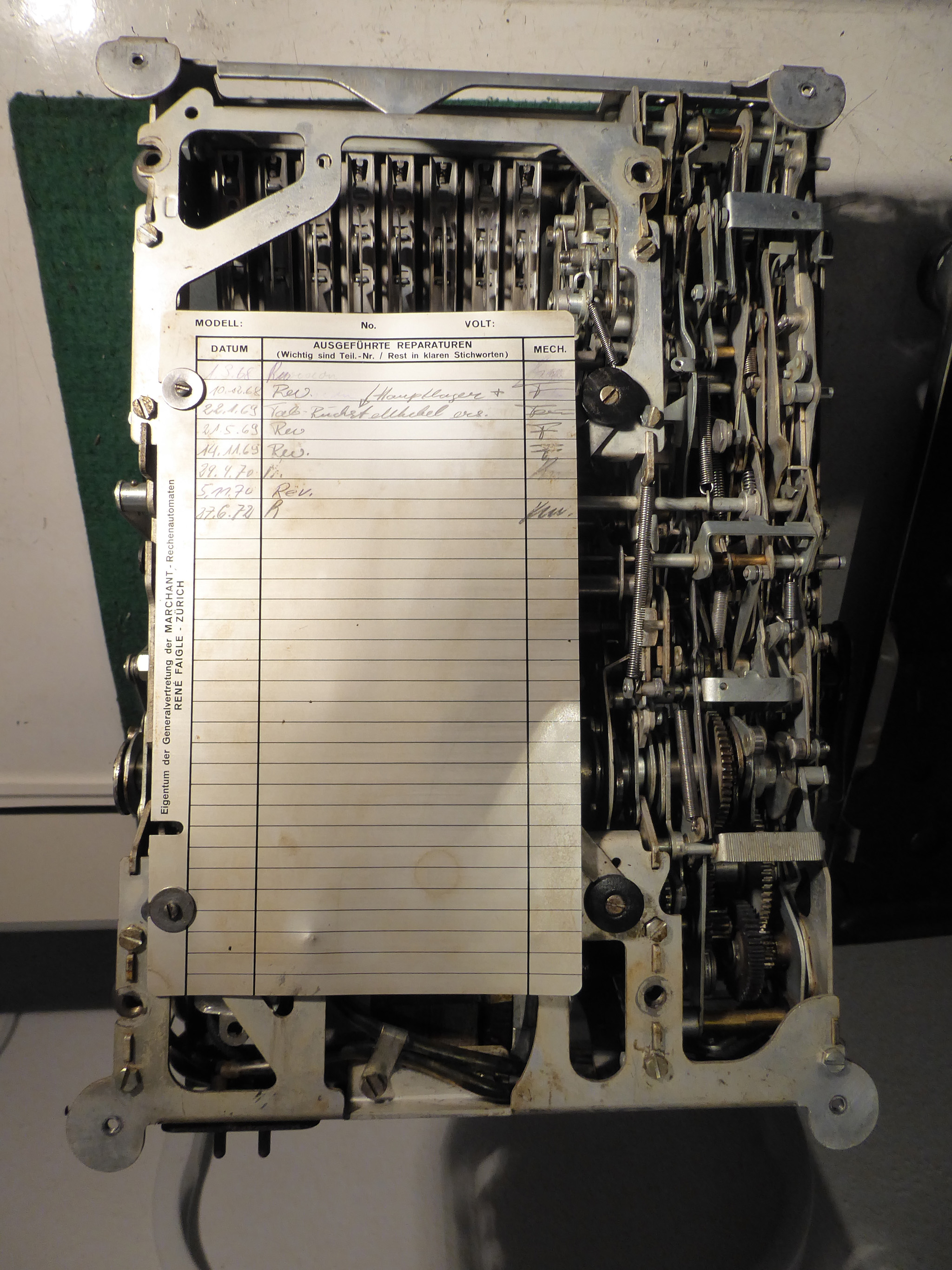 Feder der RW-Löschung eingehängt, defekte Rückdrehsperre neu gesplintet, Ziffern im ZW neu eingelegt, unpassende Schraube der ZW-Löschkurbel ersetzt, Stifte der Kommastecker nachgearbeitet, vergraute Pappe unter dem Glas ersetzt. Im Holzkasten, mit Schlüssel und vier Kommasteckern. Französische Anleitung im Netz gefunden. |