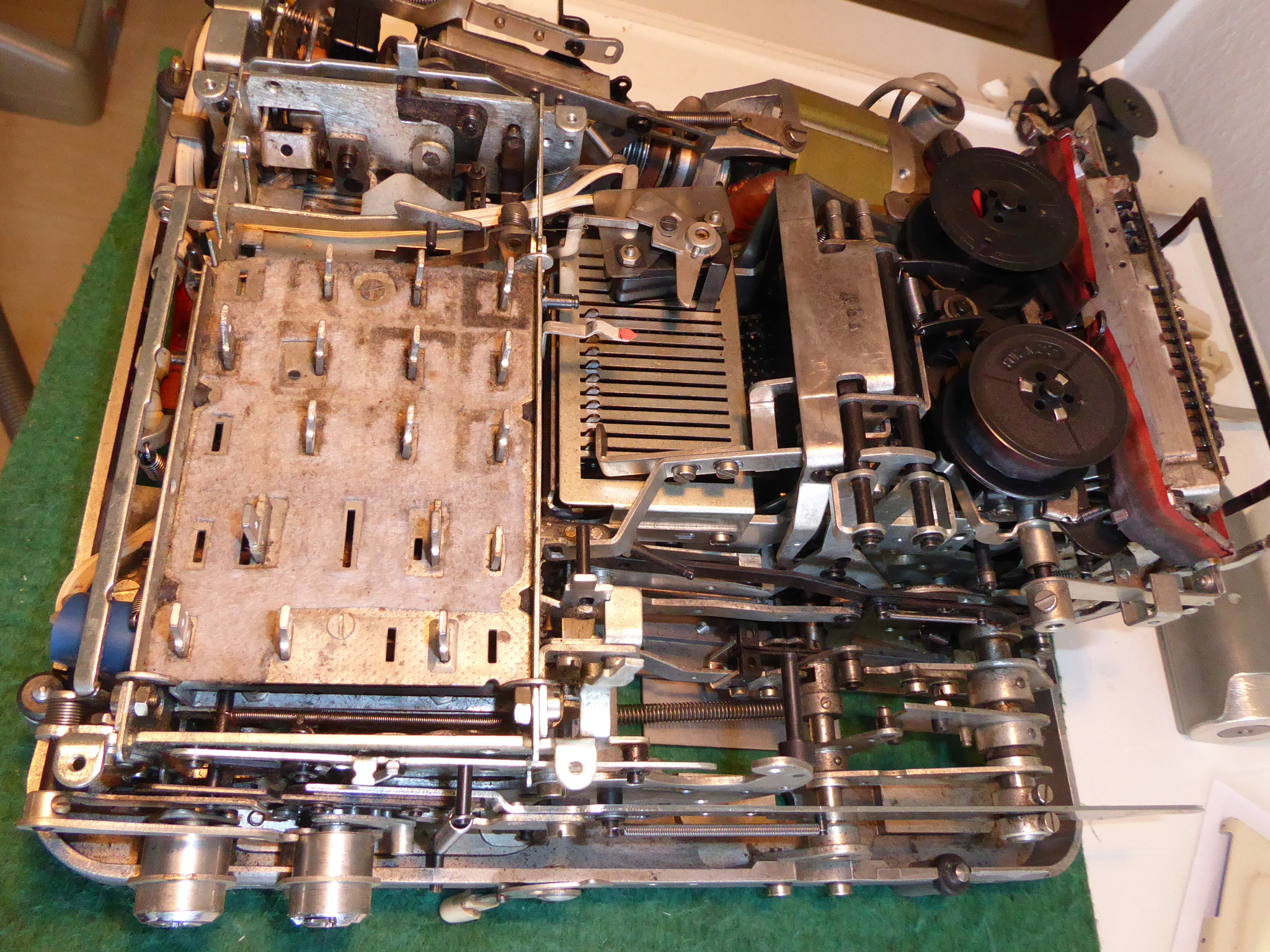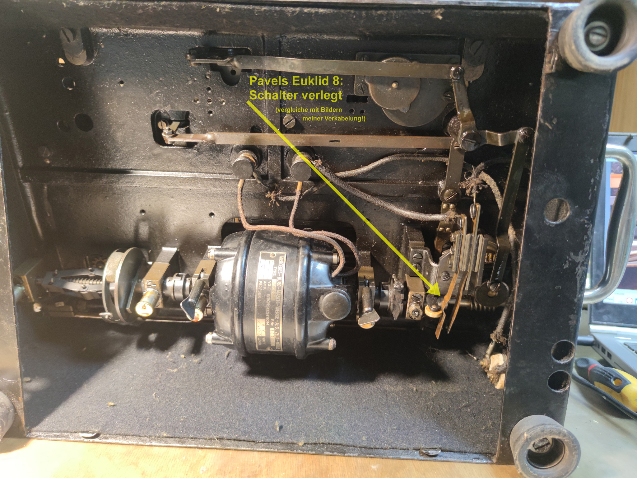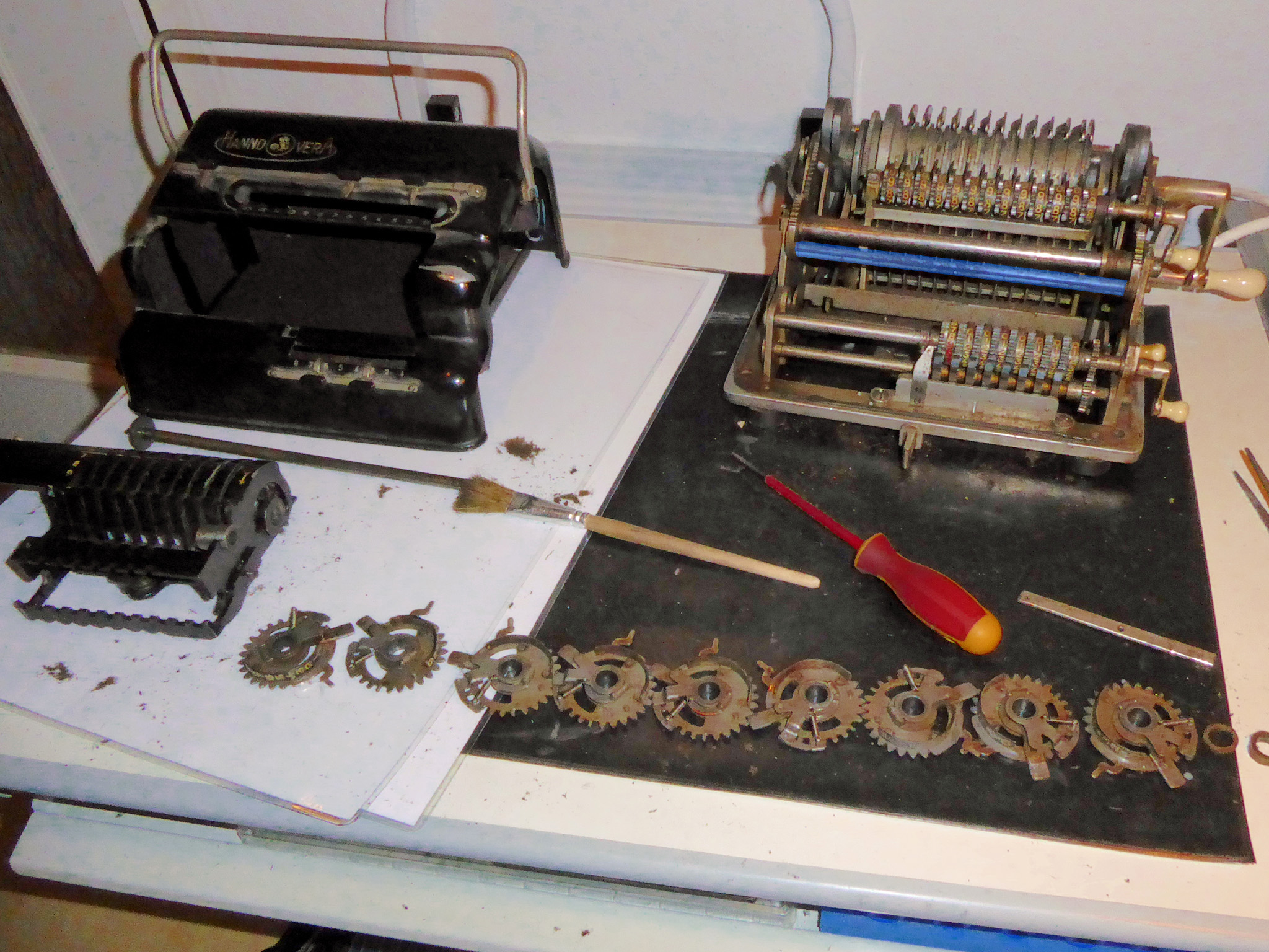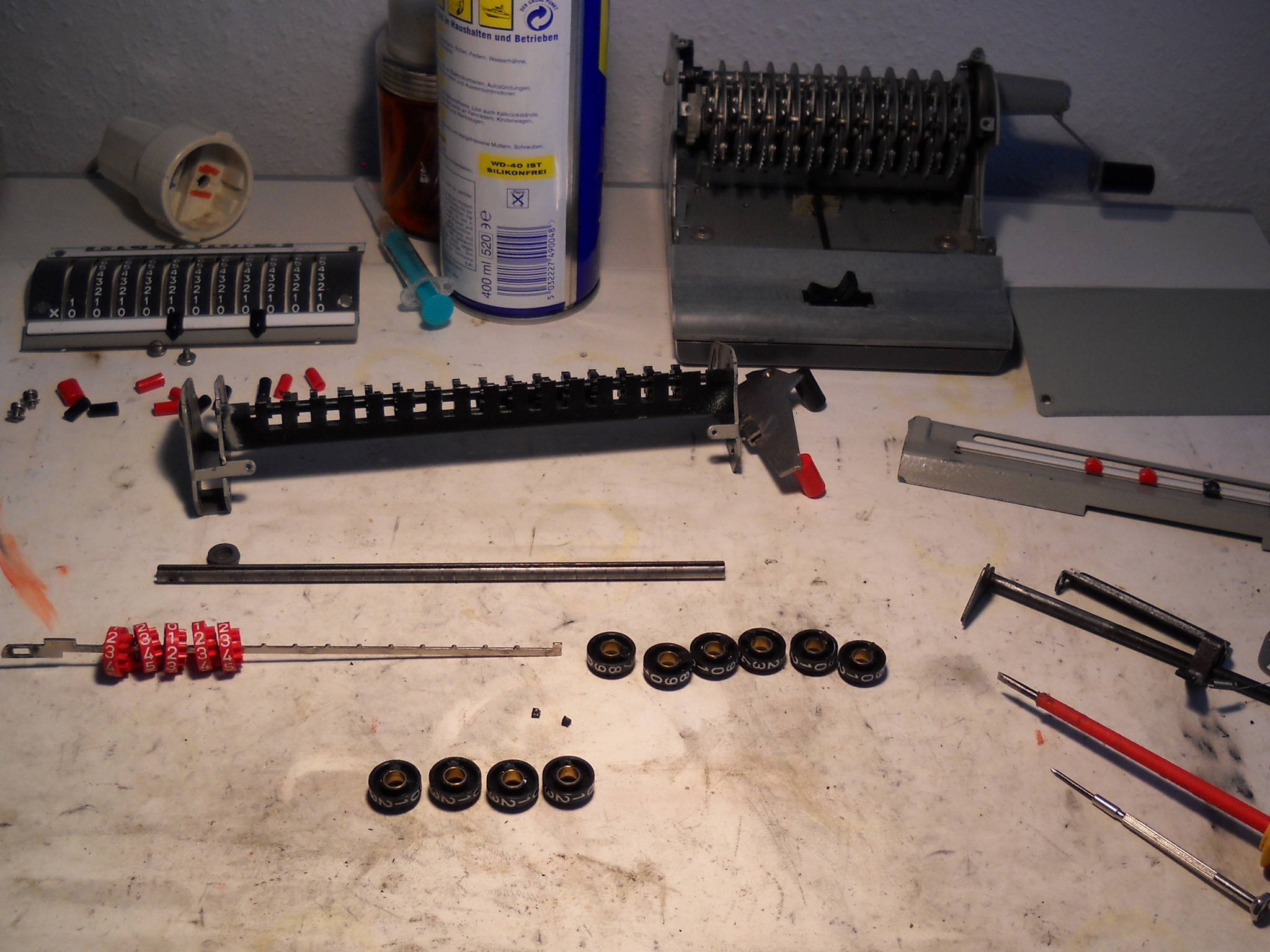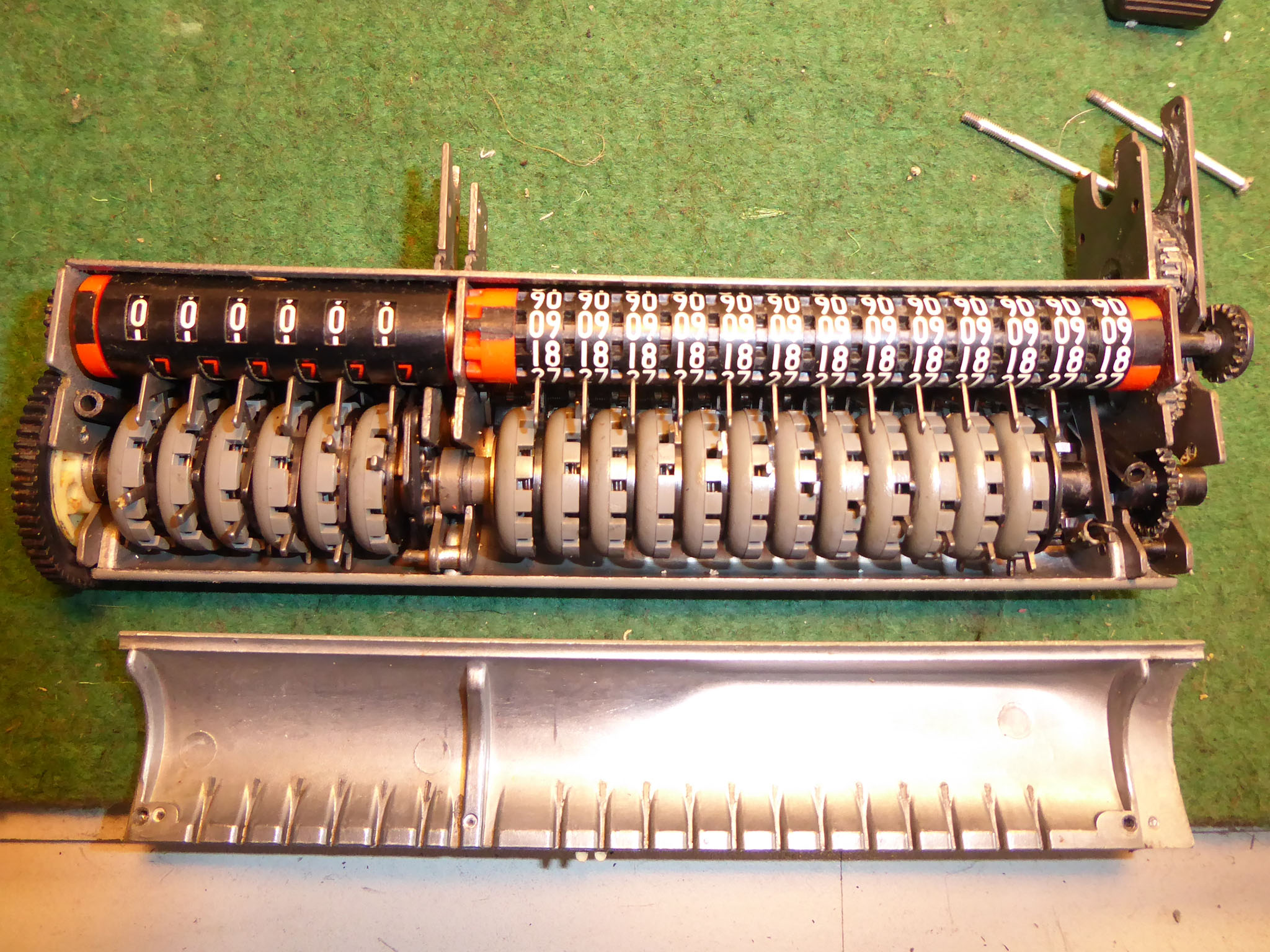 Feder der RW-Löschung eingehängt, defekte Rückdrehsperre neu gesplintet, Ziffern im ZW neu eingelegt, unpassende Schraube der ZW-Löschkurbel ersetzt, Stifte der Kommastecker nachgearbeitet, vergraute Pappe unter dem Glas ersetzt. Im Holzkasten, mit Schlüssel und vier Kommasteckern. Französische Anleitung im Netz gefunden. |