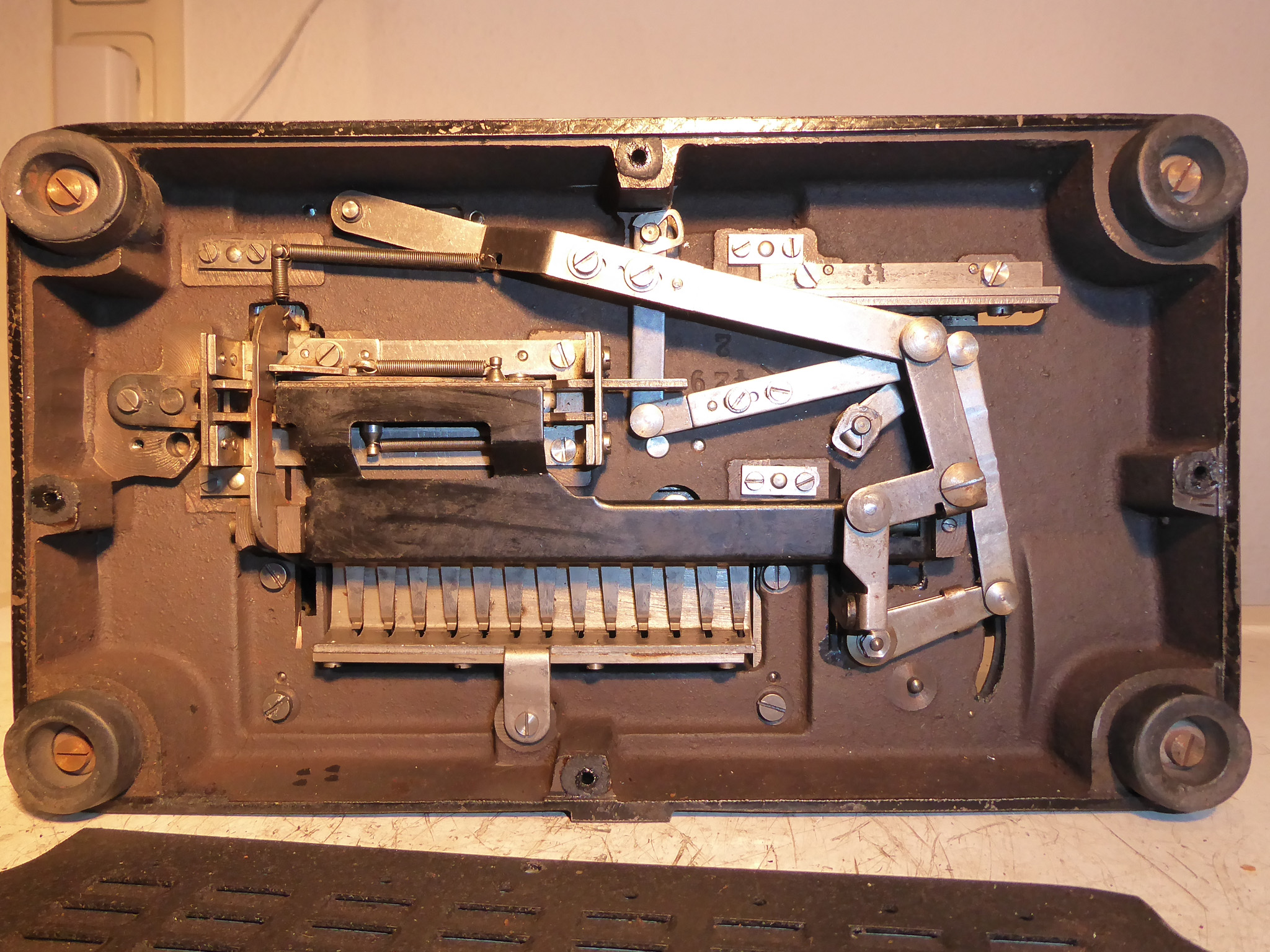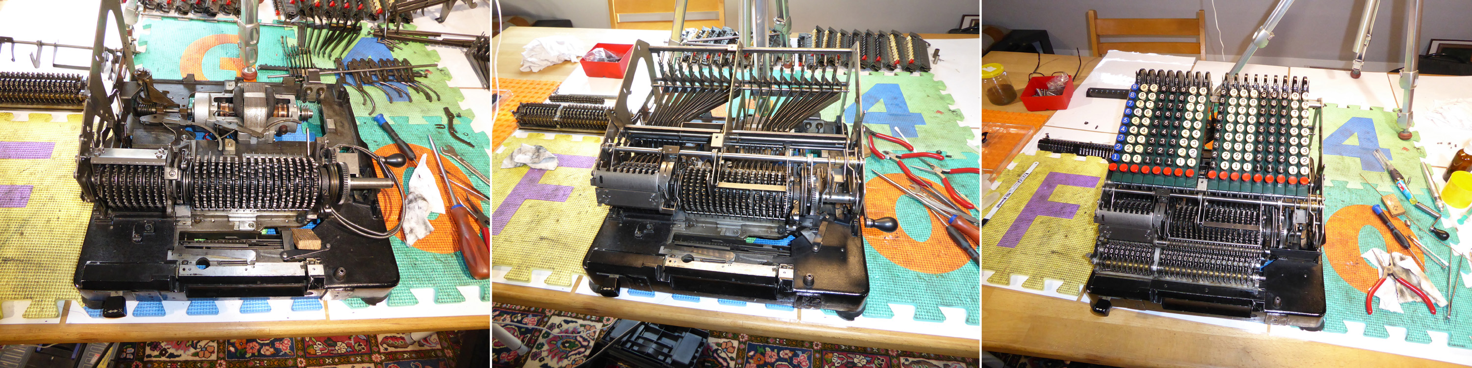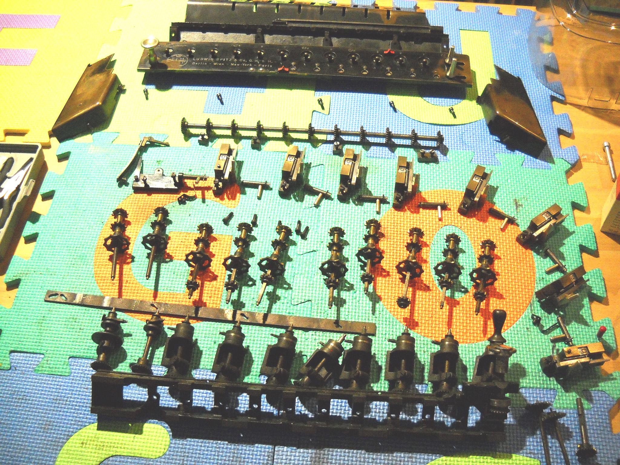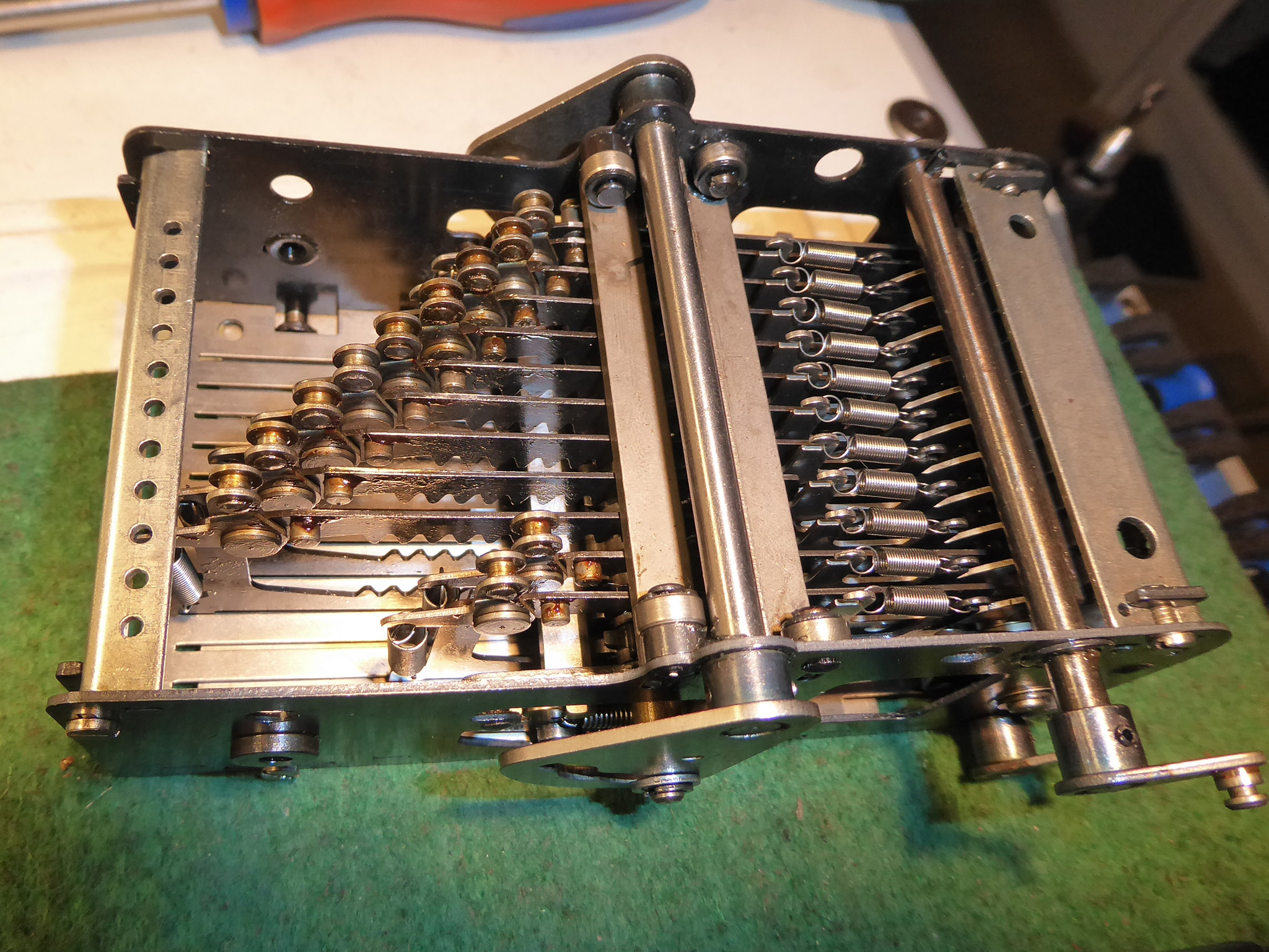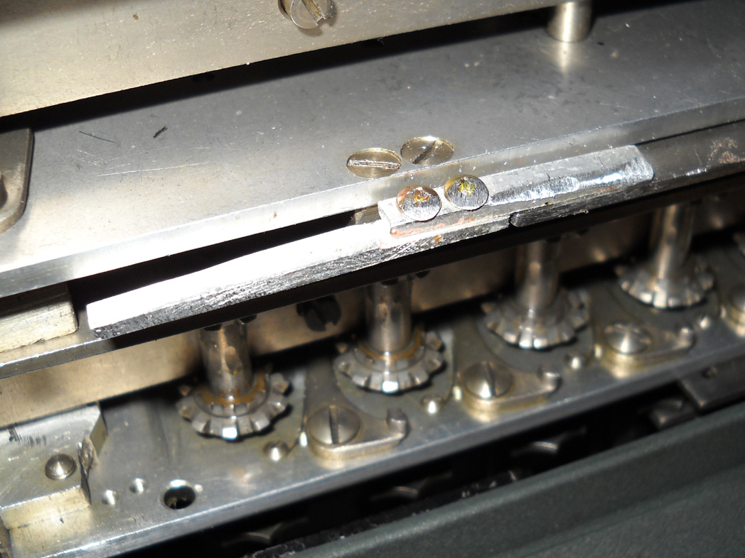 Feder der RW-Löschung eingehängt, defekte Rückdrehsperre neu gesplintet, Ziffern im ZW neu eingelegt, unpassende Schraube der ZW-Löschkurbel ersetzt, Stifte der Kommastecker nachgearbeitet, vergraute Pappe unter dem Glas ersetzt. Im Holzkasten, mit Schlüssel und vier Kommasteckern. Französische Anleitung im Netz gefunden. |