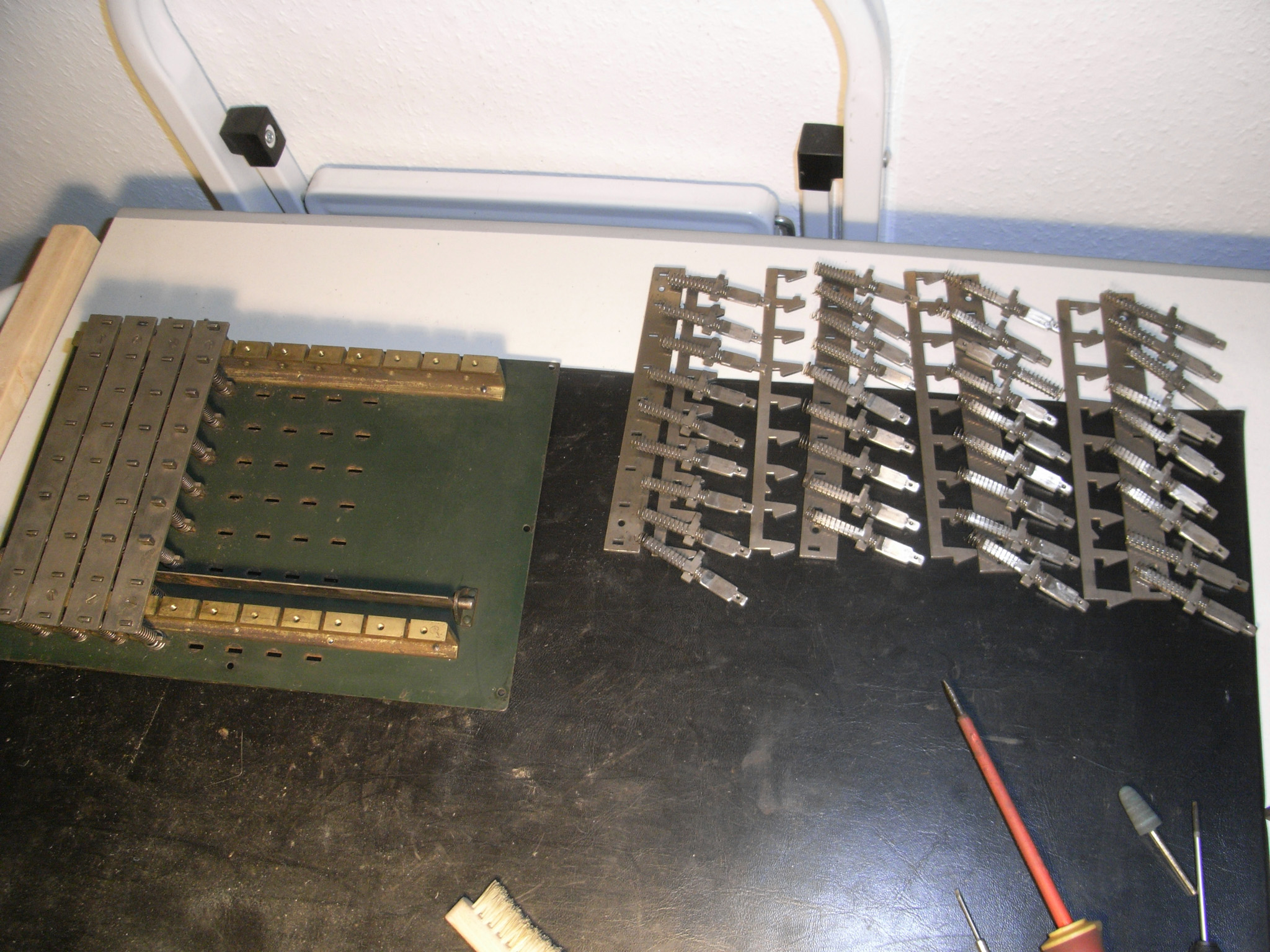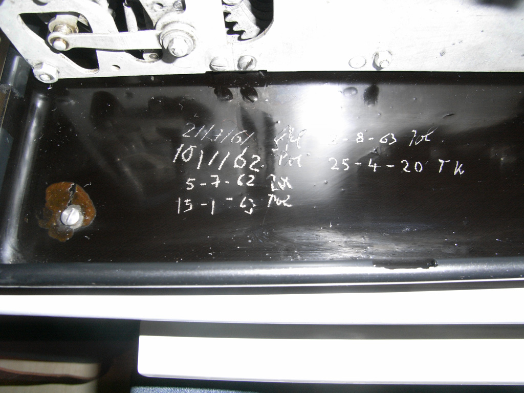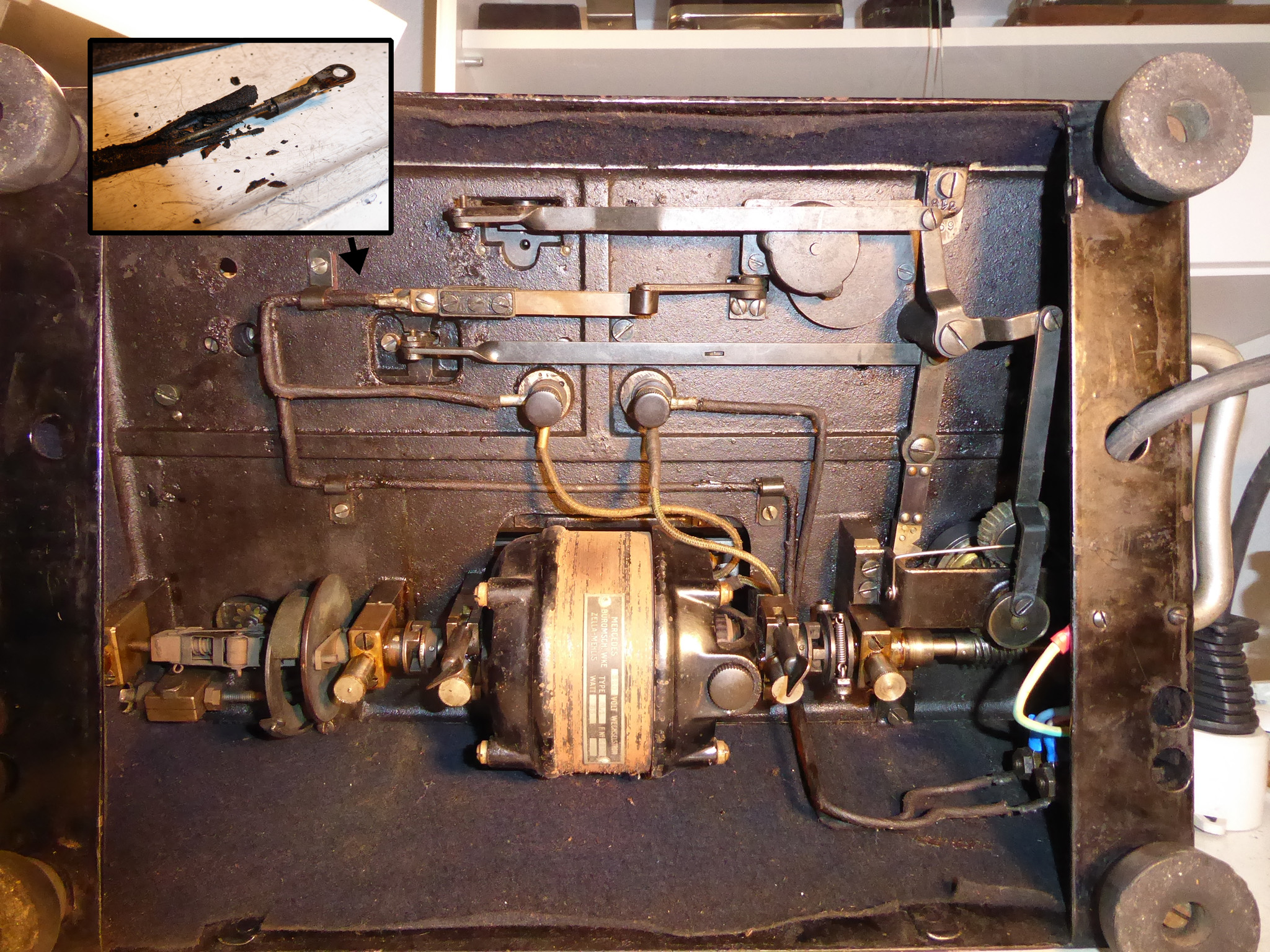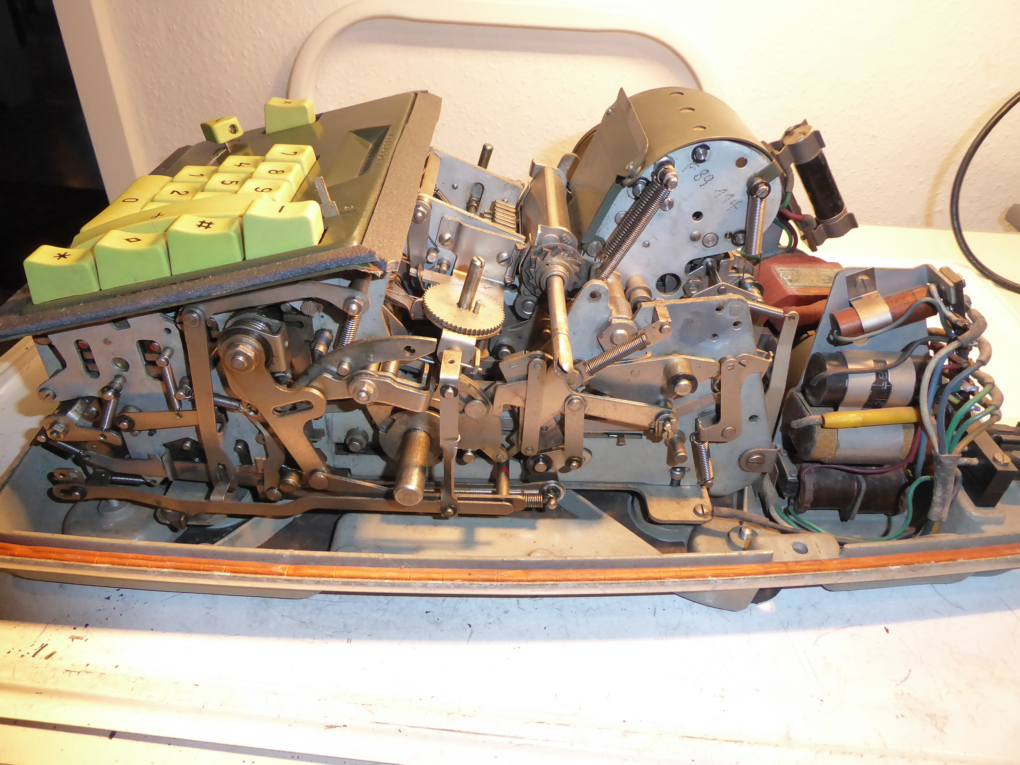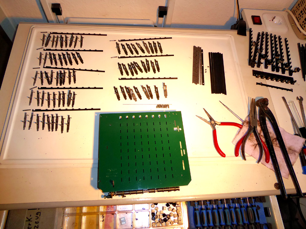 Feder der RW-Löschung eingehängt, defekte Rückdrehsperre neu gesplintet, Ziffern im ZW neu eingelegt, unpassende Schraube der ZW-Löschkurbel ersetzt, Stifte der Kommastecker nachgearbeitet, vergraute Pappe unter dem Glas ersetzt. Im Holzkasten, mit Schlüssel und vier Kommasteckern. Französische Anleitung im Netz gefunden. |