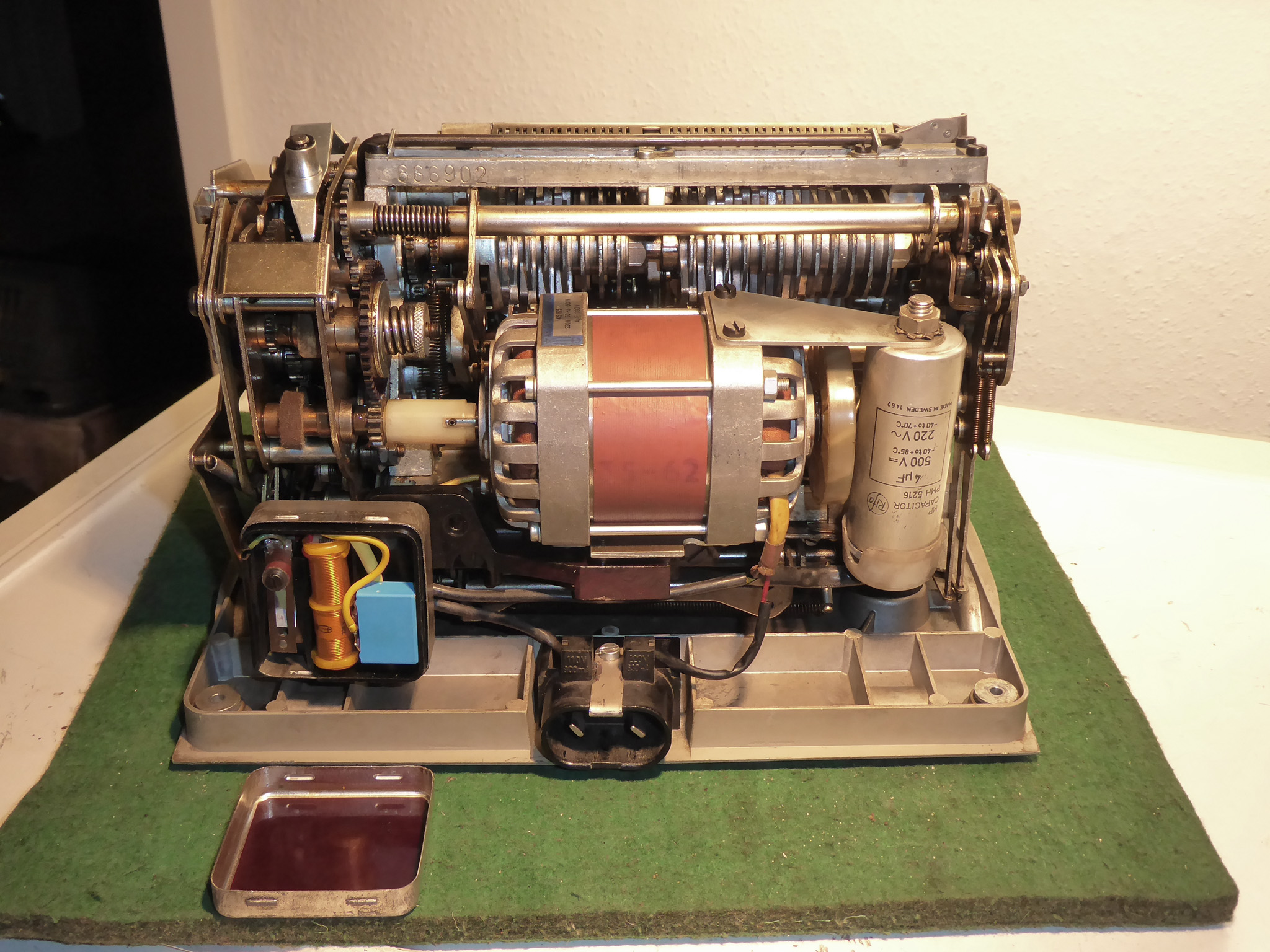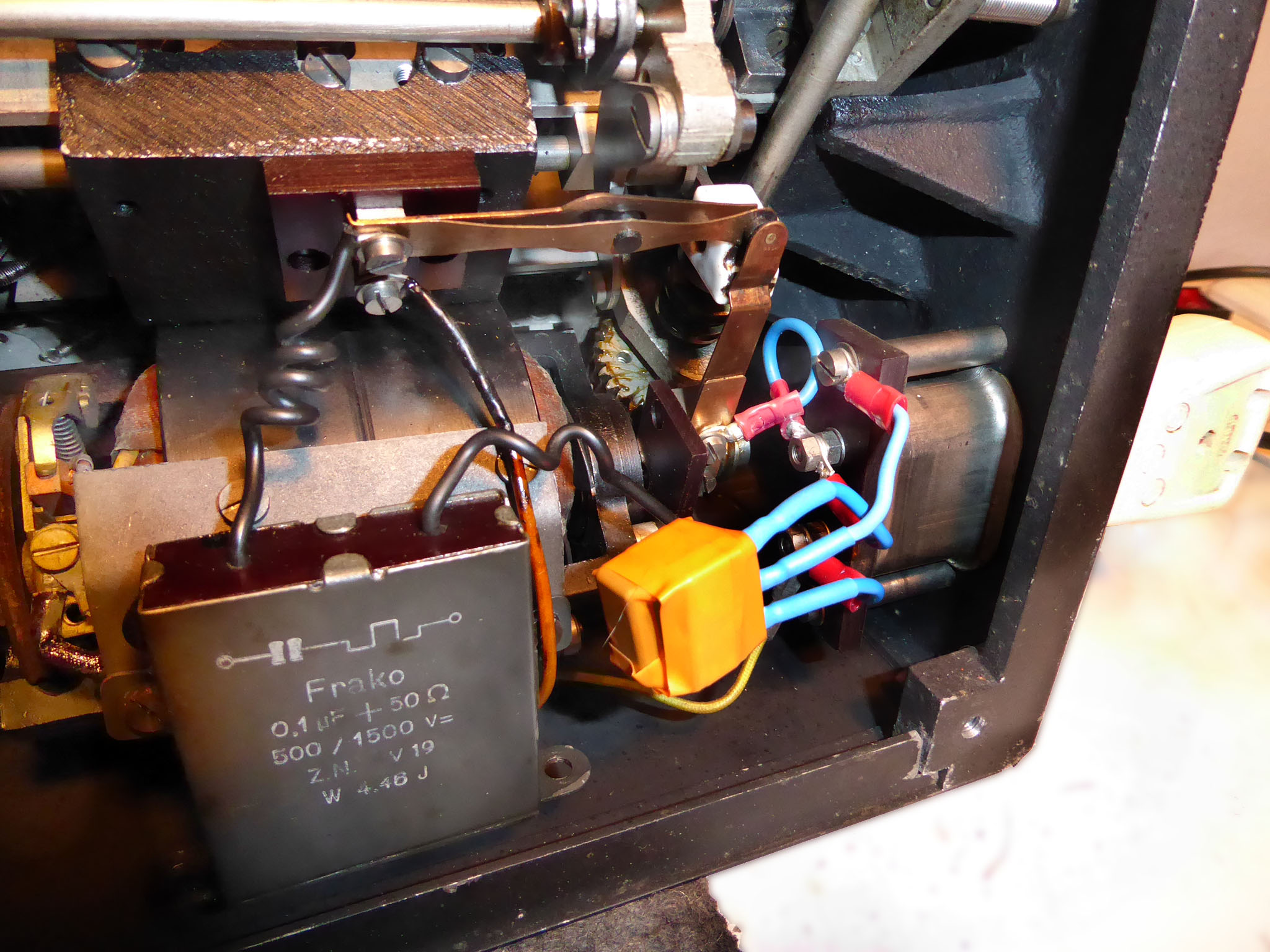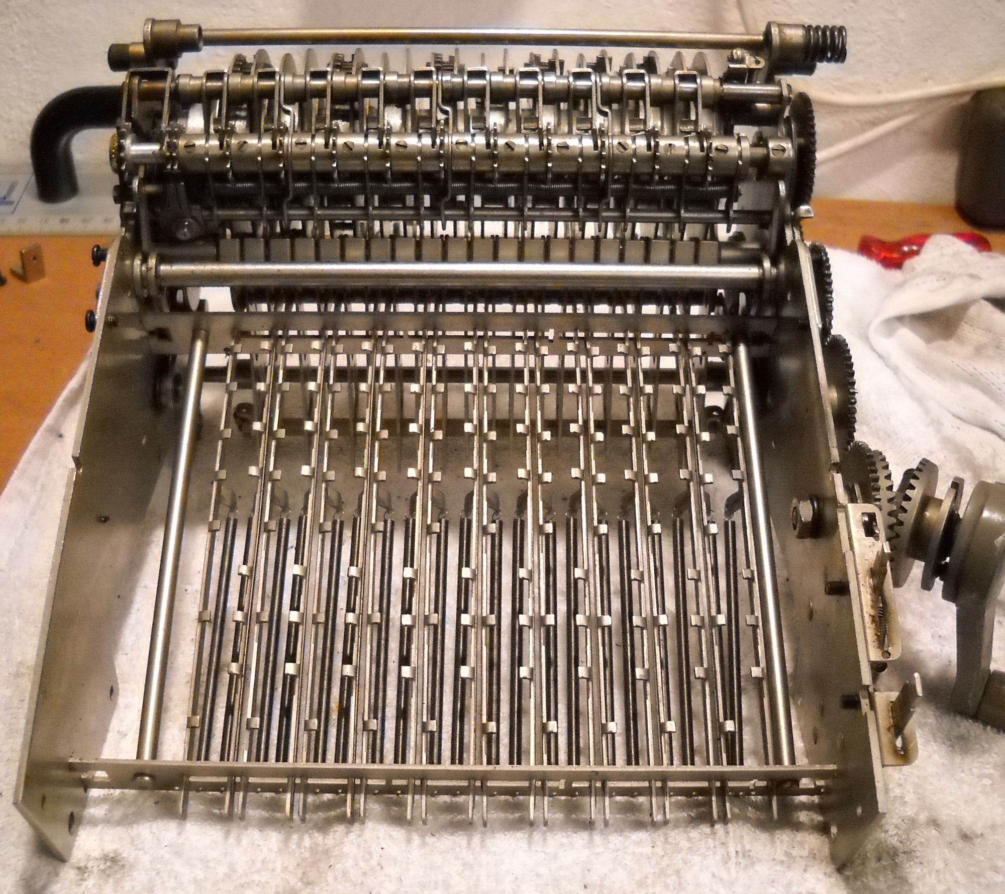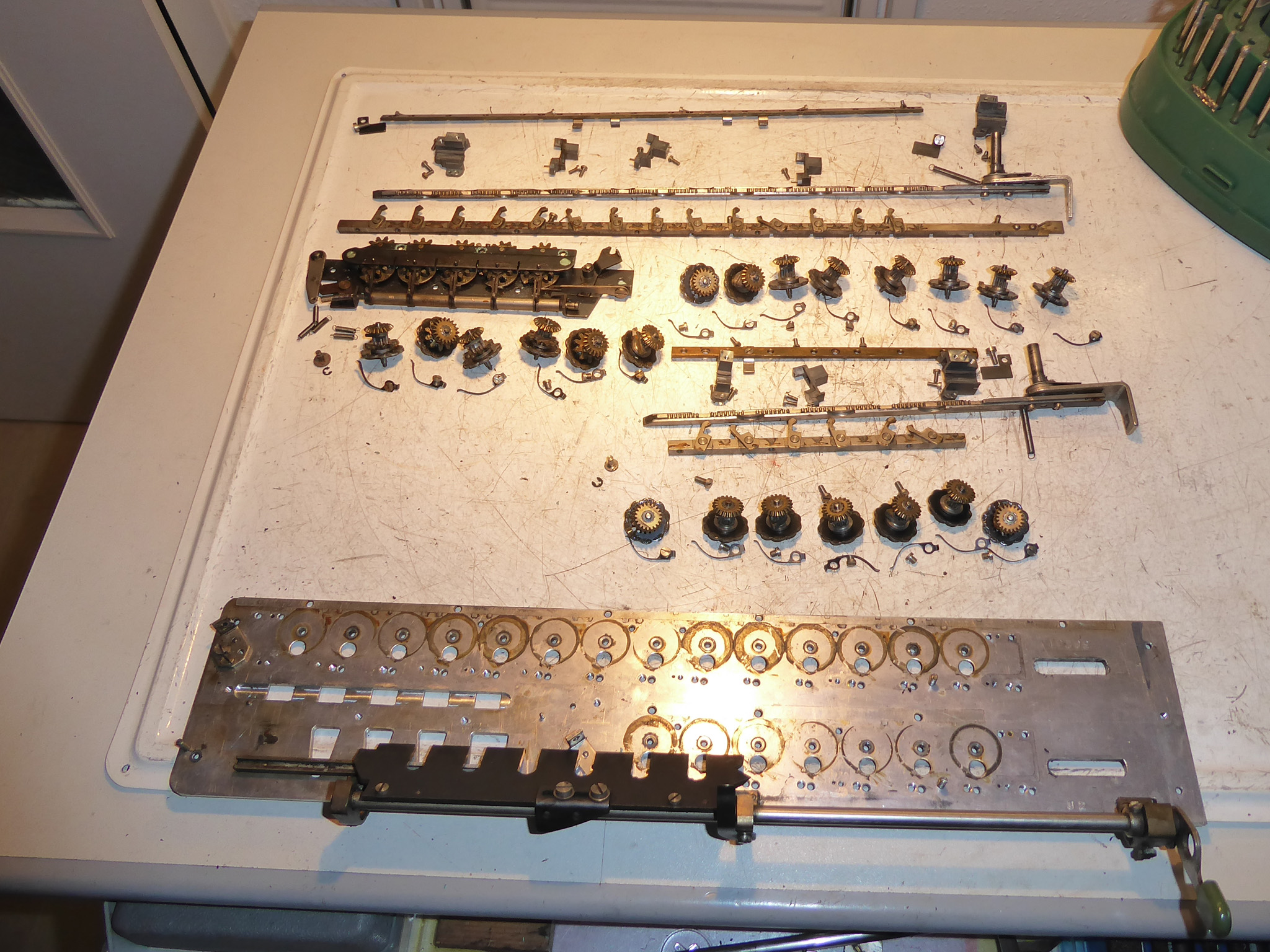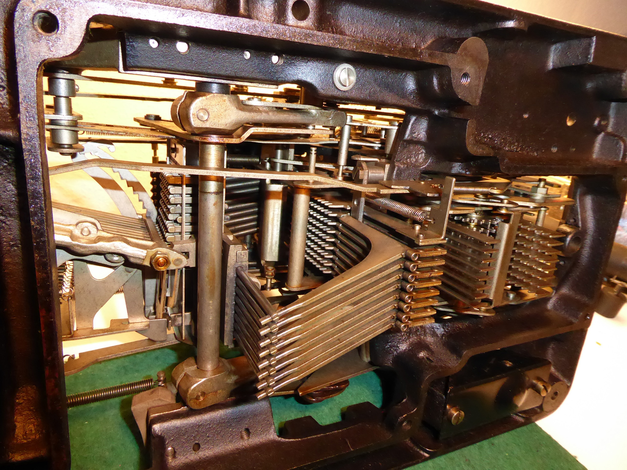Feder der RW-Löschung eingehängt, defekte Rückdrehsperre neu gesplintet, Ziffern im ZW neu eingelegt, unpassende Schraube der ZW-Löschkurbel ersetzt, Stifte der Kommastecker nachgearbeitet, vergraute Pappe unter dem Glas ersetzt. Im Holzkasten, mit Schlüssel und vier Kommasteckern. Französische Anleitung im Netz gefunden. |