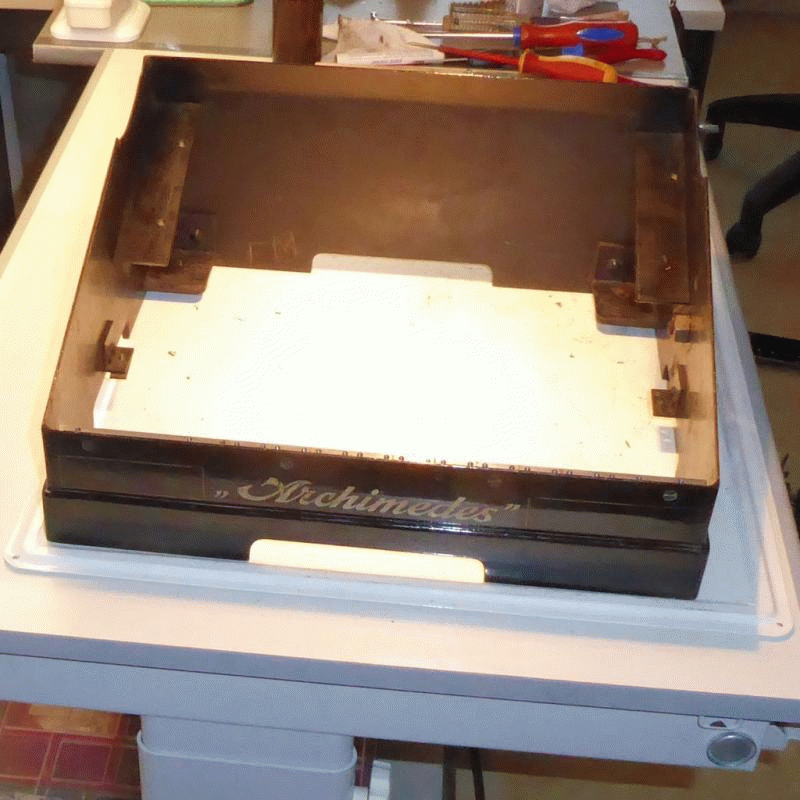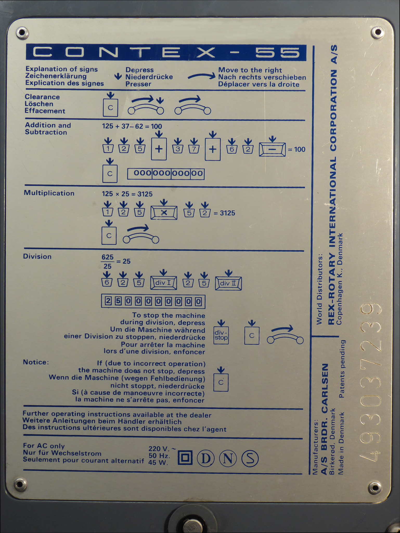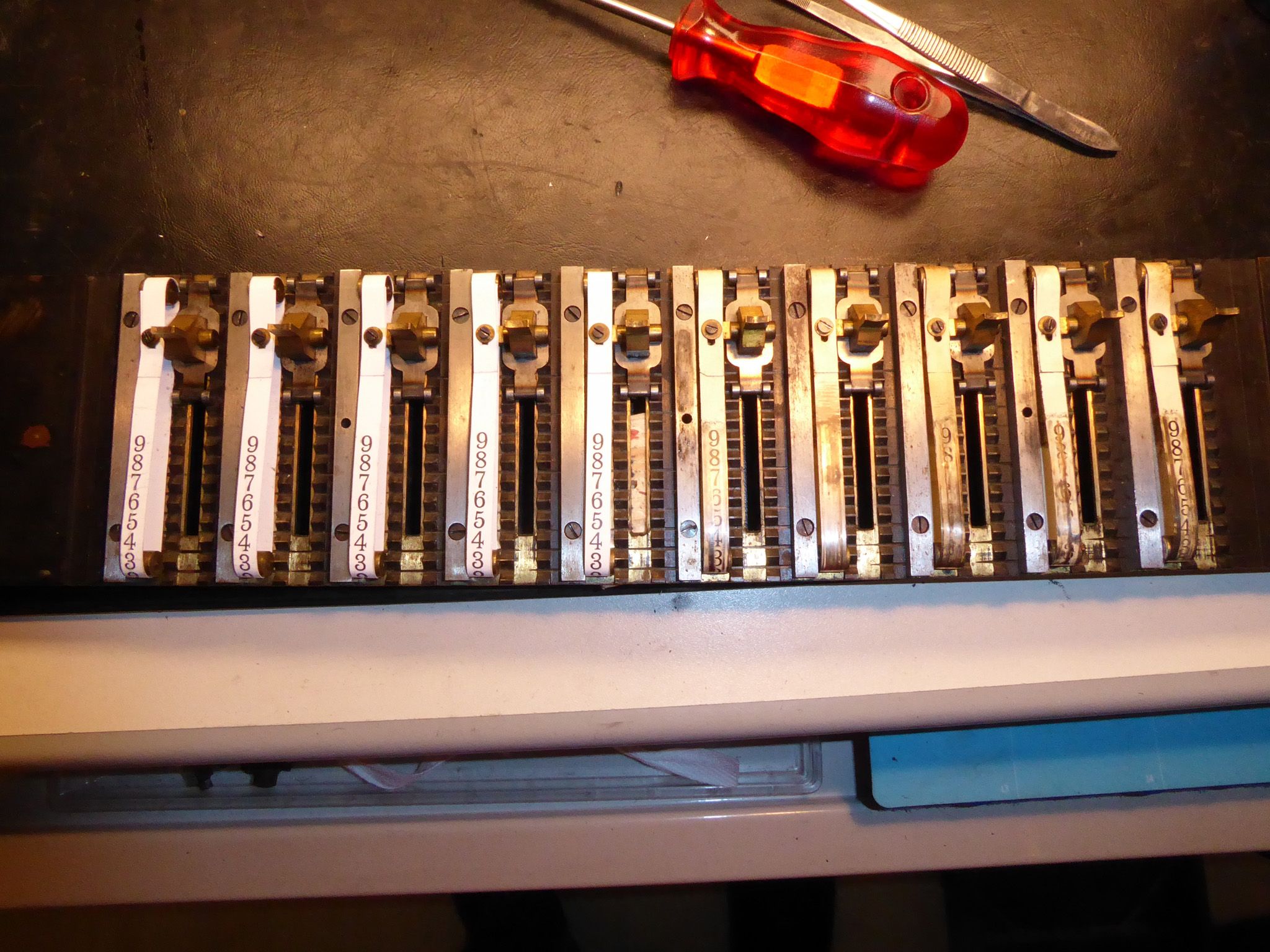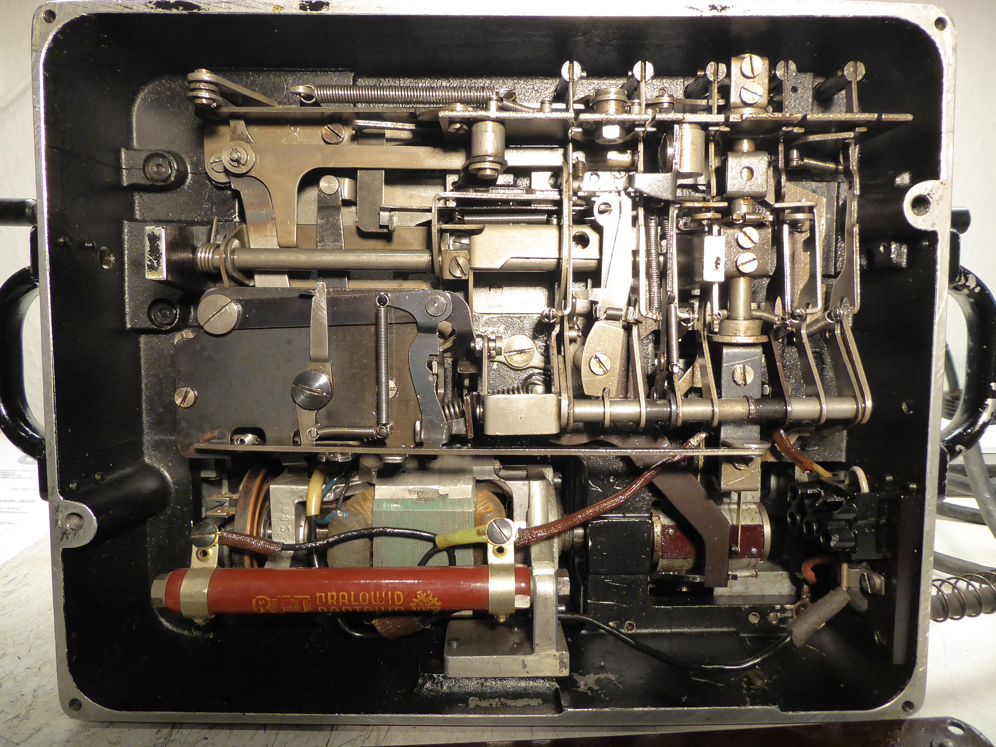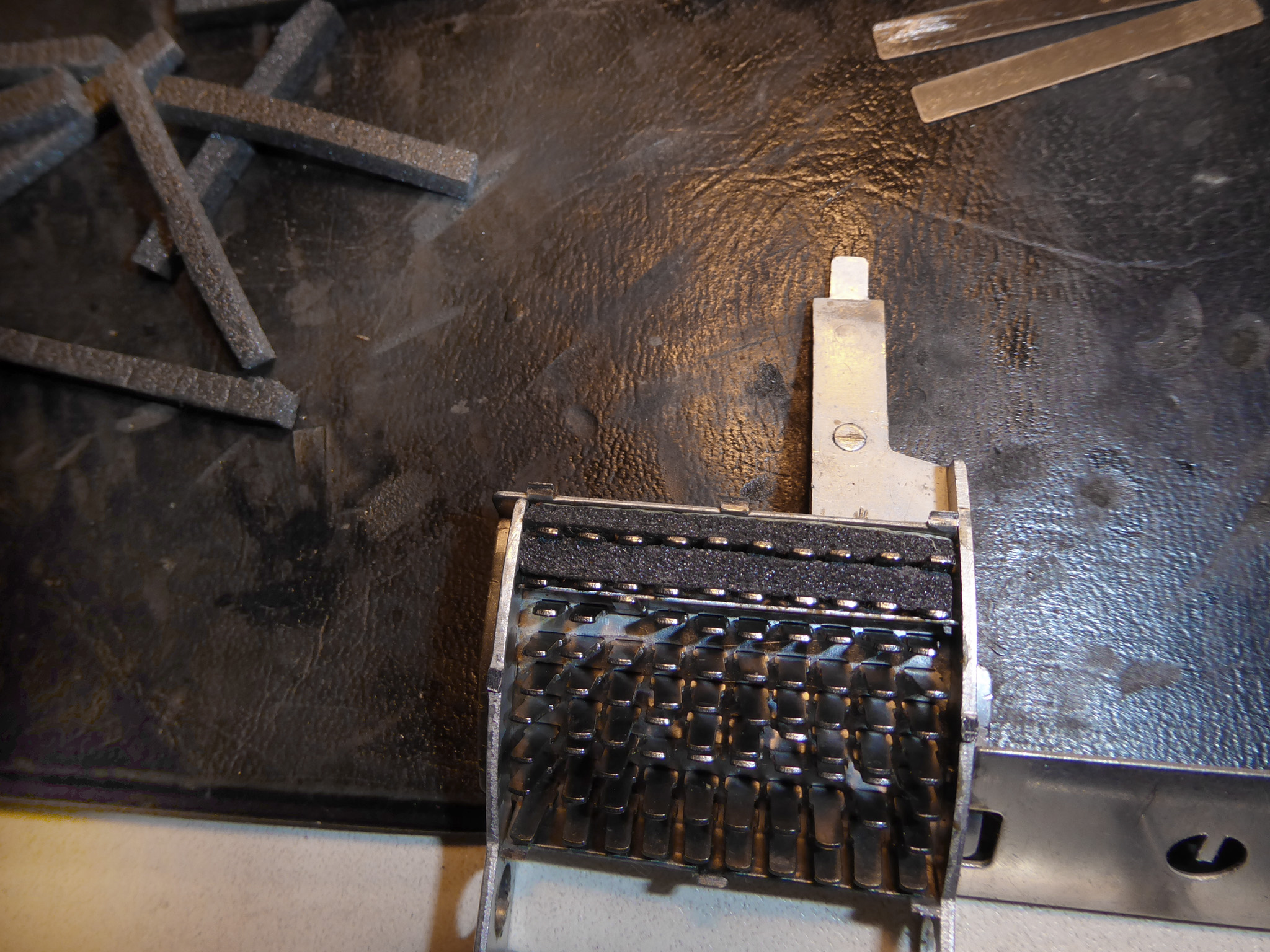 Feder der RW-Löschung eingehängt, defekte Rückdrehsperre neu gesplintet, Ziffern im ZW neu eingelegt, unpassende Schraube der ZW-Löschkurbel ersetzt, Stifte der Kommastecker nachgearbeitet, vergraute Pappe unter dem Glas ersetzt. Im Holzkasten, mit Schlüssel und vier Kommasteckern. Französische Anleitung im Netz gefunden. |