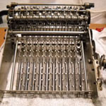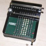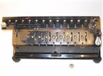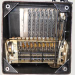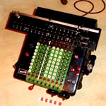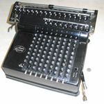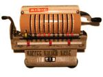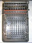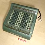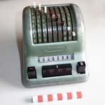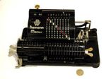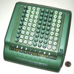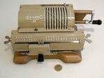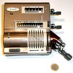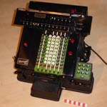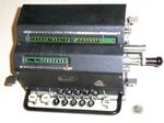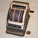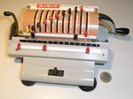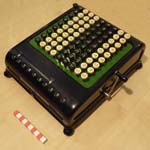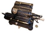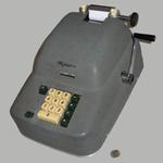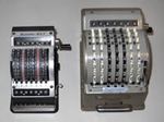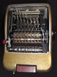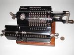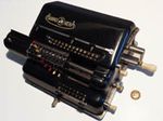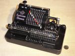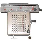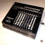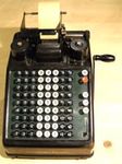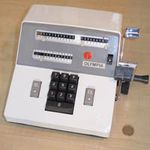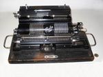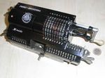Was gehört zu dieser Gruppe?Diese Maschinen sind hier analog zum englischen „adding machines“ benannt. Das erklärt sich aus der Entwicklung, an deren Anfang Maschinen standen, die wirklich nur addieren konnten (meist über eine Mechanik mit Zahnstangen/-segmenten). Vor allem im kaufmännischen Bereich waren solche Maschinen sehr gefragt. mehr zu den „key-driven adding machines“ (Comptometer-Typ)Eine Sonderstellung nehmen die Geräte ein, bei denen schon der Tastendruck zum Antreiben der Mechanik ausreicht. Diese Gruppe stellt bis heute die schnellsten Addiergeräte, denn wenn ein geübter Bediener darauf addiert hält auch mit Taschenrechner niemand mit. Auch für die anderen Grundrechenarten gab es besondere und teils sehr schnelle Verfahren, die man in speziellen Kursen erlernen konnte. Durch das intensive Training und die Verankerung dieser Verfahren im Unbewußten (was das hohe Tempo erst ermöglichte) waren die Teilnehmer solcher Kurse begehrte Mitarbeiter. |