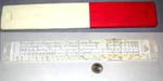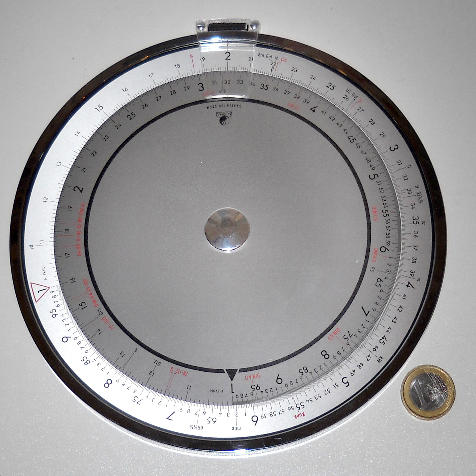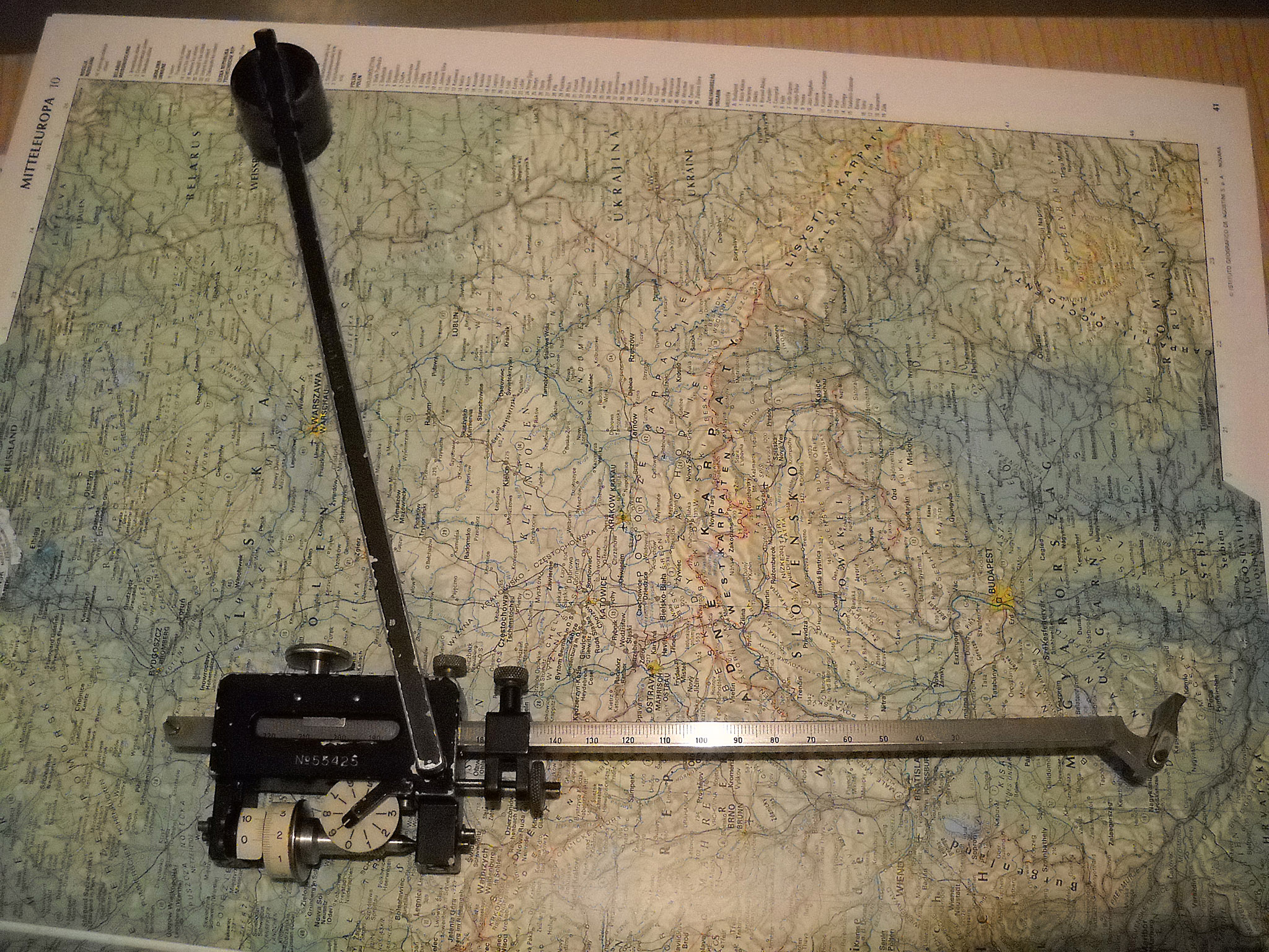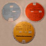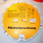 Neben Hilfsmitteln zum allgemeinen Rechnen gab und gibt es auch viele mathematische Instrumente für besondere rechnerische Anwendungen. Ein Beispiel ist das Planimeter zur Flächenberechnung z.B. in Landkarten, in technischen Zeichnungen oder auch in der Lederindustrie. Es gibt zahlreiche verschiedene Arten, eine davon ist dieses 1854 von Jakob Amsler erfundene Polarplanimeter. Man stellt die Armlänge auf den Kartenmaßstab ein, setzt die Spitze auf einen beliebigen Punkt am Rand der zu messenden Fläche, liest den Wert der Skala ab (oder stellt auf Null), führt die Spitze einmal möglichst exakt im Uhrzeigersinn um diesen Rand und liest den Wert wieder ab. Mit einer kleinen Korrekturrechnung (die Angaben dazu stehen im Etui des Geräts) hat man schnell die Fläche ermittelt (hier im Bild die des Plattensees, übrigens 594 km²). Die Genauigkeit des Gerätes ist bei größeren Flächen meist höher als die der Zeichnung. |