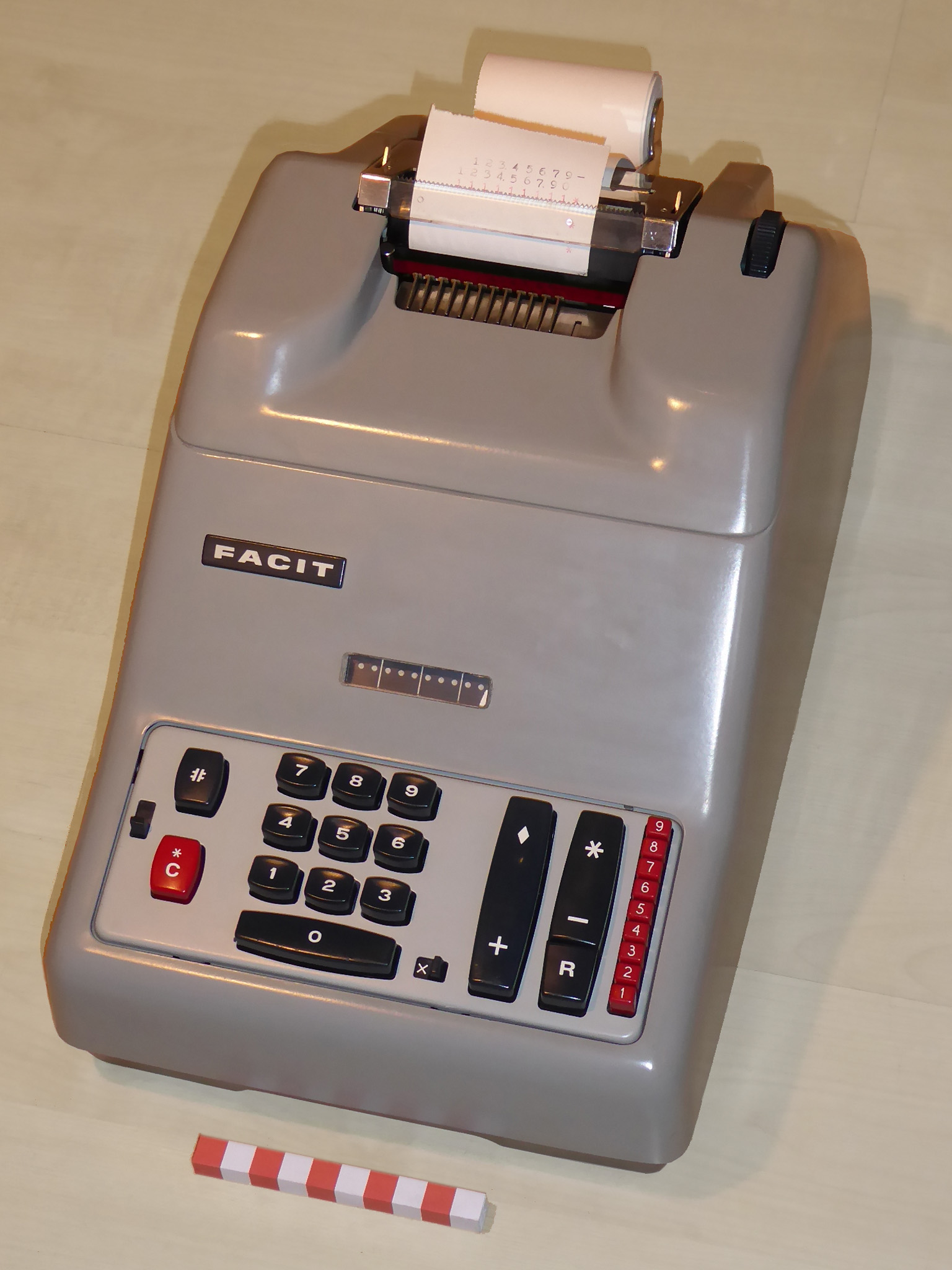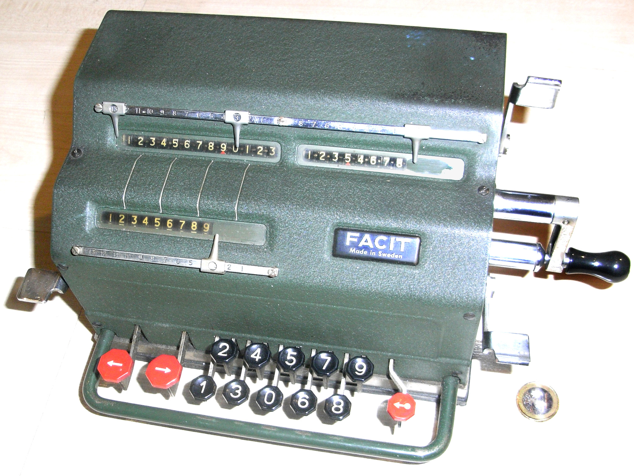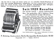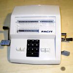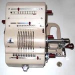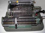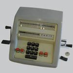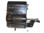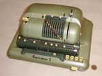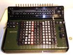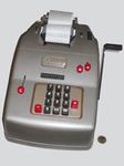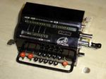 Was gehört zu dieser Gruppe?Die Idee eines Rades mit variabler Zähnezahl hatte schon Leibniz; Poleni, Braun, Roth und viel später Baldwin konstruierten entsprechende Maschinen. Doch erst W.T.Odhner brachte um 1870 herum das Sprossenrad mit neun ein- und ausfahrbaren „Sprossen“ zur Produktionsreife. Wie das funktioniert erklärt dieses Youtube-Video. Geräte mit TasteneingabeUm die mühselige Eingabe mit den kleinen Stellschieberchen zu erleichtern wollte man auch Sprossenrad-Maschinen mit Tasten-Eingabe ausstatten. Karl Rudin gelang kurz nach 1930 die Konstruktion einer zuverlässigen Mechnik. Sein System wurde zuerst bei Facit gebaut und später häufig kopiert. Es verbesserte die Eignung dieser Maschinen für Addition und Subtraktion deutlich, nur die automatische Eingabelöschung fehlte fast immer. |