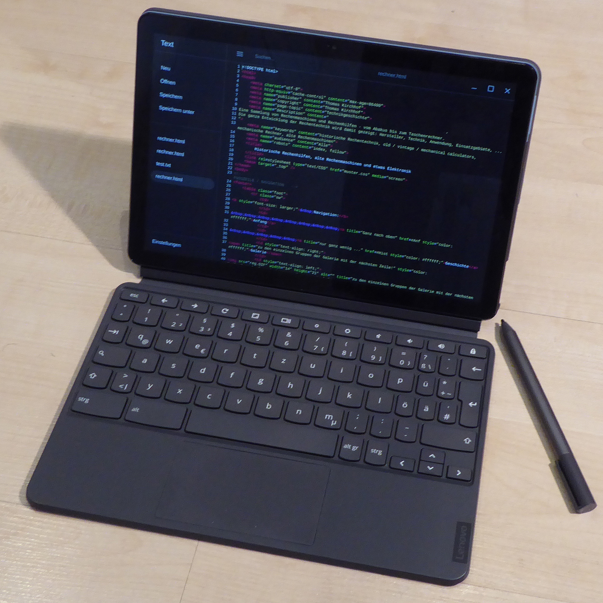 Der modernste (aber nicht jüngste) Computer im Haus ist ganz was anderes: Ein „Chromebook“, eine Kreuzung aus Tablet und Notebook mit dem Android-Ableger Chrome OS. Anschaffungsgrund war die mangelnde Eignung aller anderen Geräte für Videokonferenzen: Die derzeitige Arbeitmaschine gab es damals noch nicht. |