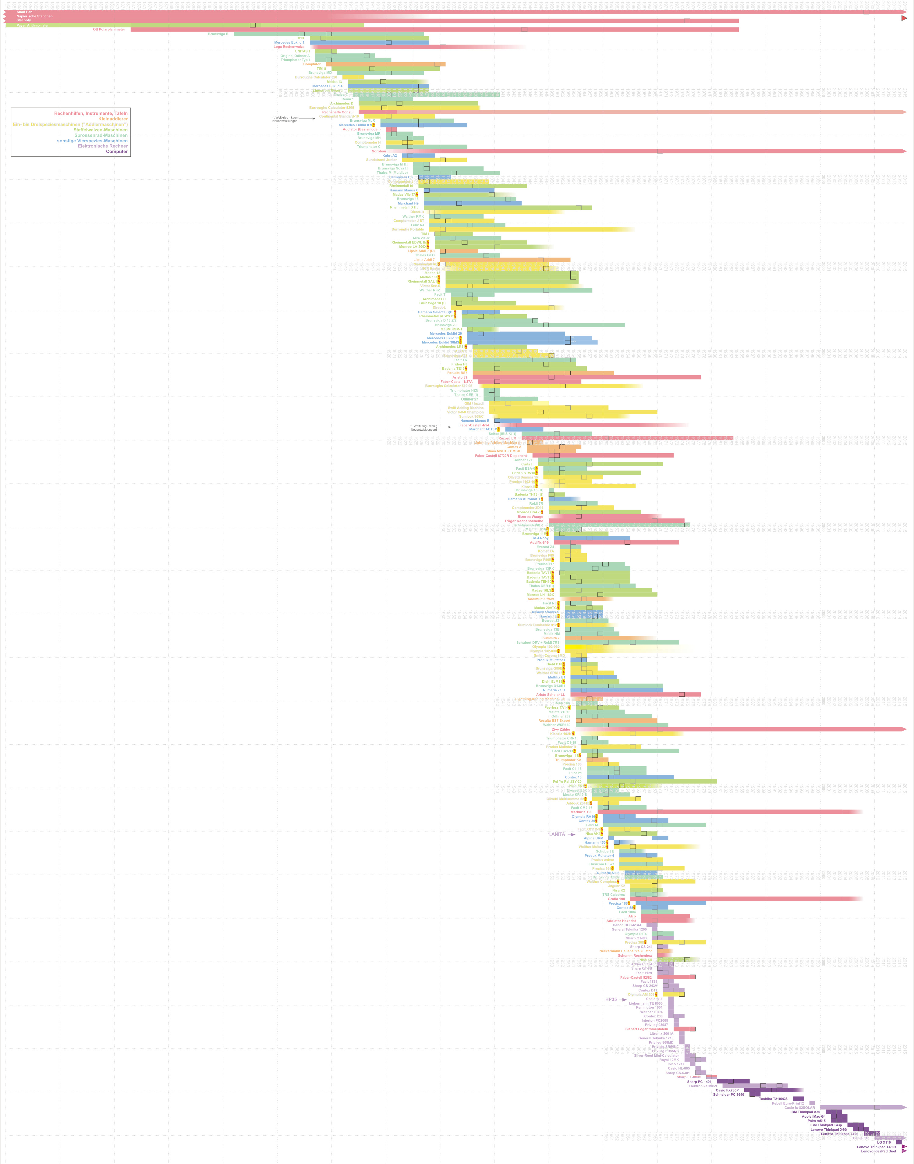Viele Rechenmaschinen wurden sowohl technisch als auch im Design ständig weiter entwickelt. Da ist es oft nicht klar, was man als Markteinführung bzw. Produktionsbeginn nehmen soll: Ist z.B. die Brunsviga B mit der neuen Eingabelöschung ein neues oder doch nur ein verbessertes Modell? Macht das neue Gehäuse eine Monroe LN 160 zu einer ganz neuen Maschine? Sind die Vor- und Nachkriegsmodelle der Thales CER das Gleiche? |