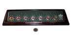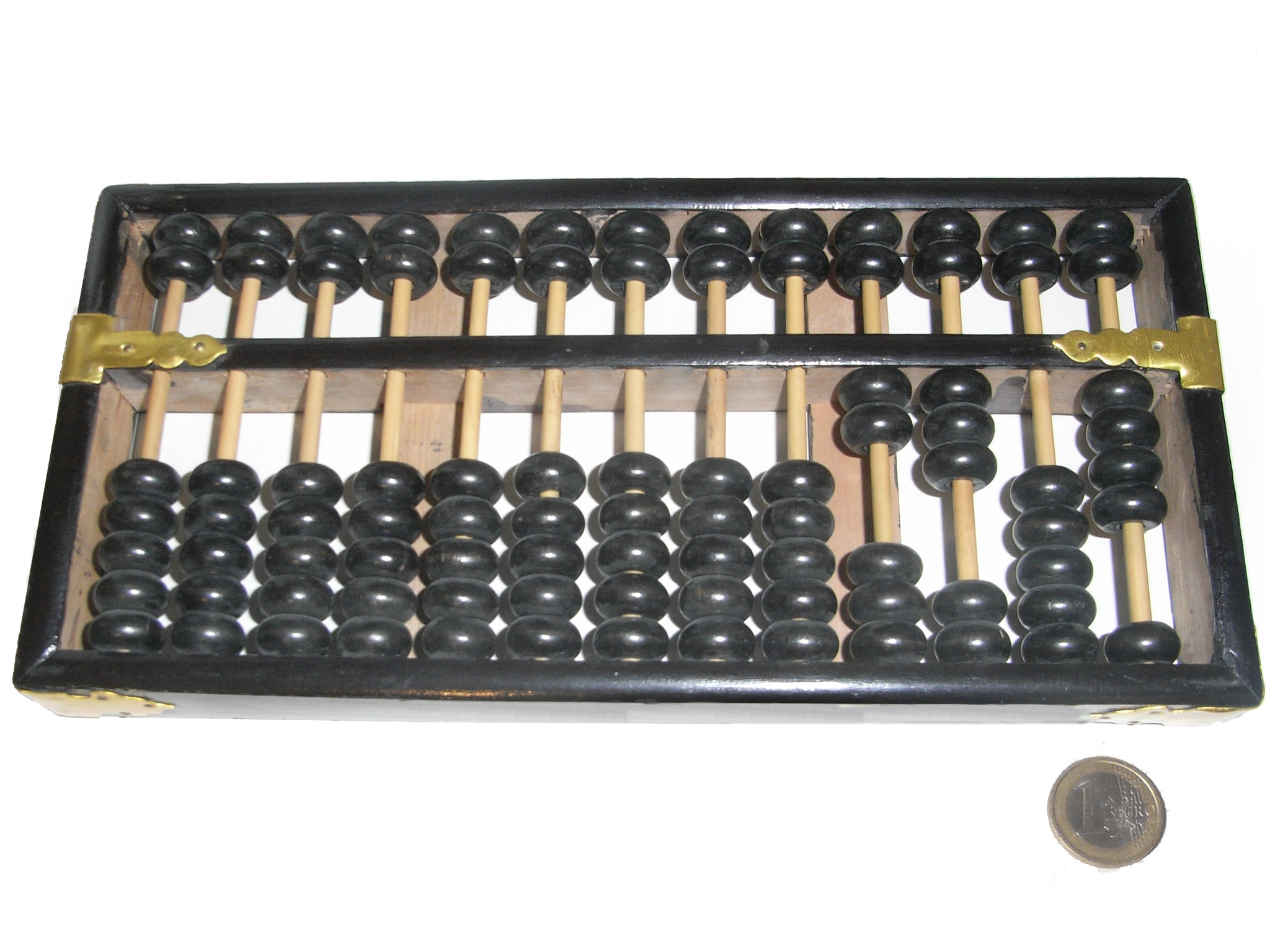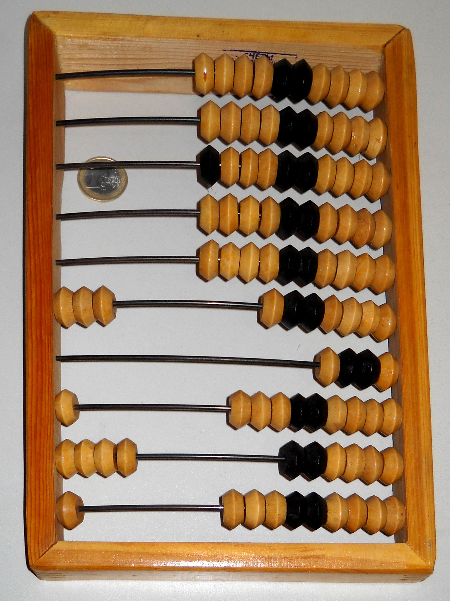 Die russische Version des Abakus entwickelte sich evtl. aus dem Suan Pan - vielleicht aber auch direkt aus dem Rechenbrett. Die erste Erwähnung in der Literatur fand kurz vor 1700 statt. Ganz typisch ist eine Reihe mit nur vier Kugeln. Die steht entweder z.B. für Viertel-Rubel (1 Kugel = 25 Kopeken) oder gilt einfach nur als Kommastelle und wird dann nicht zum Rechnen benutzt. Der Stschoty wird mit der kleinsten Stelle zum Bediener hin bedient, quer zur bei den anderen Varianten üblichen Ausrichtung. |