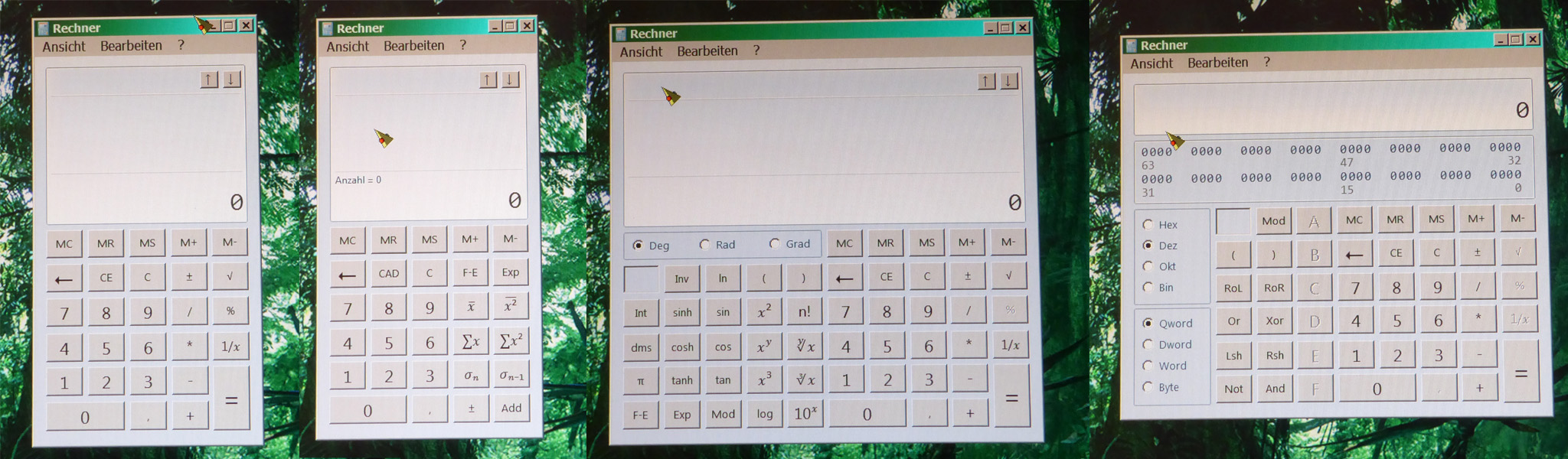 Die vier Rechnermodi in Windows 7: einfach - Statistik- wissenschaftlich - Programmierer. arcsin(arccos(arctan(tan(cos(sin(9)))))) ergibt - wie schon in Windows XP - genau 9. |
