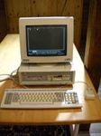 2/3: Einige Gebrauchsspuren; funktioniert so weit, hat jedoch ebenfalls keinen Akku mehr und ein Diskettenlaufwerk mit ausgeleiertem Antriebsriemen. Ein Sinuston stört bei hoher Taktrate... Mit Handbuch und Tasche. |